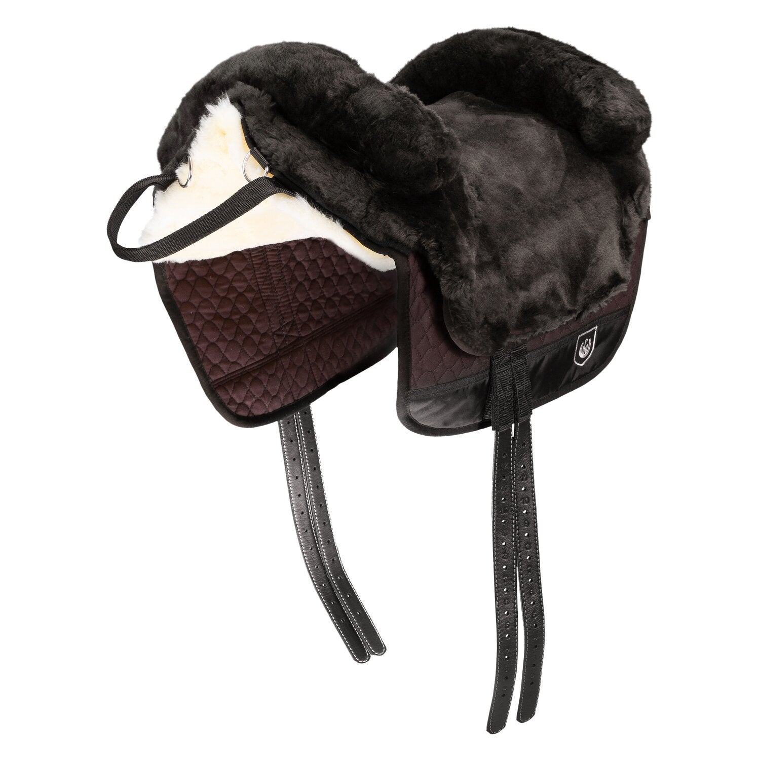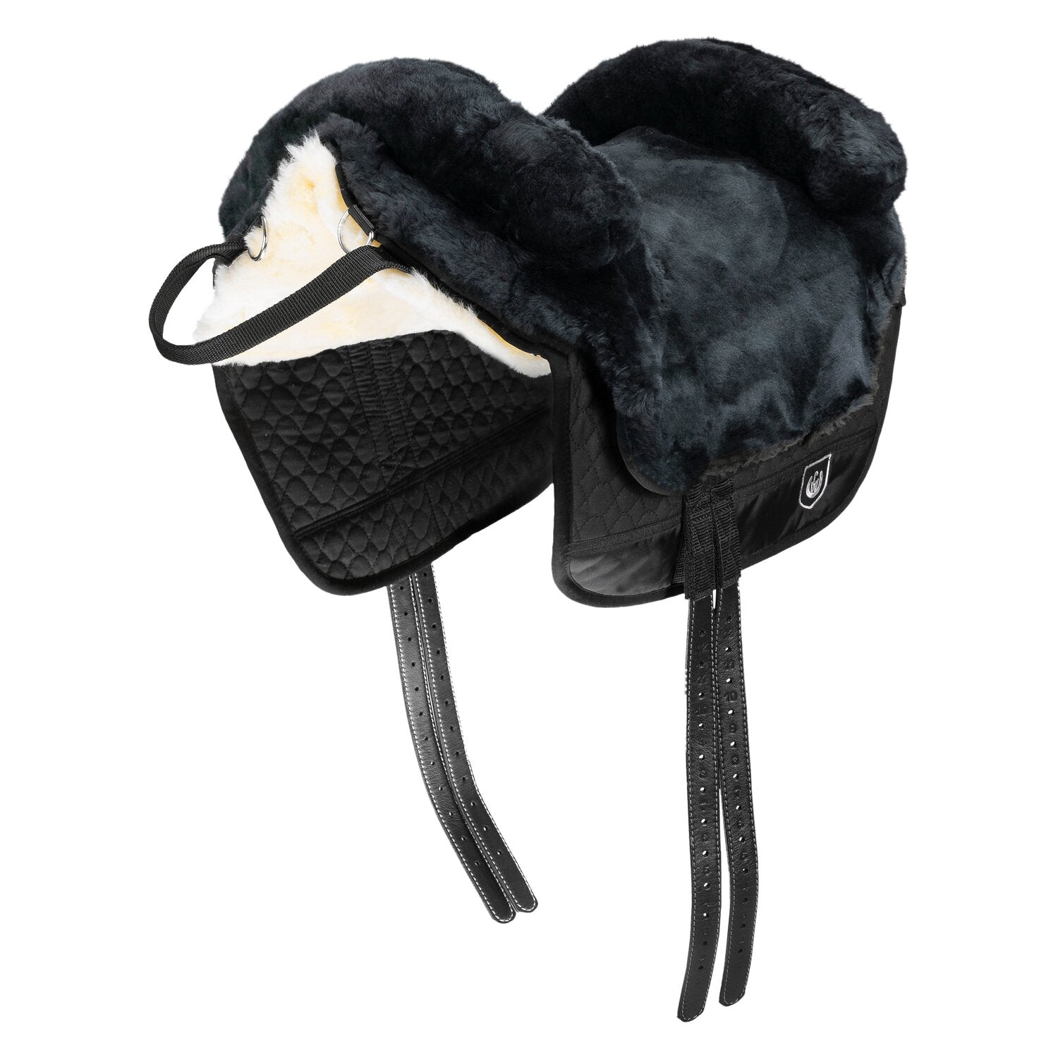 Das Fellsattelmodell von CHRIST im spanischen Stil. Die Sitzfläche ist komplett aus Lammfell mit einer Wollhöhe von ca. 30 mm gefertigt. Die Unterseite dagegen ist nur im Rückenbereich aus Lammfell, während der Rest aus Spezial Satteldeckenstoff gefertigt ist. Die eingearbeiteten Galerien vorne und hinten sorgen für einen sicheren Halt. Mit herausnehmbaren Polster rechts und links vom Wirbelkanal, die den Sitzkomfort erhöhen und den Pferderücken schonen. Unter dem durch einen Reißverschluss abnehmbaren Sitzfell kann ein spezielles Kopfeisen in eine Tasche eingeschoben werden. Es besteht die Möglichkeit, Steigbügelriemen an D-Ringen, die sich unter dem Sitzfell befinden, zu befestigen. Auflagelänge: ca. 60 cm.