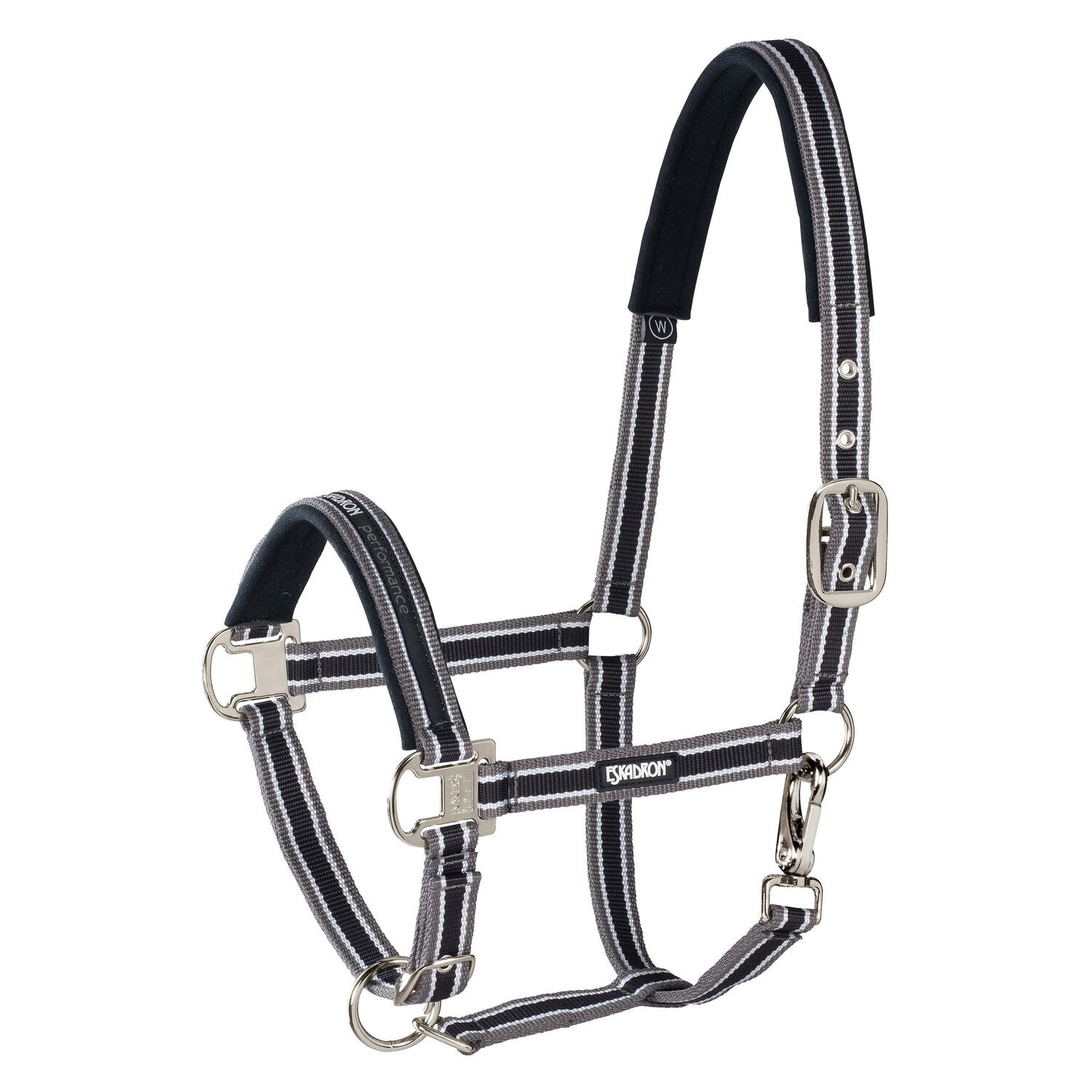 Das Qualitätshalfter Pin Buckle aus der ESKADRON Basic Kollektion ist aus reißfestem Gurtband, das für einen angenehmen Tragekomfort mit weicher Polsterungen an Nasen- und Genickstück unterlegt ist. Zur Anpassung stehen zwei Dornschnallenverschlüsse, davon einer links und einer im Kinnbereich, zur Verfügung. Der dezente Nasenbandprint und die vernickelten Metallbeschläge verleihen dem Halfter seinen edlen Charme.
