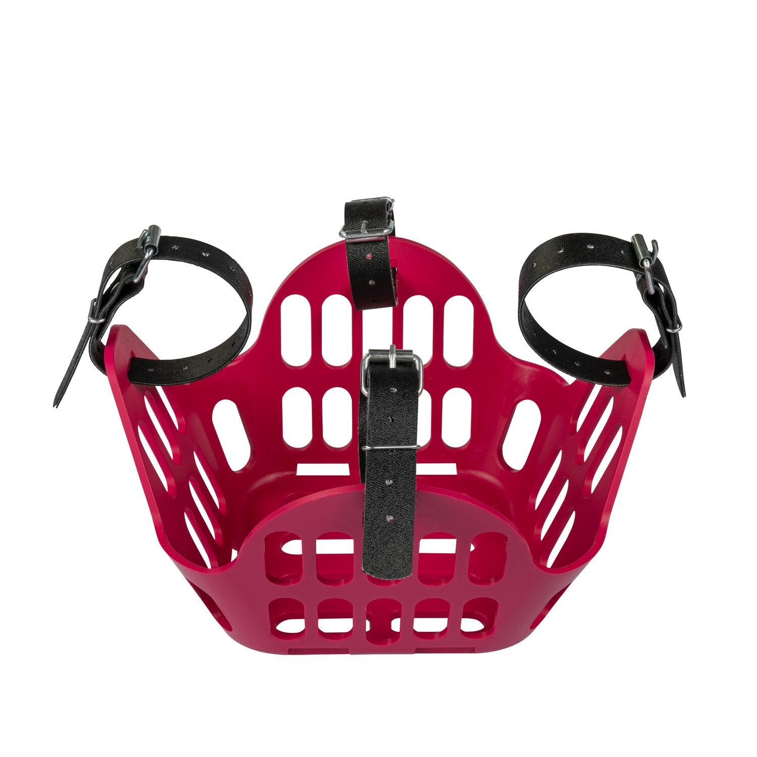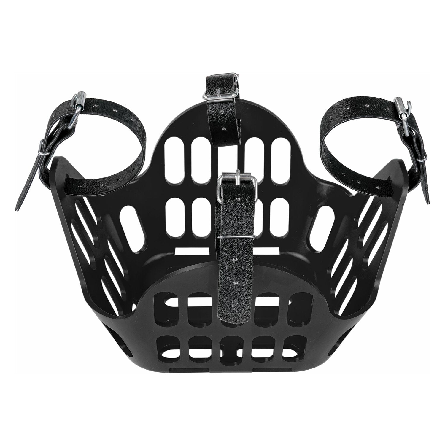 Aus stabilem Webmaterial mit Polsterung um Scheuerstellen zu vermeiden. Zur Nahrungsaufnahme ist der Maulkorbboden aus Kunststoff mit einem Loch (Ø: ca. 30 mm) im unteren Bereich ausgestattet. Zur Befestigung am Halfter dienen vier Doppel-Klettverschluss-Schlaufen. Shetty Breite unten 13 cm / oben 15cm; Höhe 11,5 cm Pony B 13,5 cm /16cm; H 12 cm VB B 14,5 cm /17,5cm ; H 12 cm WB B 15,5 cm /19 cm; H 12 cm KB B 17 cm /21 cm; H 11,5 cm