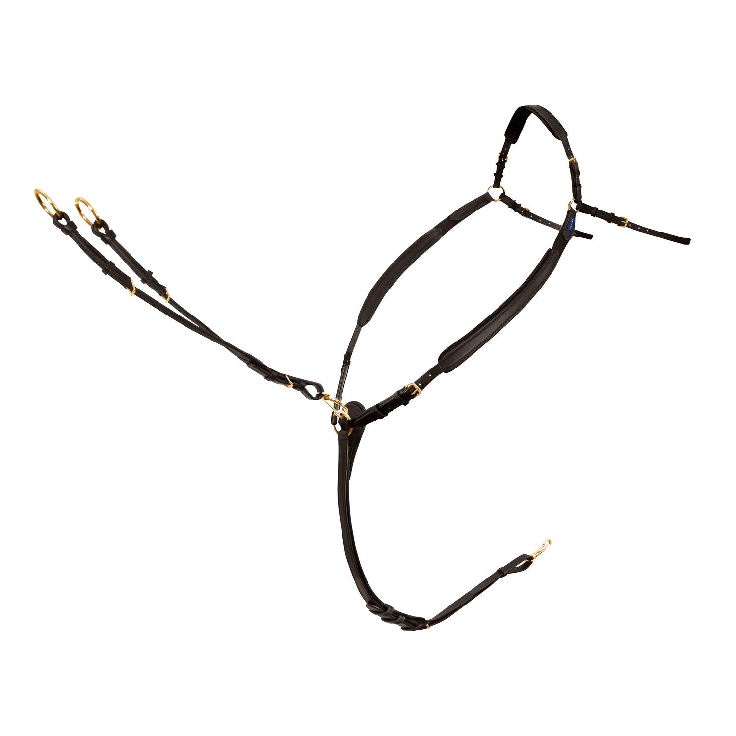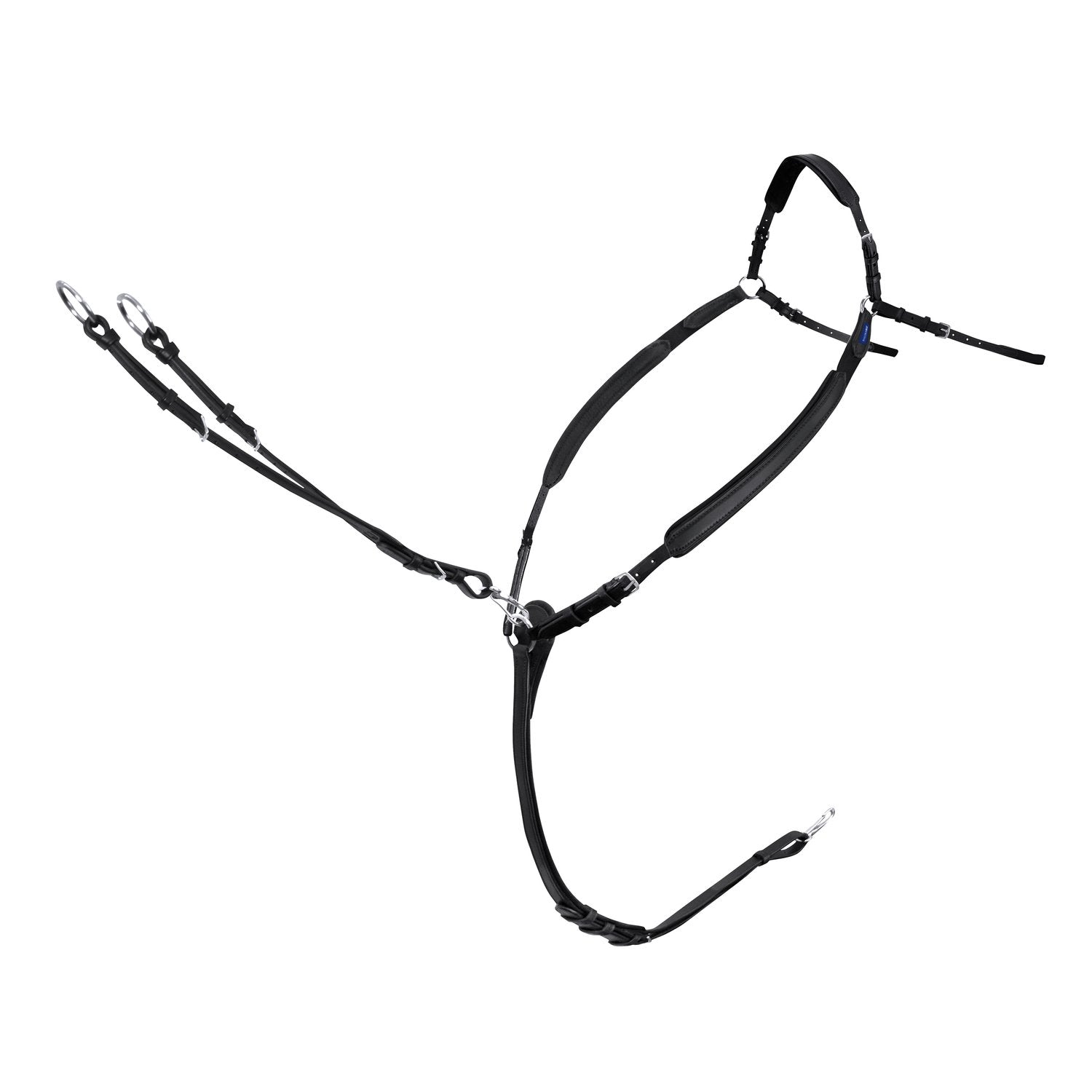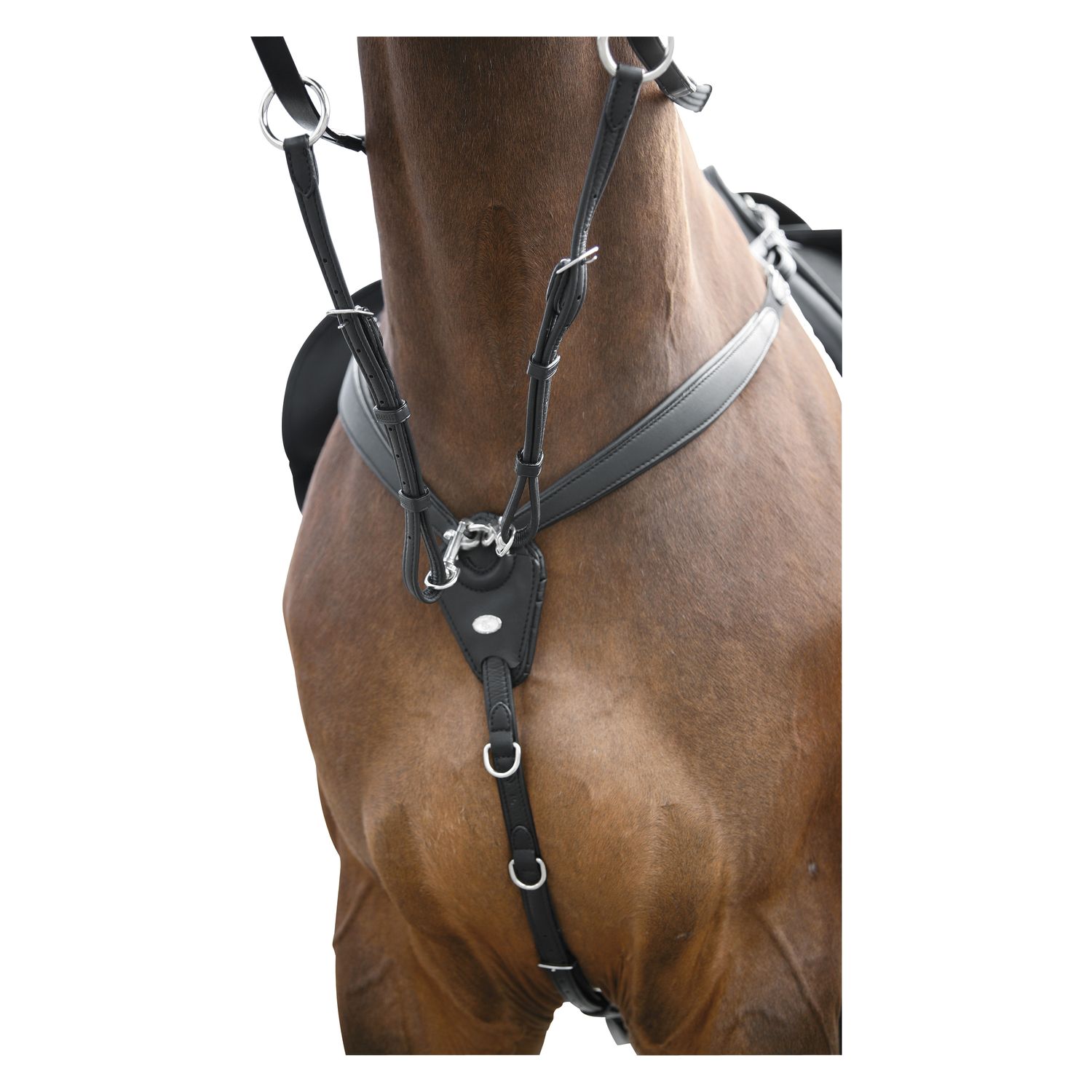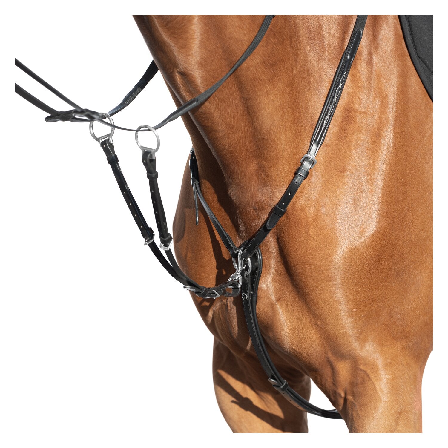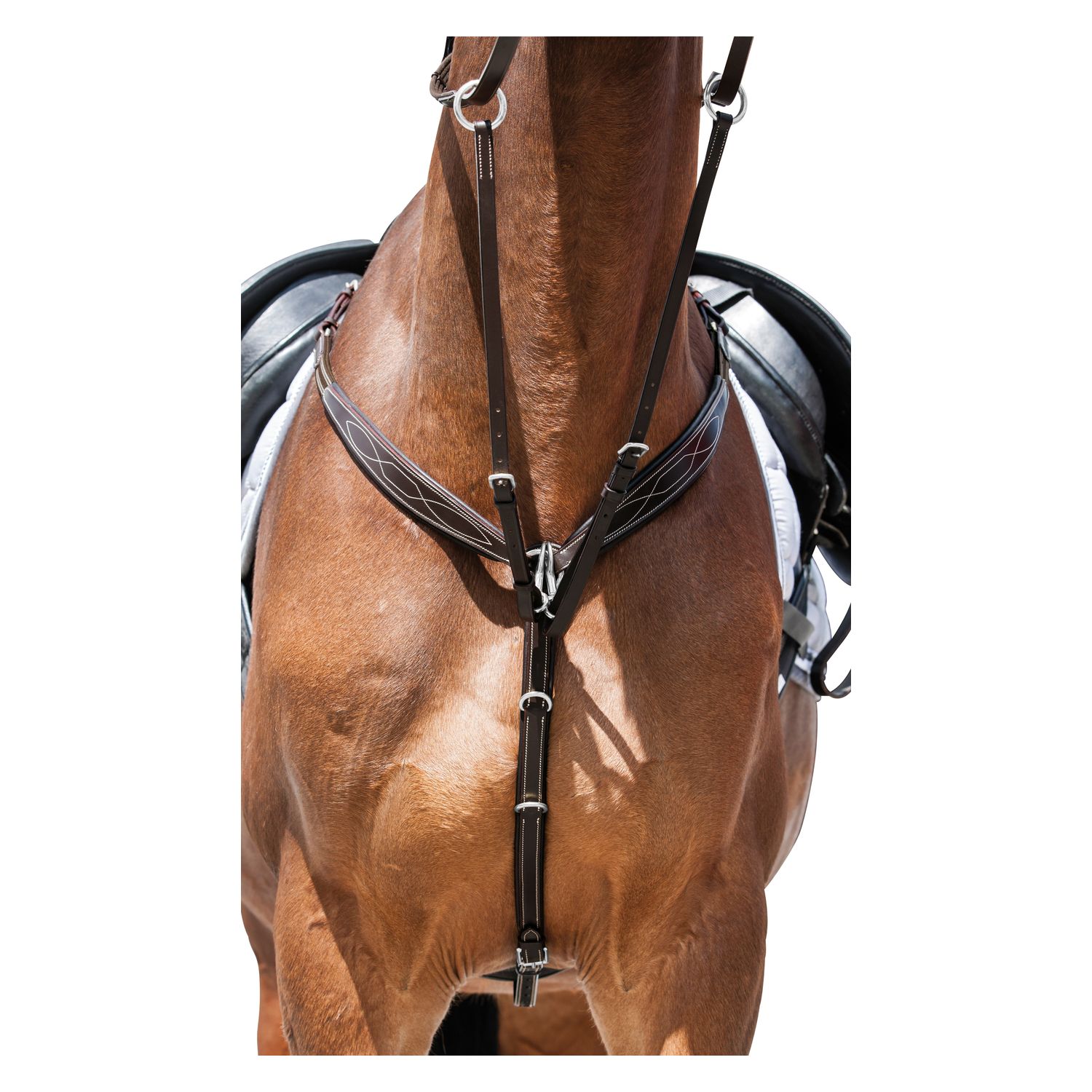 Dieses Vorderzeug von PRESTIGE kommt mit Brücke und einer Martingalgabel mit EVO-Klippsystem Ringen. Diese erlauben ein einfaches und schnelles Befestigen der Zügel, ohne diese öffnen zu müssen. Um einen optimalen Tragekomfort für das Pferd zu gewährleisten, verfügt das Vorderzeug über elastische Einsätze. Es ist konzipiert, um an den Gurtstrippen des Sattels befestigt zu werden, so dass die Stabilität verbessert und der Druck auf den Widerrist und die Schultern verringert wird. Mit klassischen, verstellbaren Schnallen.