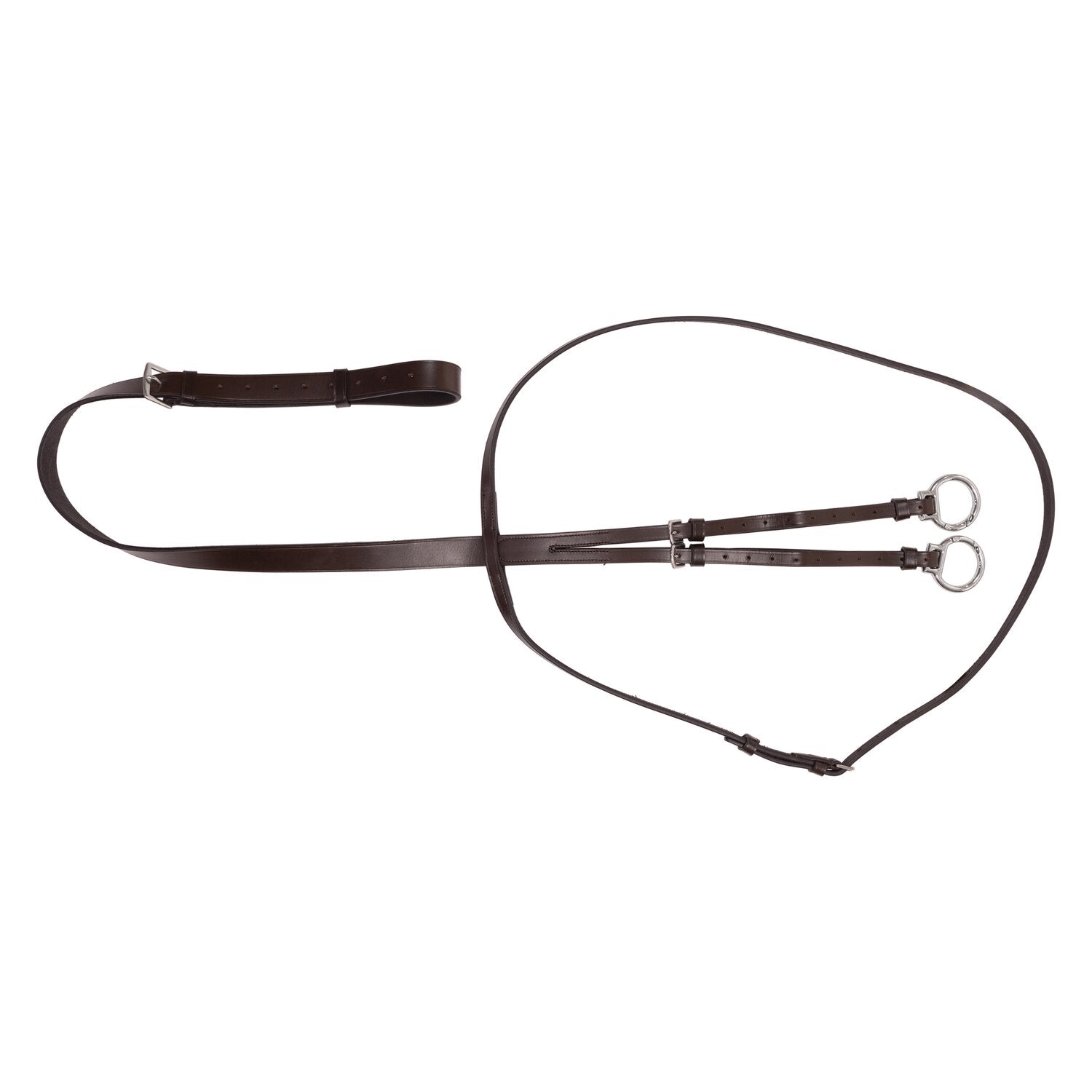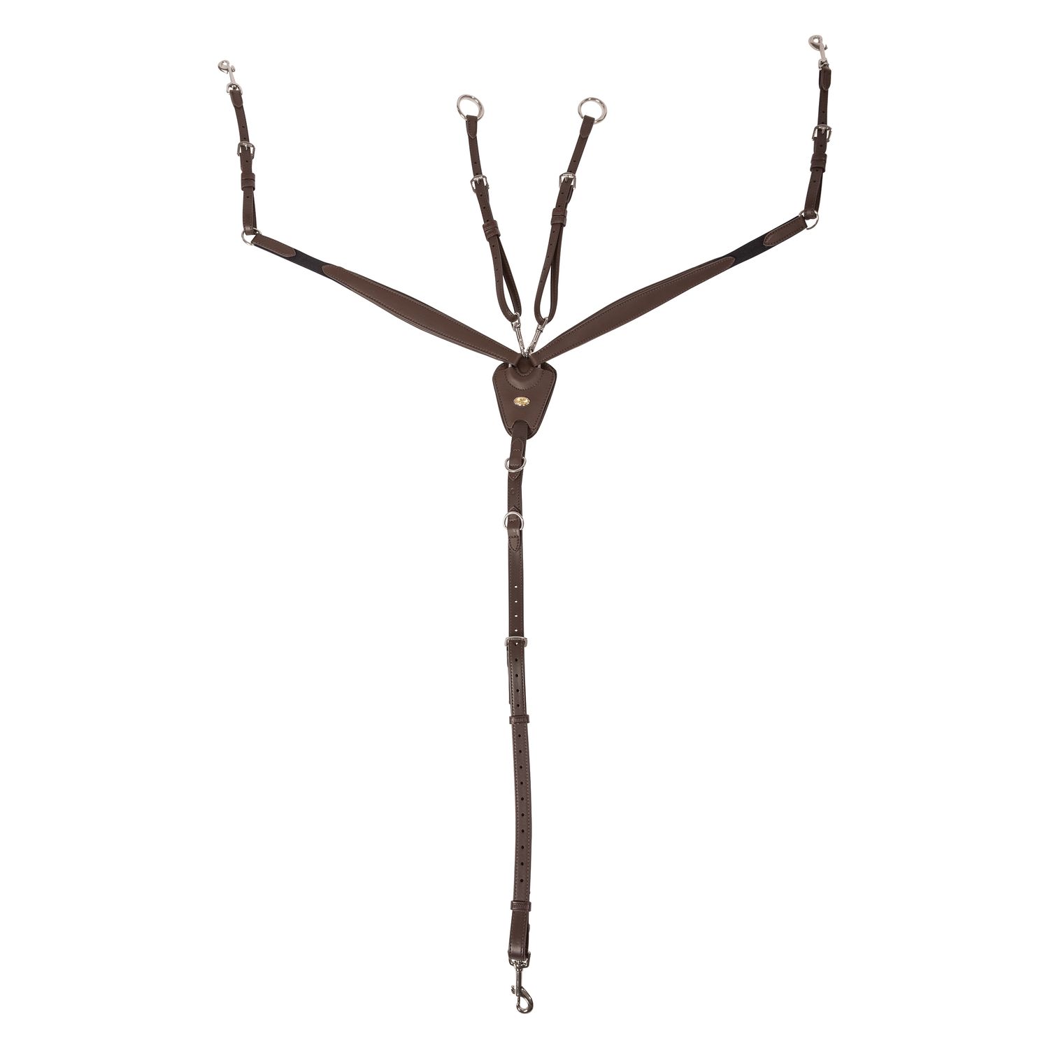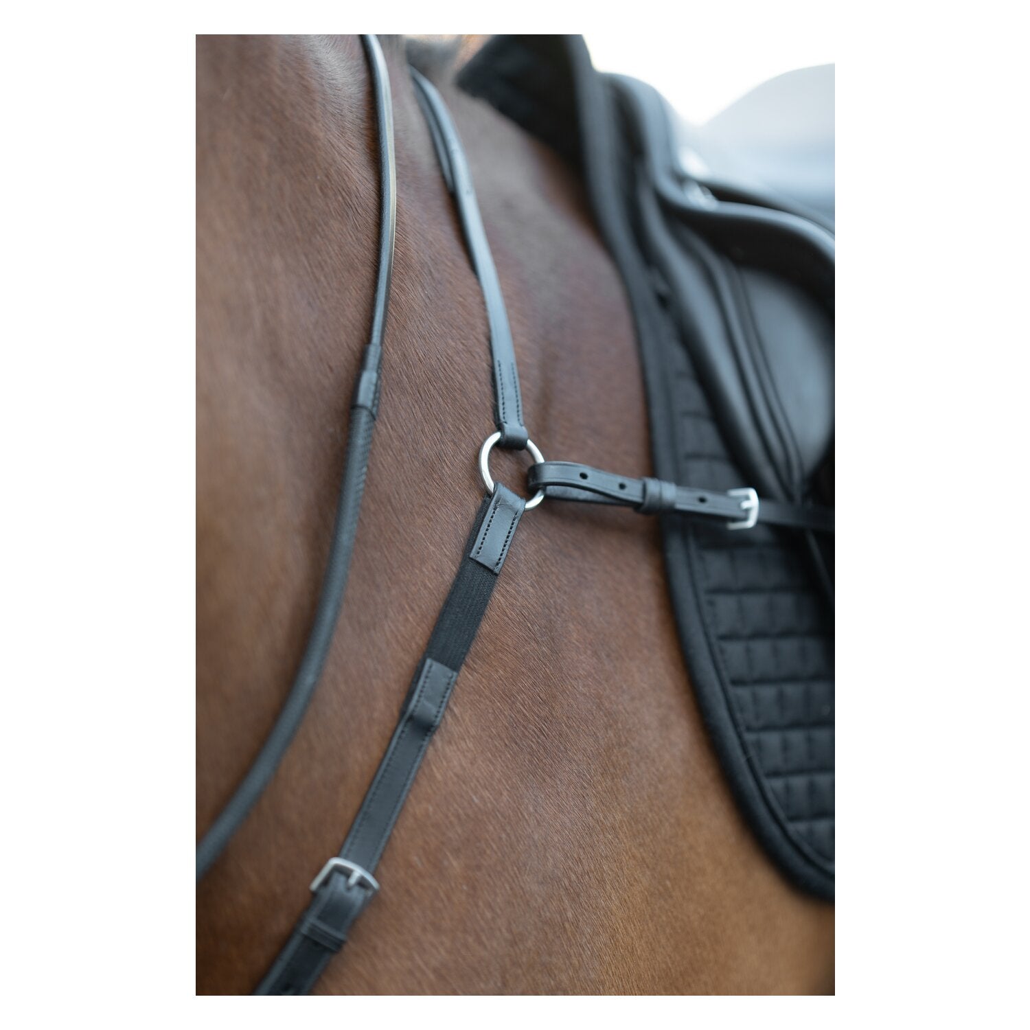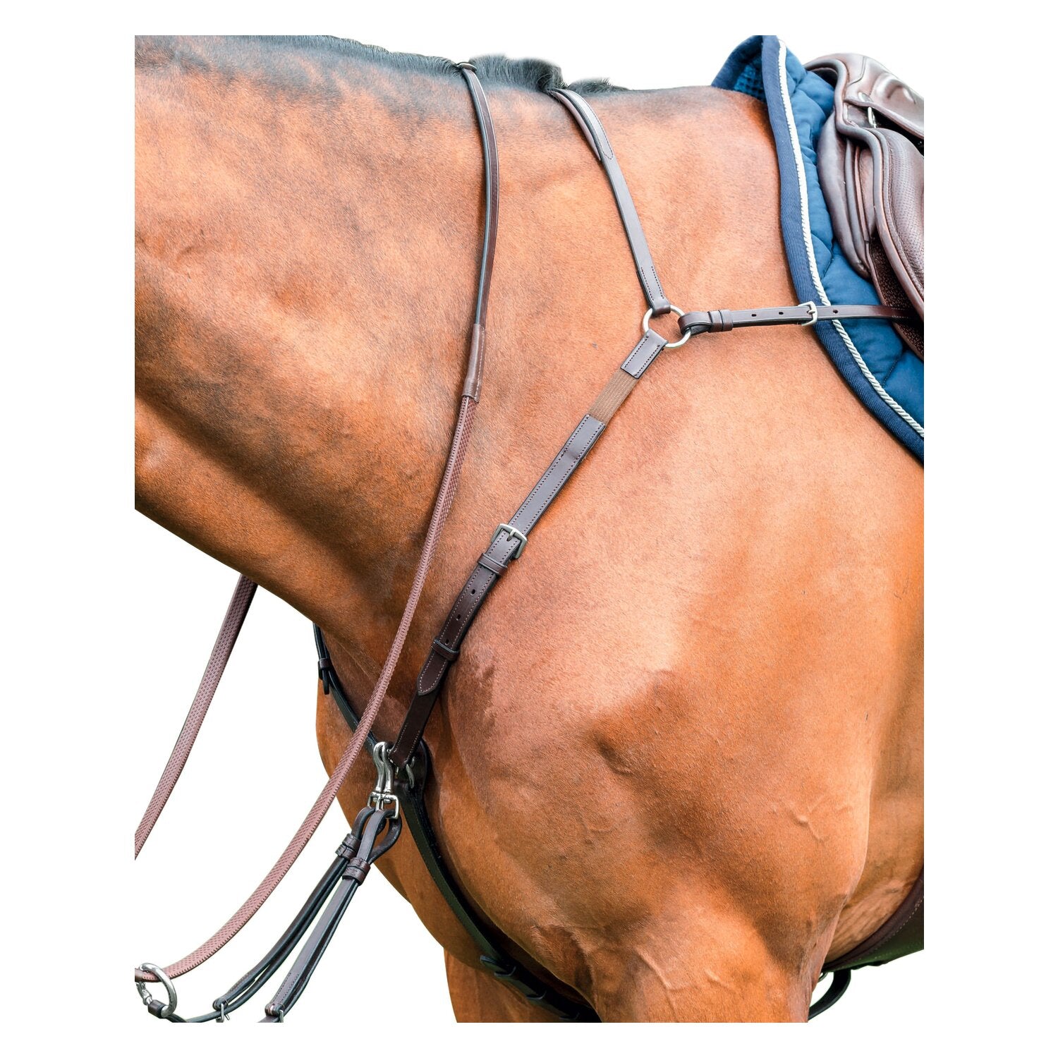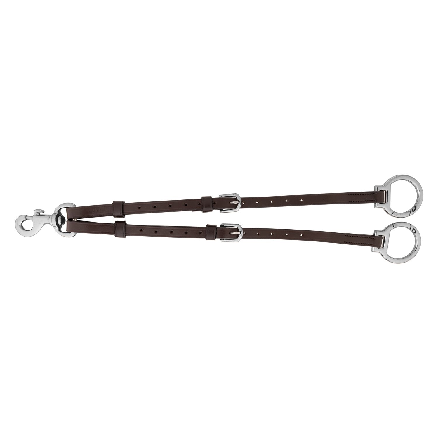 Diese verstellbare Martingalgabel ist aus bestem Qualitätsleder gefertigt. Sie eignet sich zum Einschnallen ins Vorderzeug. Mit silberfarbenen Beschlägen, Ring und Karabinerhaken.