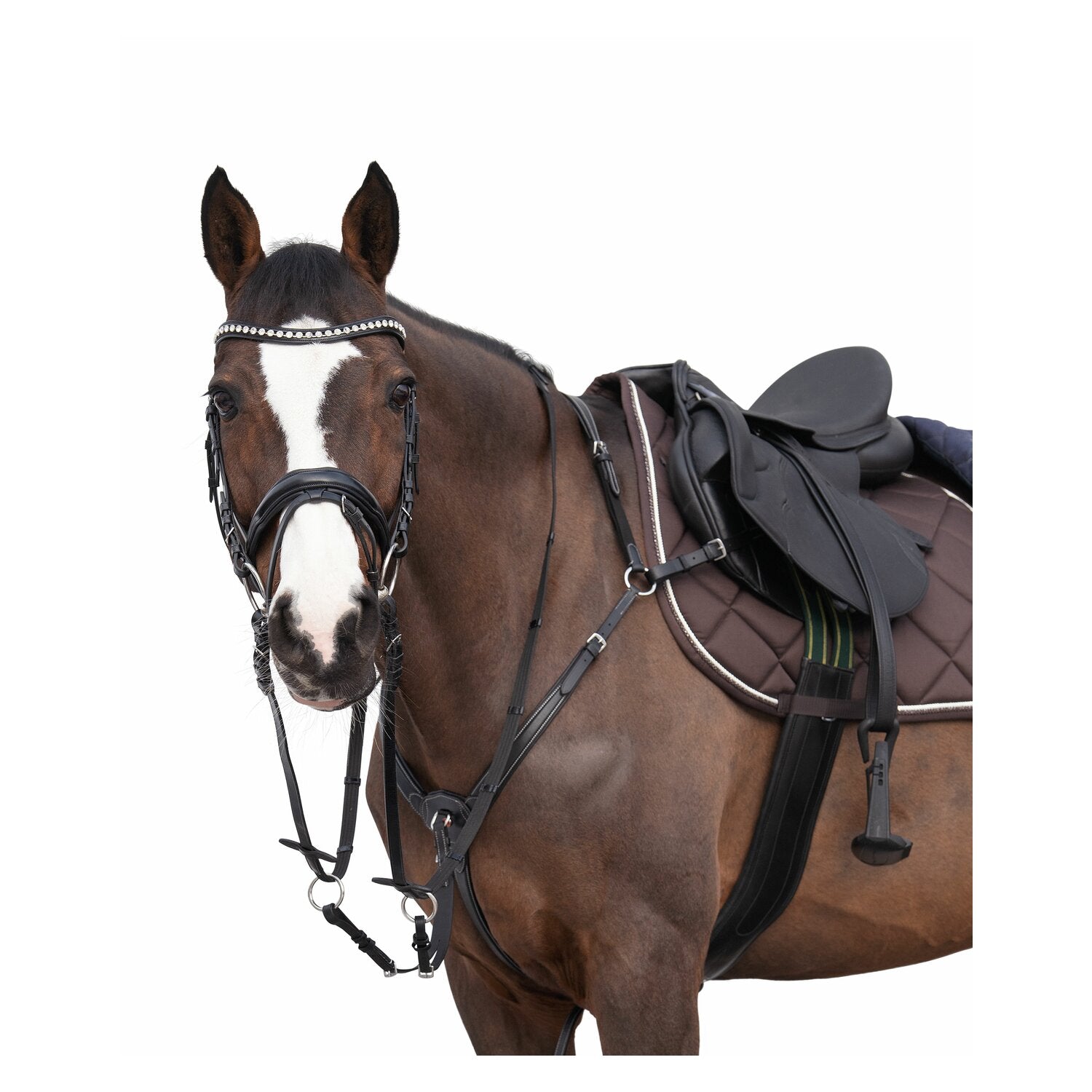 Das multifunktionelle Vorderzeug Saumur ist aus weichem Qualitätsleder hergestellt und verhindert ein Zurückrutschen des Sattels und hält ihn in Position. Besonders praktisch ist die durch Karabinerhaken abnehmbare Martingalgabel, dadurch auch besonders geeignet für das Barock-Outfit. Eine weiche Polsterung an den Seitenteilen und dem Druckpunkt an der Brust verhindern Scheuerstellen. Das Vorderzeug ist durch Dornschnallen vielfach größenverstellbar und durch Snap-Karabiner am Sattel zu befestigen. Sehr edel wirken die funkelnden Glitzersteine des Vorderzeugs Saumur und vervollständigen so jeden Look.