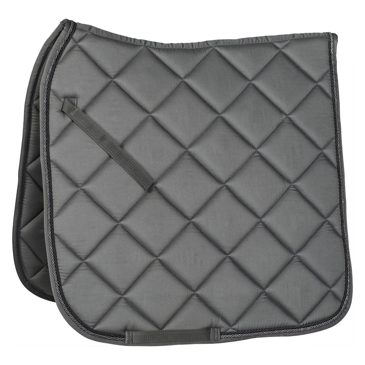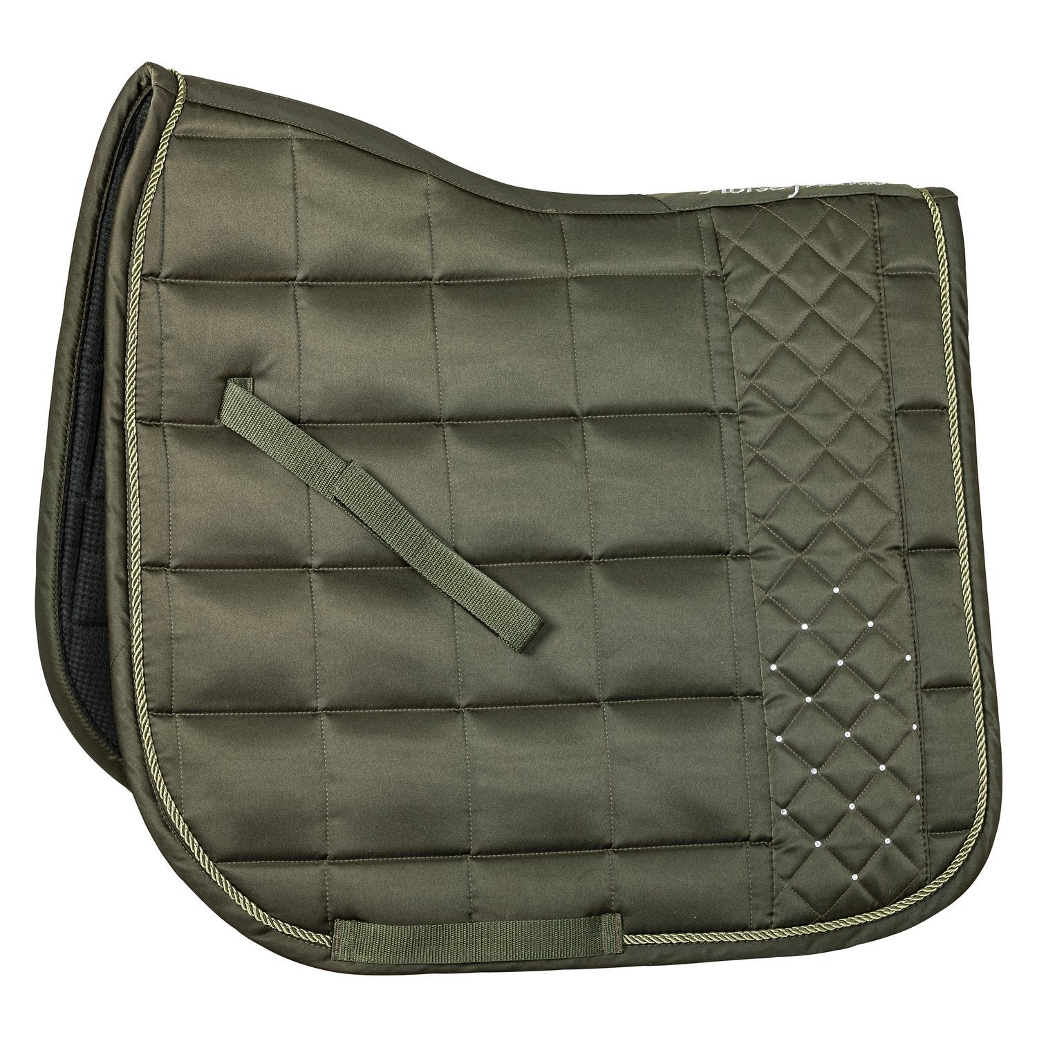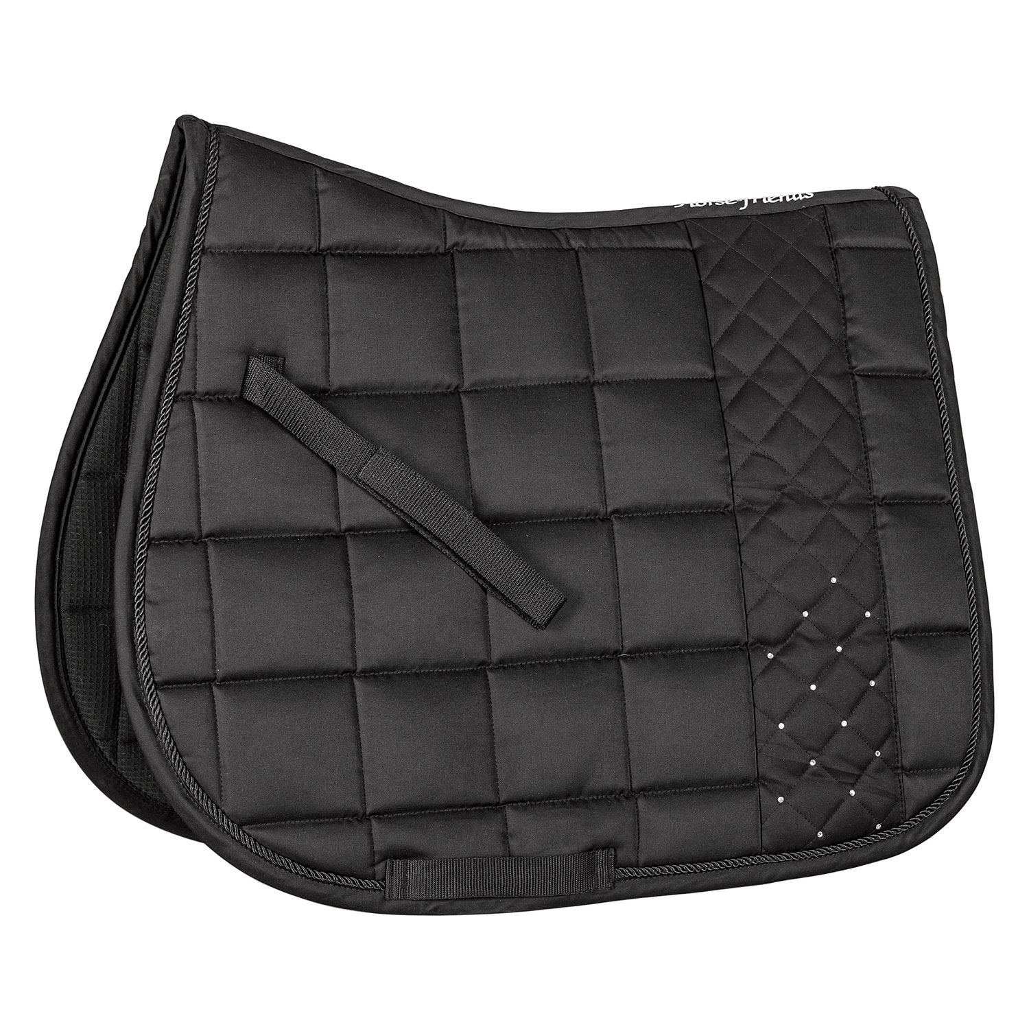Anatomisch geformte Schabracke mit großer Diamantsteppung. Zur Fixierung dienen verstellbare Strupfen- und Gurtschlaufen. Die unifarbene und die glitzernde Zierkordel verleihen der Schabracke das gewisse Etwas.