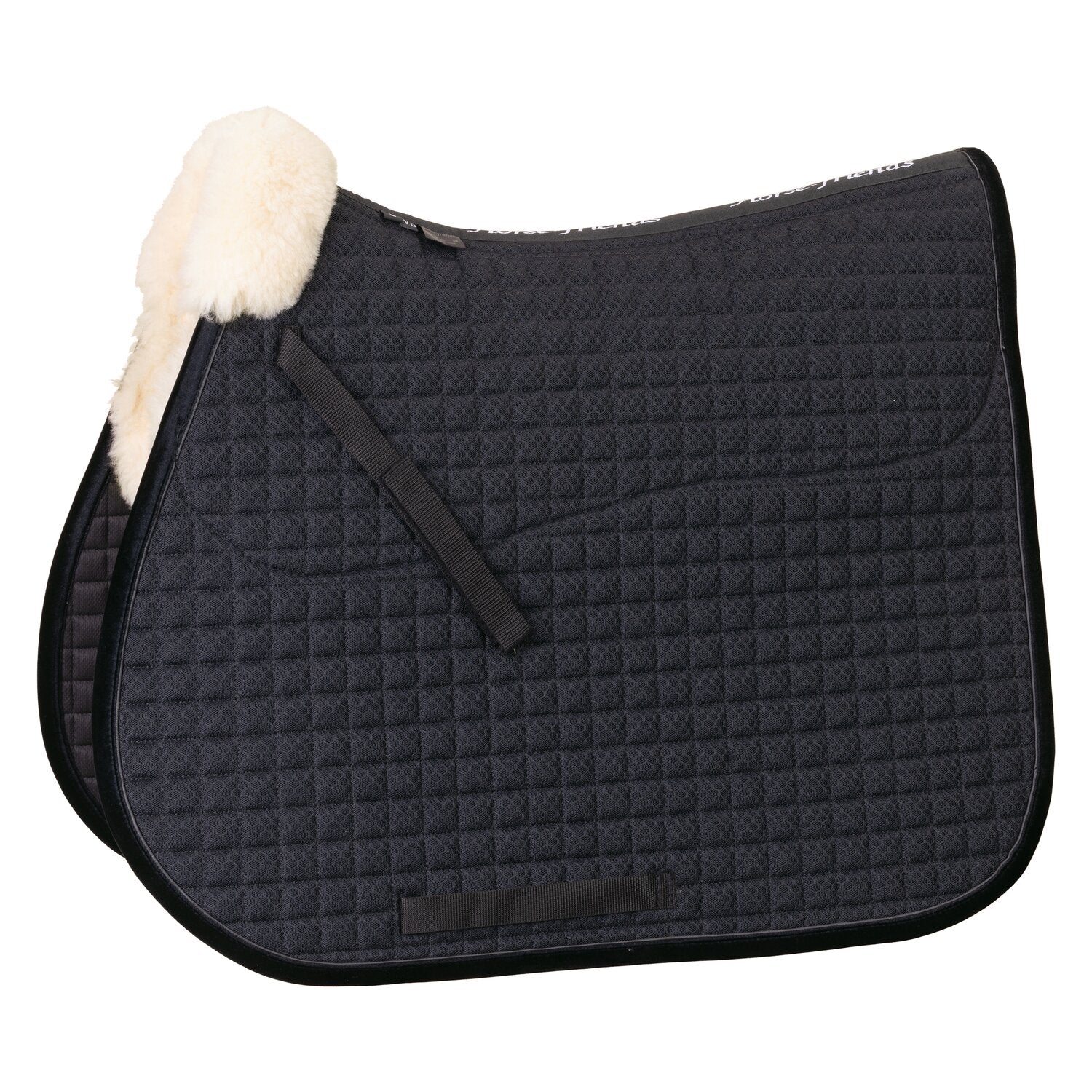 Kleingesteppte, anatomisch geformte Satteldecke mit echtem Lammfell Sattelsitzbereich und gekürztem Lammfellbesatz im Wirbelkanal für mehr Wirbelsäulenfreiheit. Mit Strupfen- und Gurtschlaufen. Maße: - Dressur: ca. 58 cm x 61 cm - Vielseitigkeit: ca. 56 cm x 51 cm - Pony-Dressur: ca. 53 cm x 48 cm - Pony-Vielseitigkeit: ca. 49 cm x 49 cm