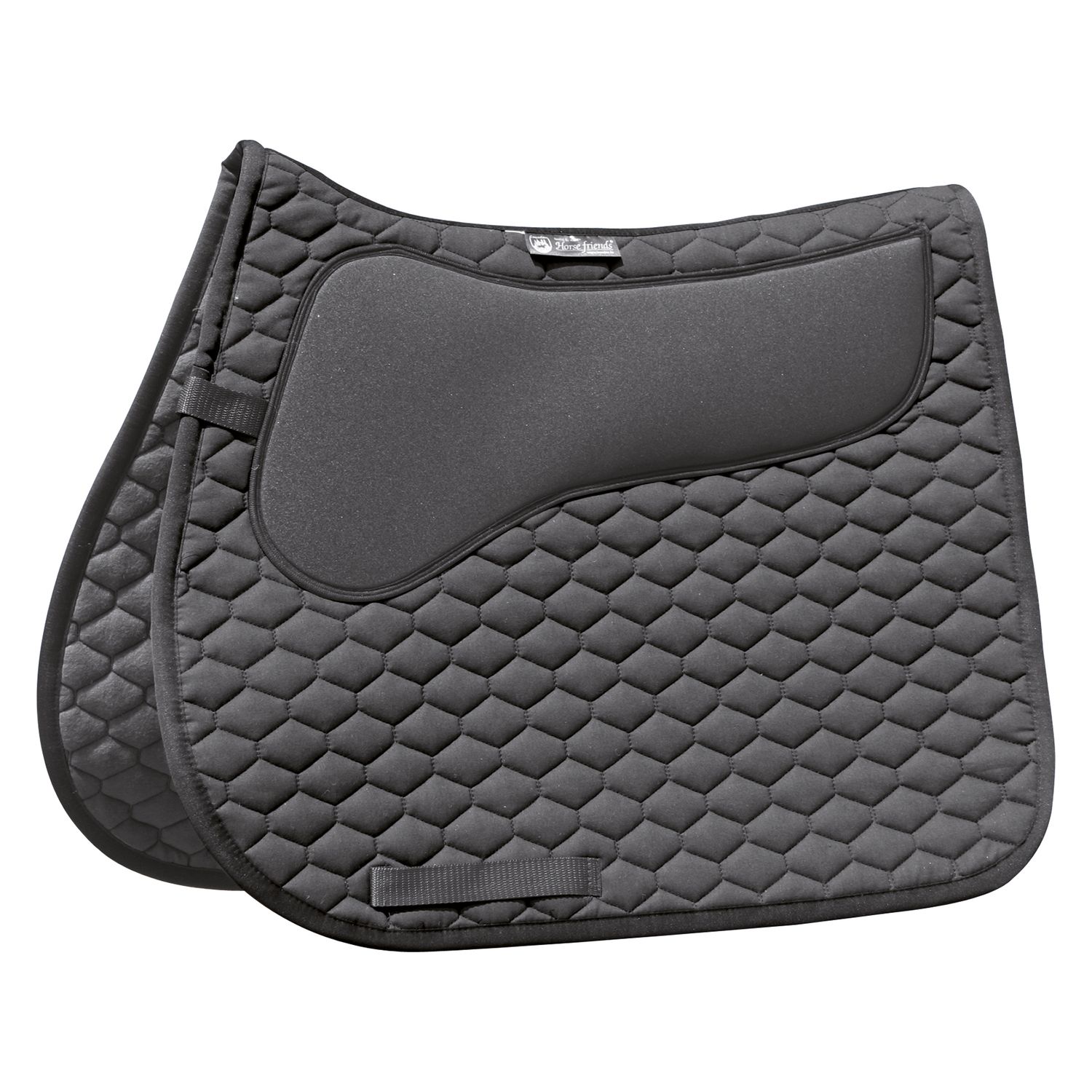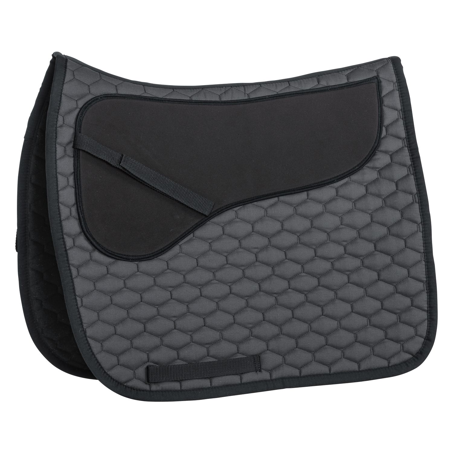 Die Satteldecke mit Moosgummi-Pas in bester deutscher Qualität. Das Moosgummi-Pad sorgt für eine optimale Rückenpolsterung und für die Rutschfestigkeit des Sattels. Länge der Strupfenschlaufen durch Klettverschluss variierbar. Mit aufgenähtem Zellkautschukpad. Maße: - Dressur: 58 cm x 56 cm - Vielseitigkeit: 54 cm x 53 cm Made in Germany.