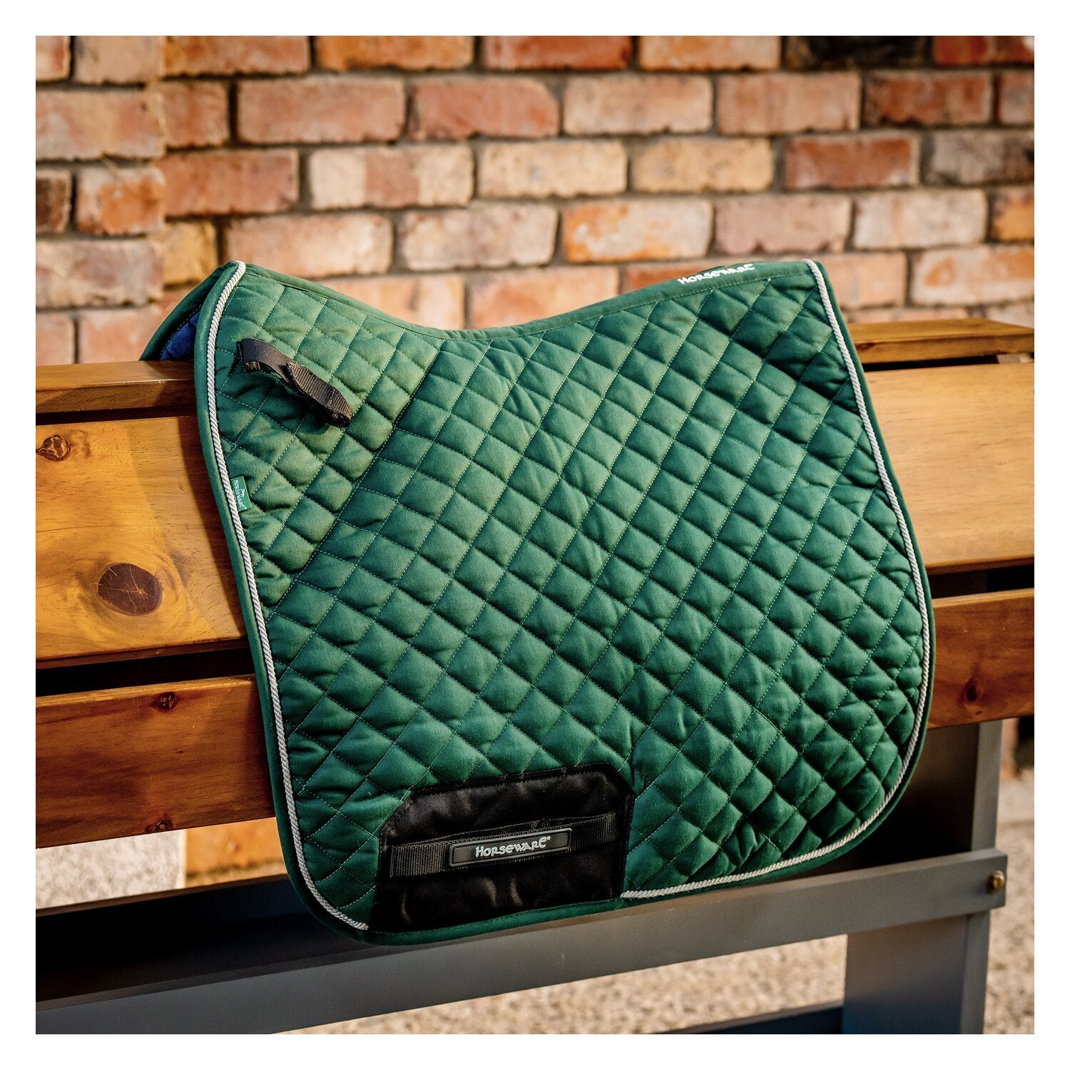 HORSEWARE präsentiert eine Schabracke aus der Signature Kollektion mit verbessertem Komfort. Sie ist körpernah geschnitten, sodass sie mit den meisten Sätteln verwendet werden kann. Aus gestepptem Polyester mit baumwollähnlichem Griff und weicher, gebürsteter Innenseite, die die Feuchtigkeit von der Haut des Pferdes ableitet und gleichzeitig hoch atmungsaktiv ist. Dazu kommt die Verstärkung im Gurtbereich aus PVC mit Logoprägung zur Vermeidung von Reibung. Durch den beidseitigen Gurtriemen sowie die D-Ring-Lasche, die einfach am Sattel zu befestigen ist wird die Schabracke an Ort und Stelle gehalten ohne zu Verrutschen.