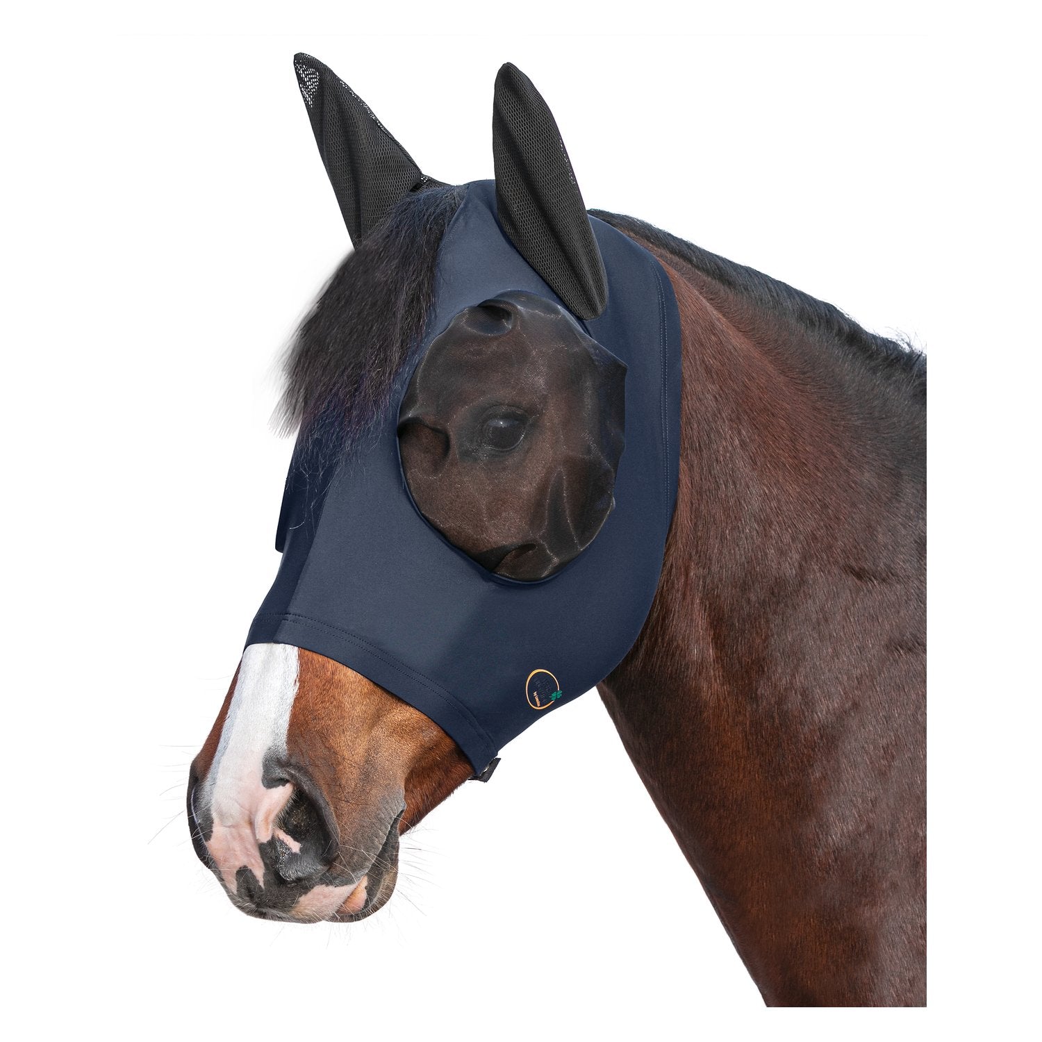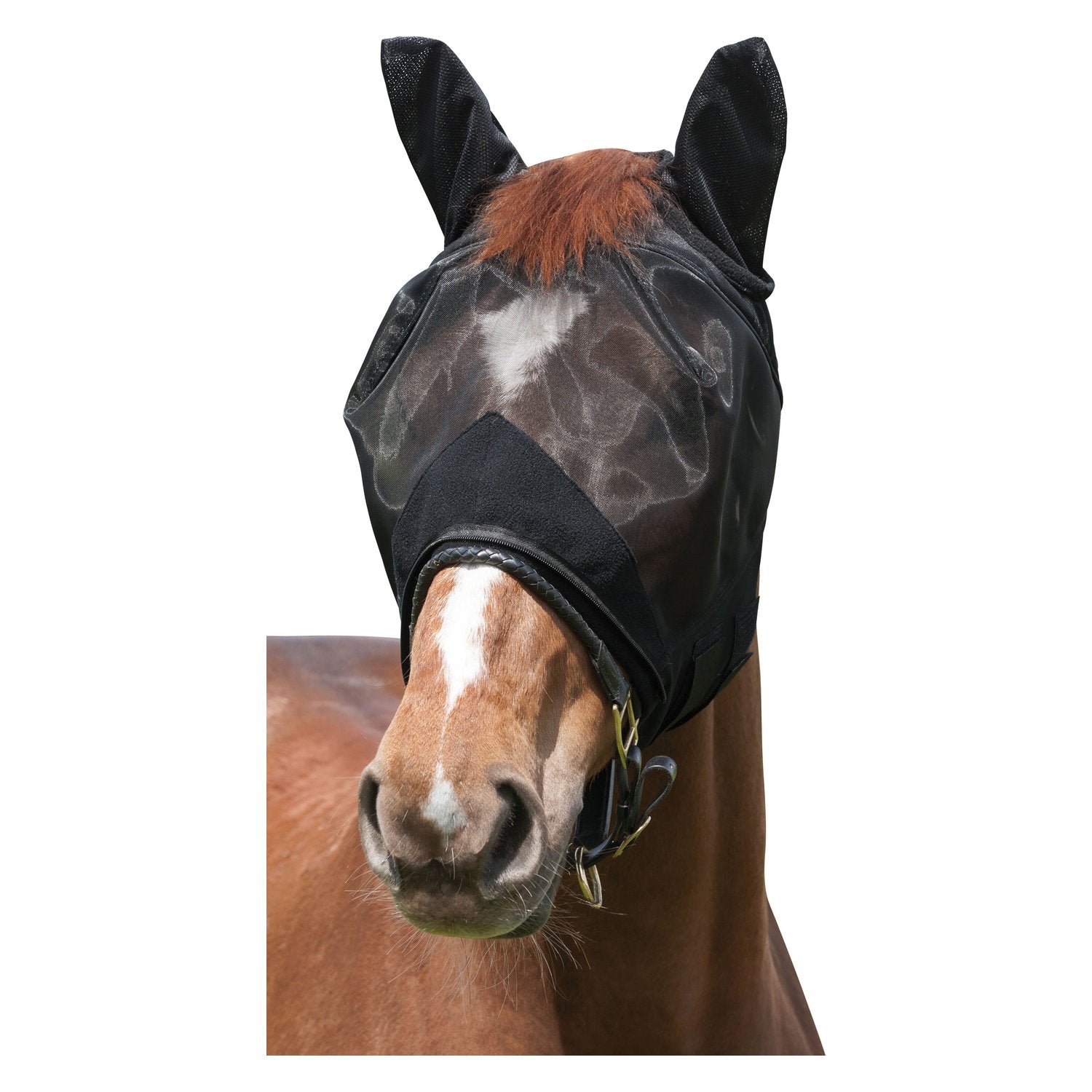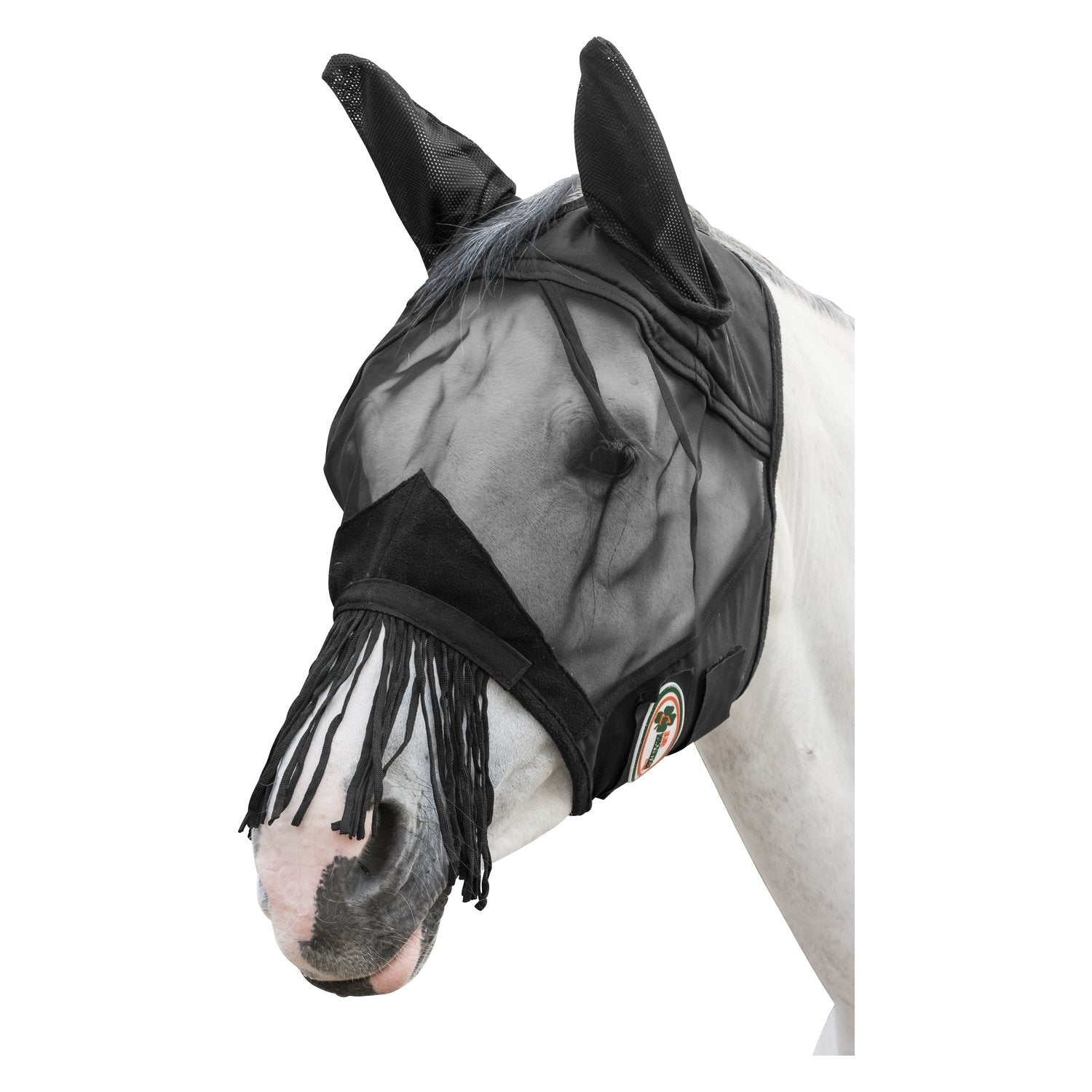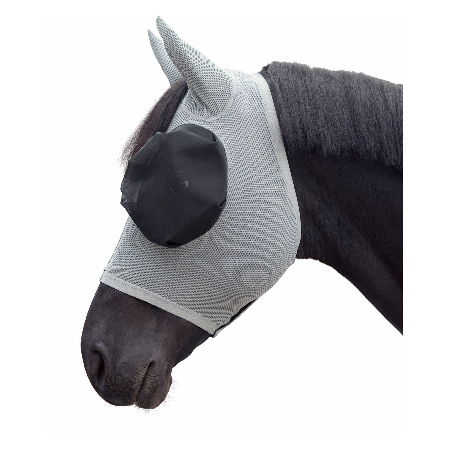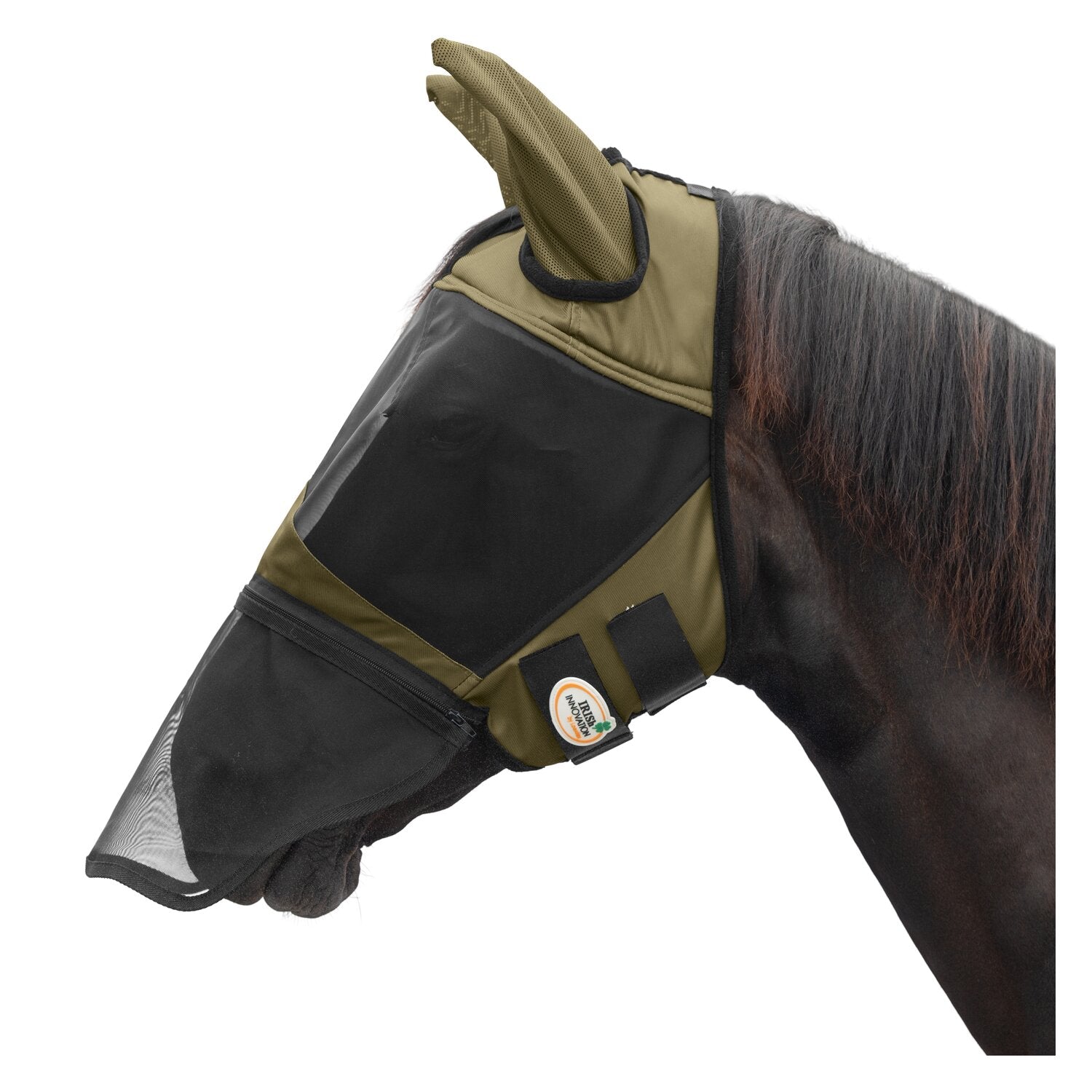 Großflächiger Schutz für die empfindliche Kopfregion deines Pferdes. Aus dehnbarem, anliegendem Material an Kopf und Ohren mit großzügigem, sehr engmaschigem Netzmaterial im Bereich des Sichtfeldes, das vor lästigen Fliegen und Insekten schützt. Dank der weichen Fleece-Polsterung an den Abschlüssen wird ein hoher Tragekomfort gewährleistet. Mit einem durch Reißverschluss abnehmbarem Nasenschutz und praktischem Schopfdurchlass. Zur Fixierung dienen zwei Klettverschlüsse.