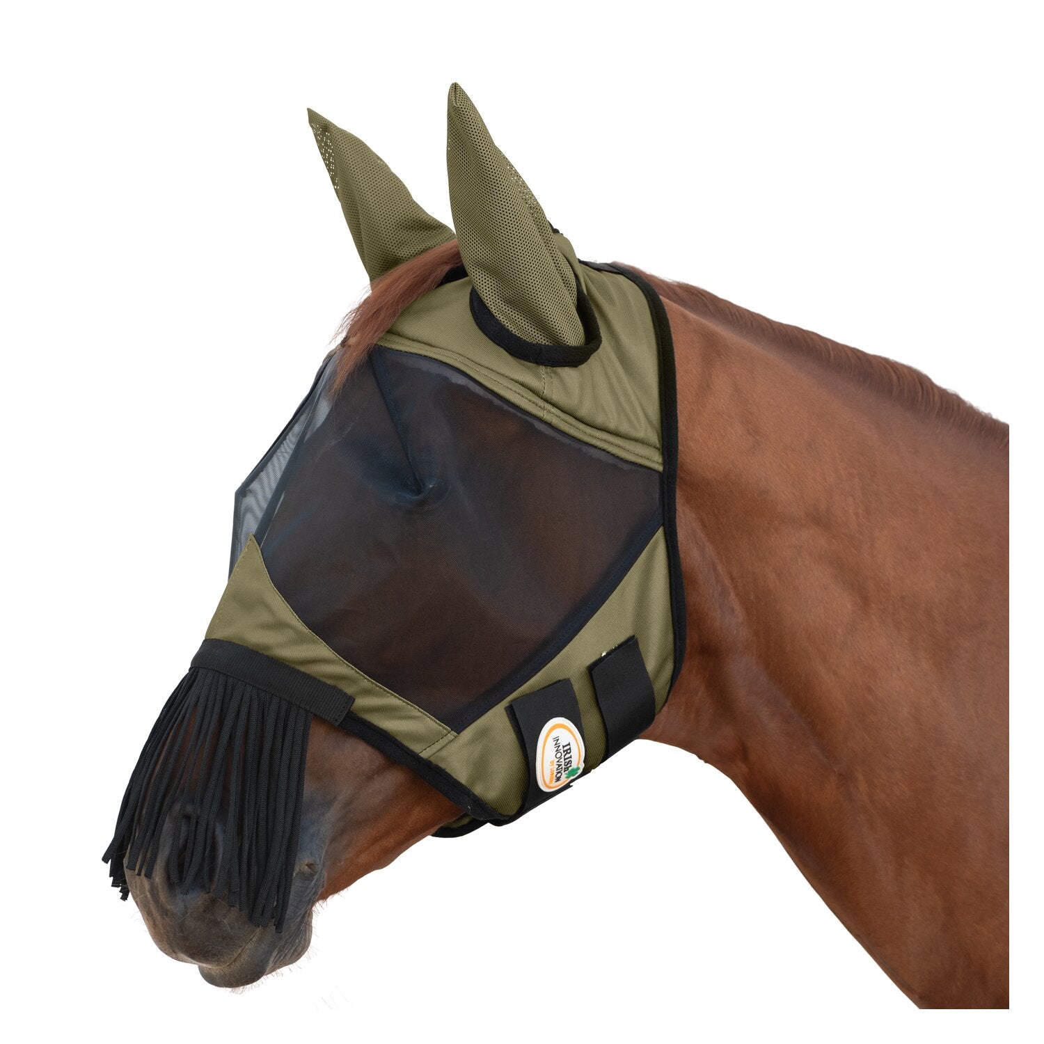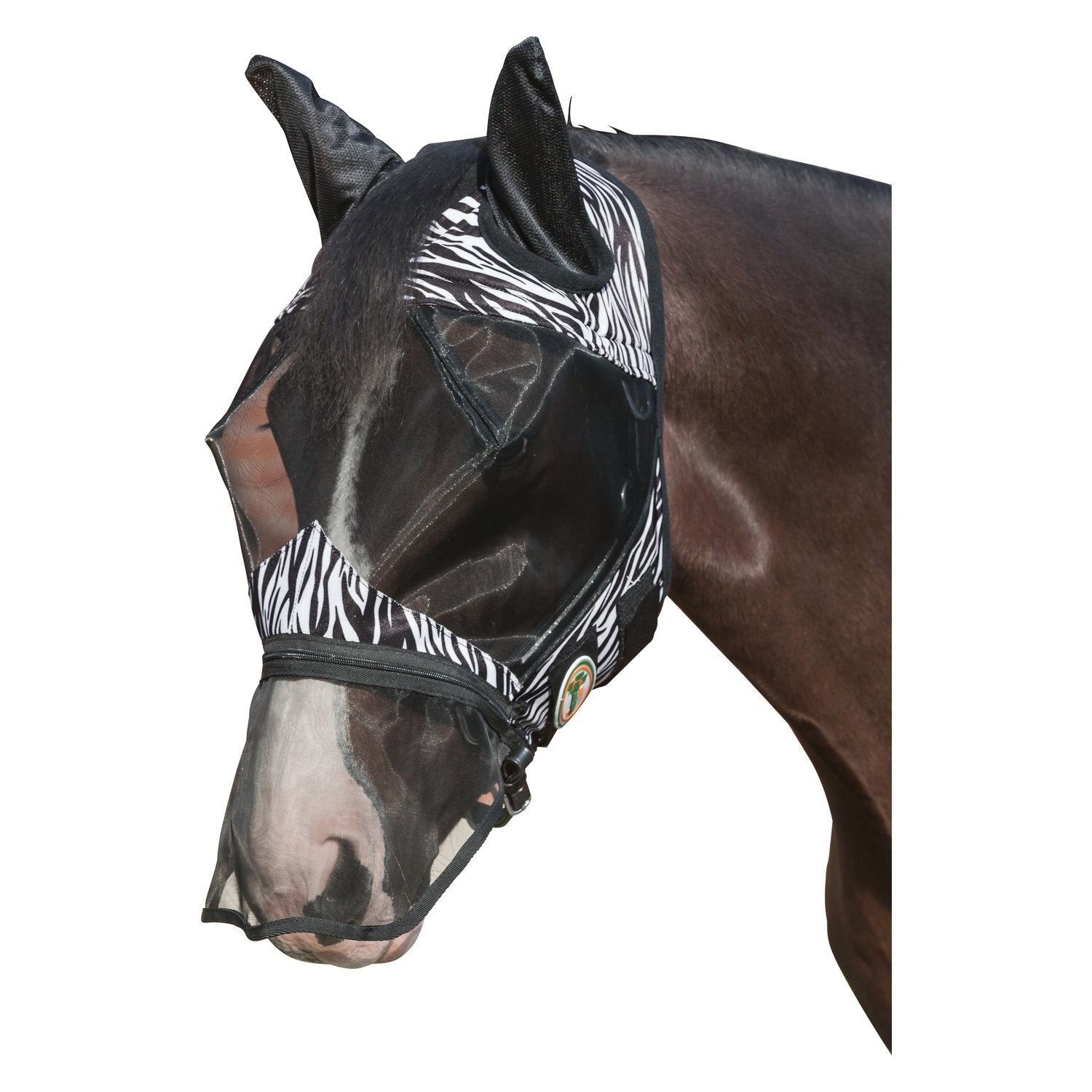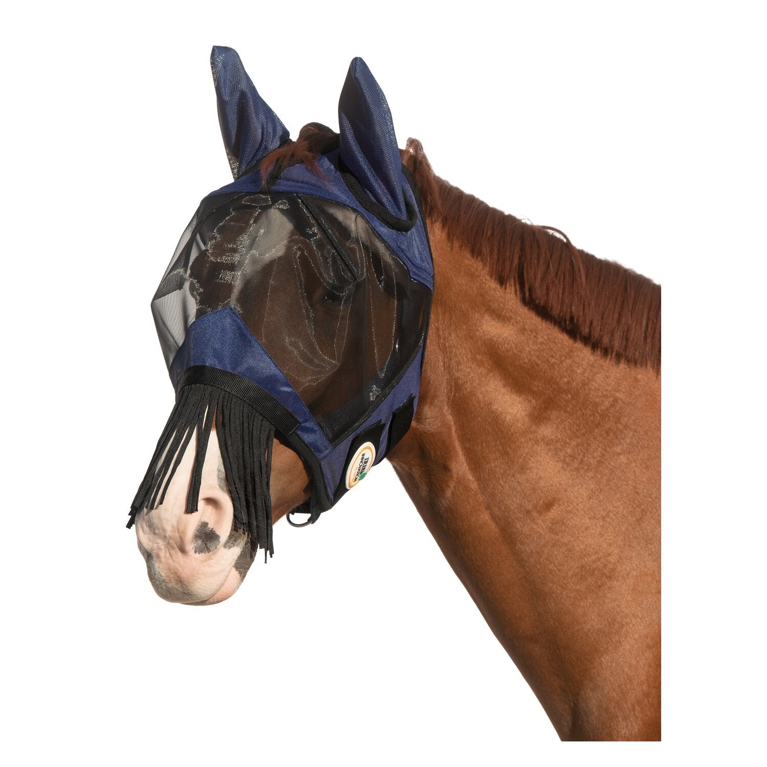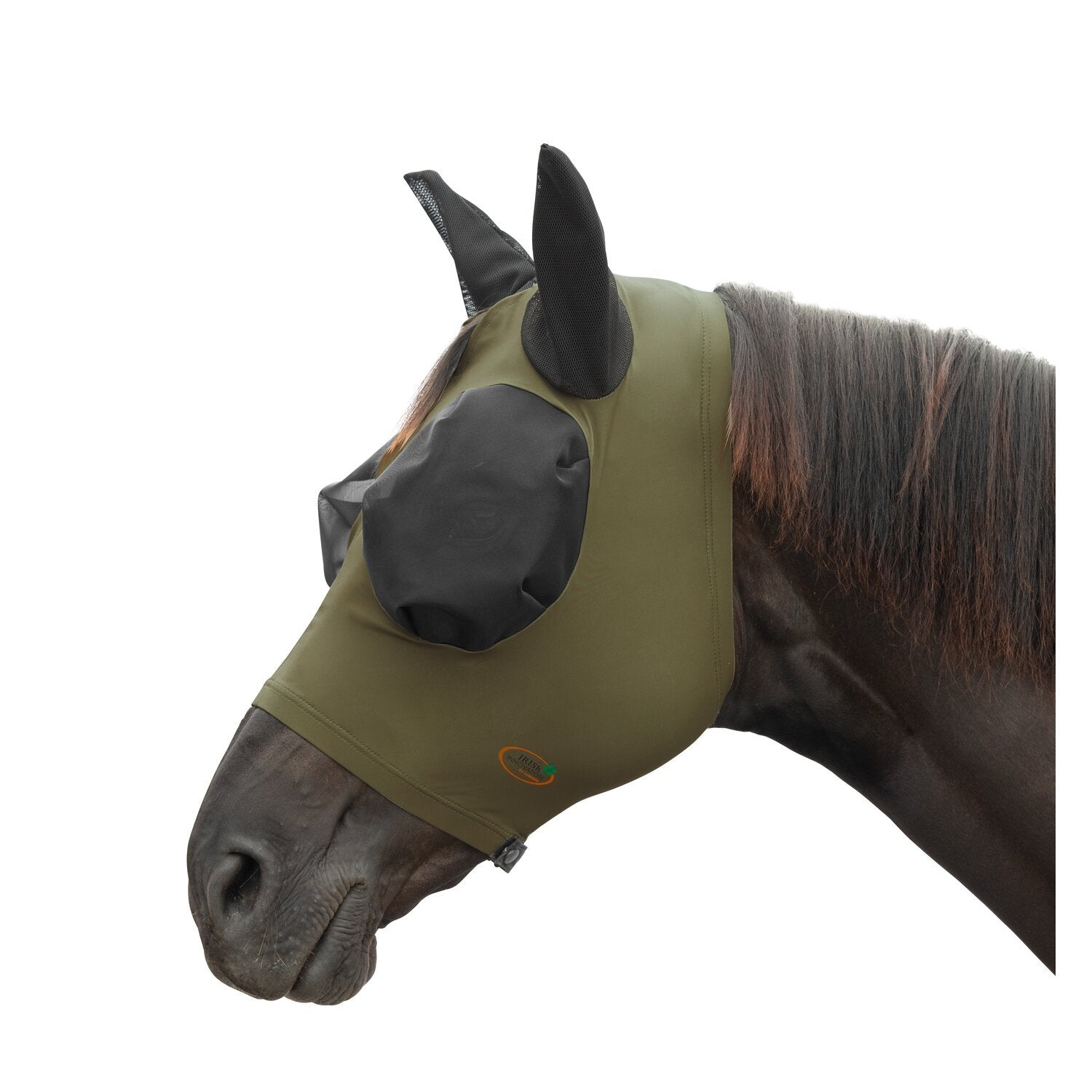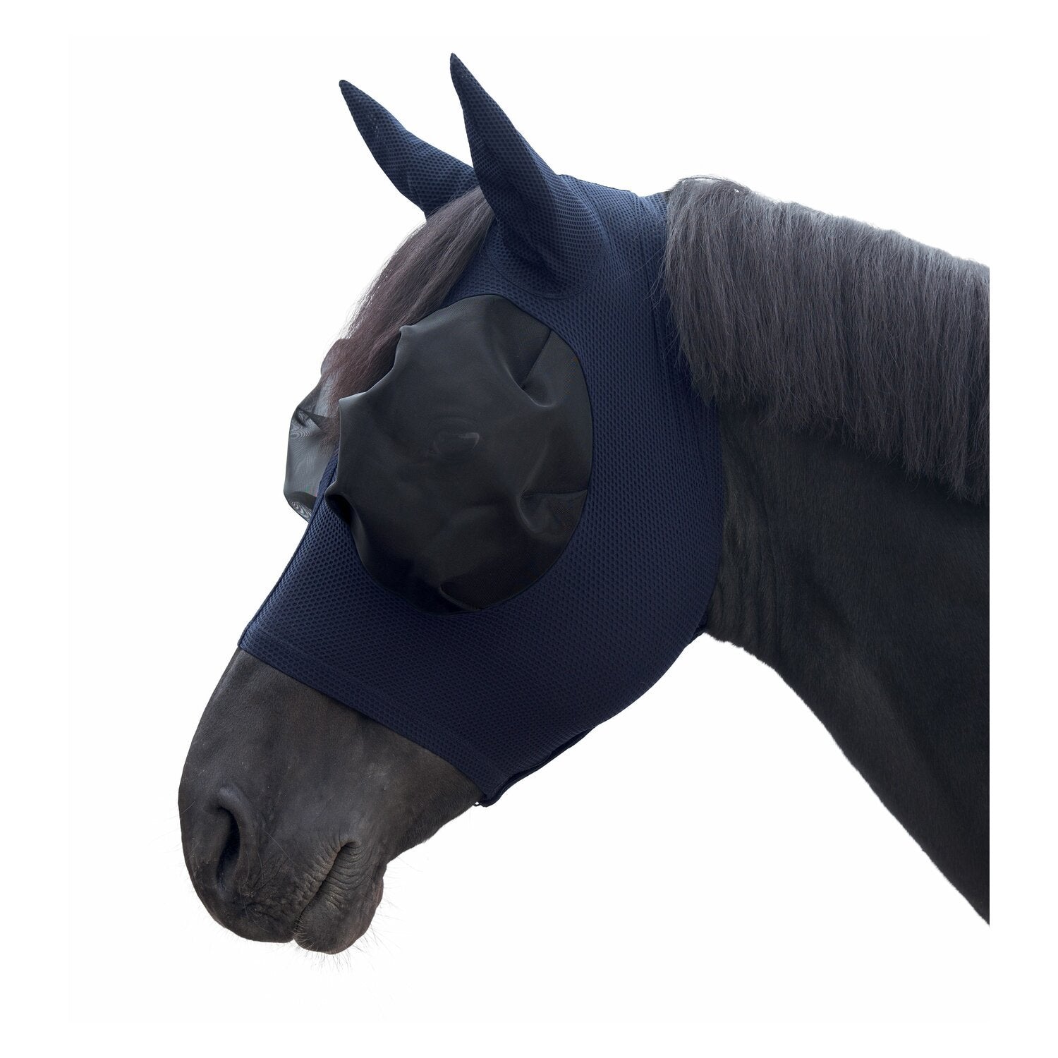 Großflächiger Schutz für die empfindliche Kopfregion deines Pferdes. Aus dehnbarem, anliegendem Material an Kopf und Ohren mit großzügigem, sehr engmaschigem Netzmaterial im Bereich des Sichtfeldes, das vor lästigen Fliegen und Insekten schützt. Dank der weichen Fleece-Polsterung an den Abschlüssen wird ein hoher Tragekomfort gewährleistet. Mit einem durch Reißverschluss abnehmbarem Nasenschutz und praktischem Schopfdurchlass. Zur Fixierung dienen zwei Klettverschlüsse.