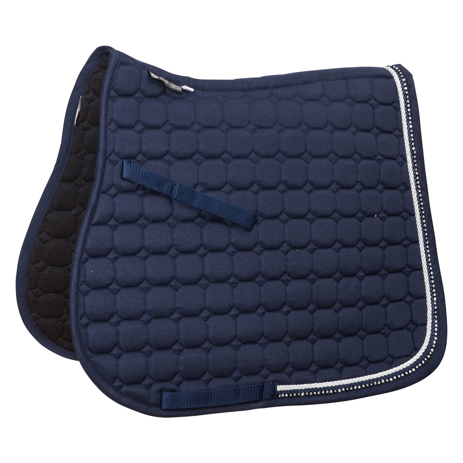 Die formstabile, anatomisch geformte Schabracke Diamonds von Loesdau mit außergewöhnlicher Steppung. mit Glitzer-Biese und doppelter Zierkordel. Schnell trocknendes Untermaterial für bestes Klimamanagement. Die Länge der Strupfenschlaufen ist durch Klettverschluss variierbar. Maße: - Dressur: ca. 61 cm x 54 cm - Vielseitigkeit: ca. 58 cm x 52 cm