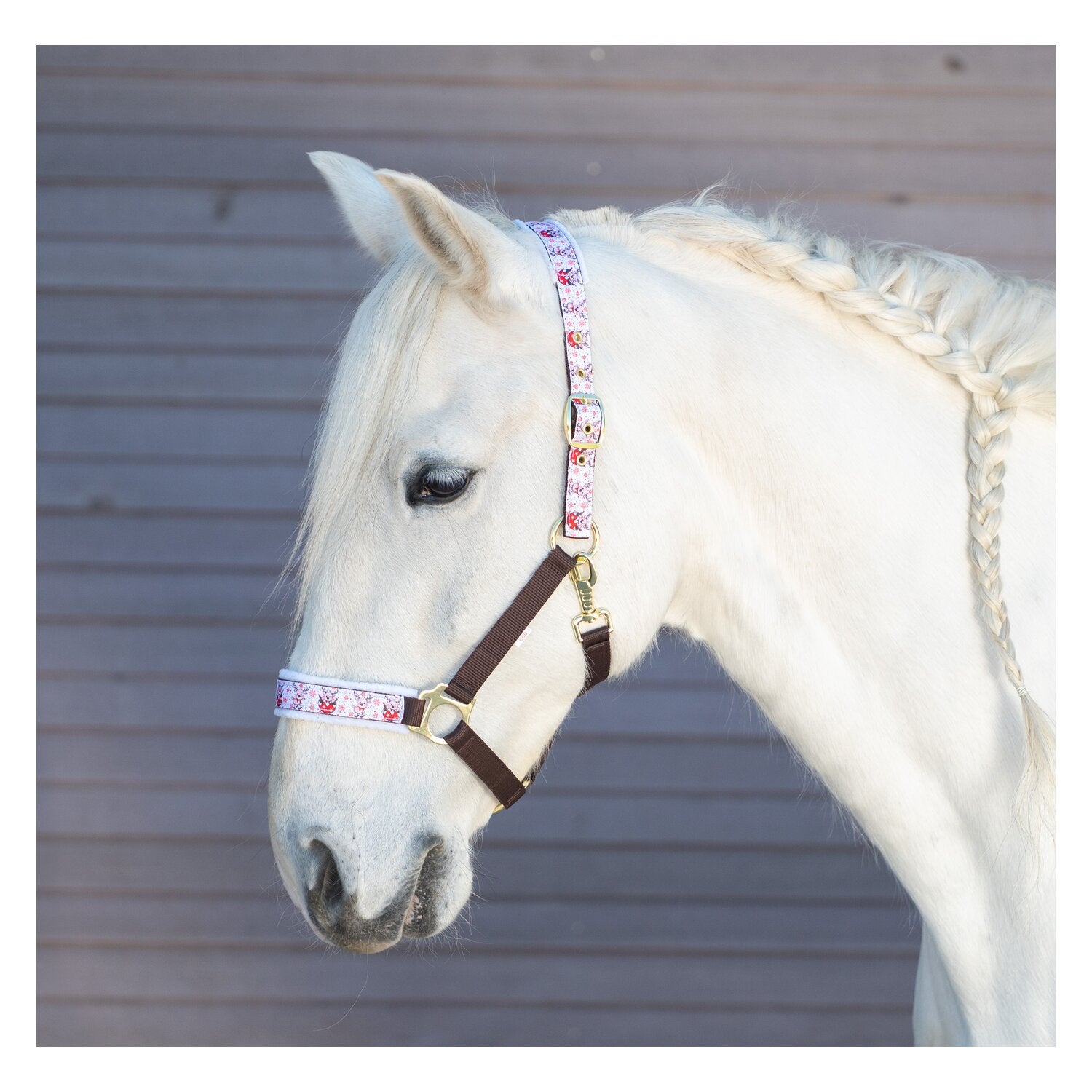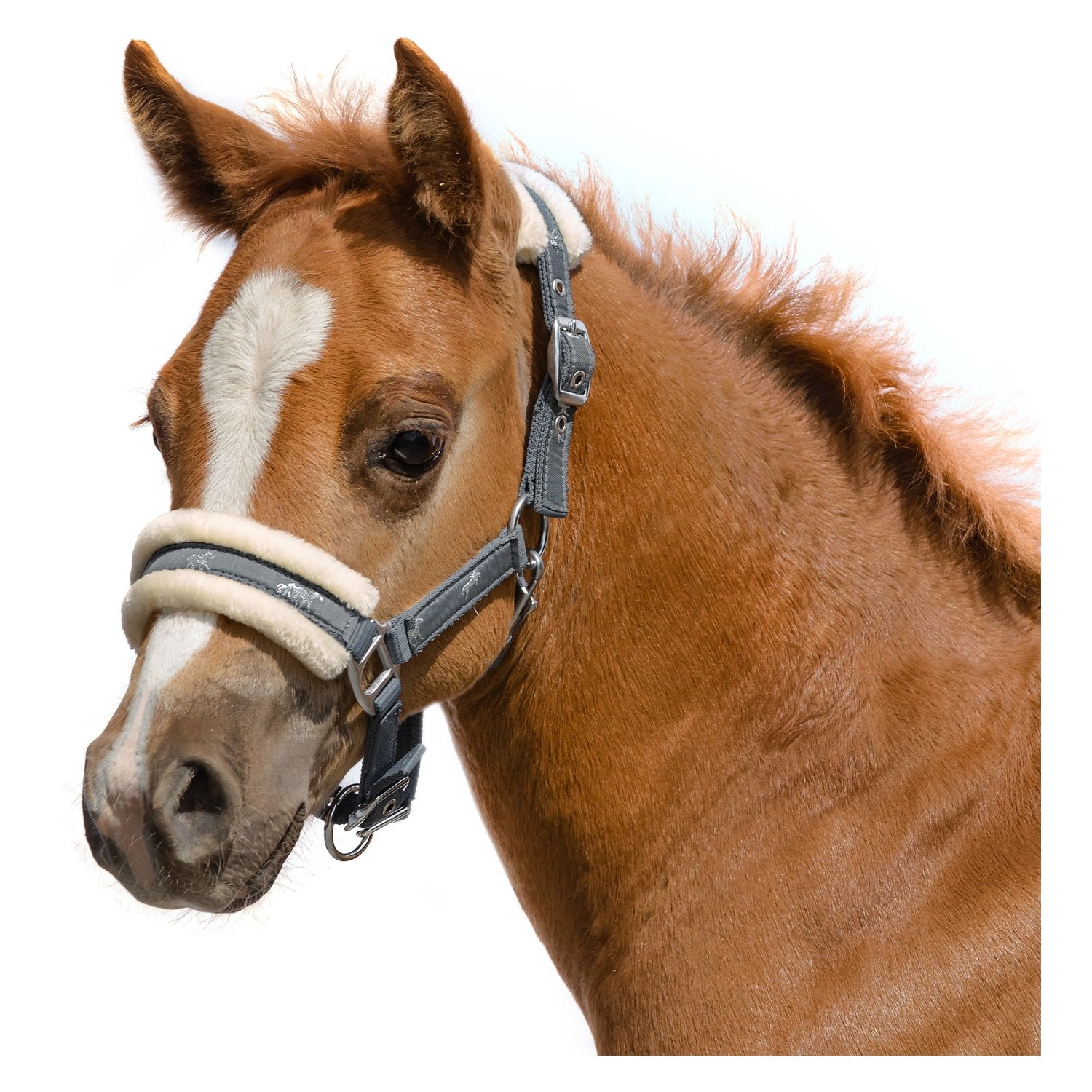 Flauschiges Fohlenhalfter Horses aus stabilem Webmaterial mit kuscheliger Kunstfellpolsterung an Genick- und Nasenriemen sowie schönem Pferdemotiv-Zierband. Zur optimalen Anpassung ist das Halfter 2-fach verstellbar mit silberfarben Beschlägen und Karabinerhaken.