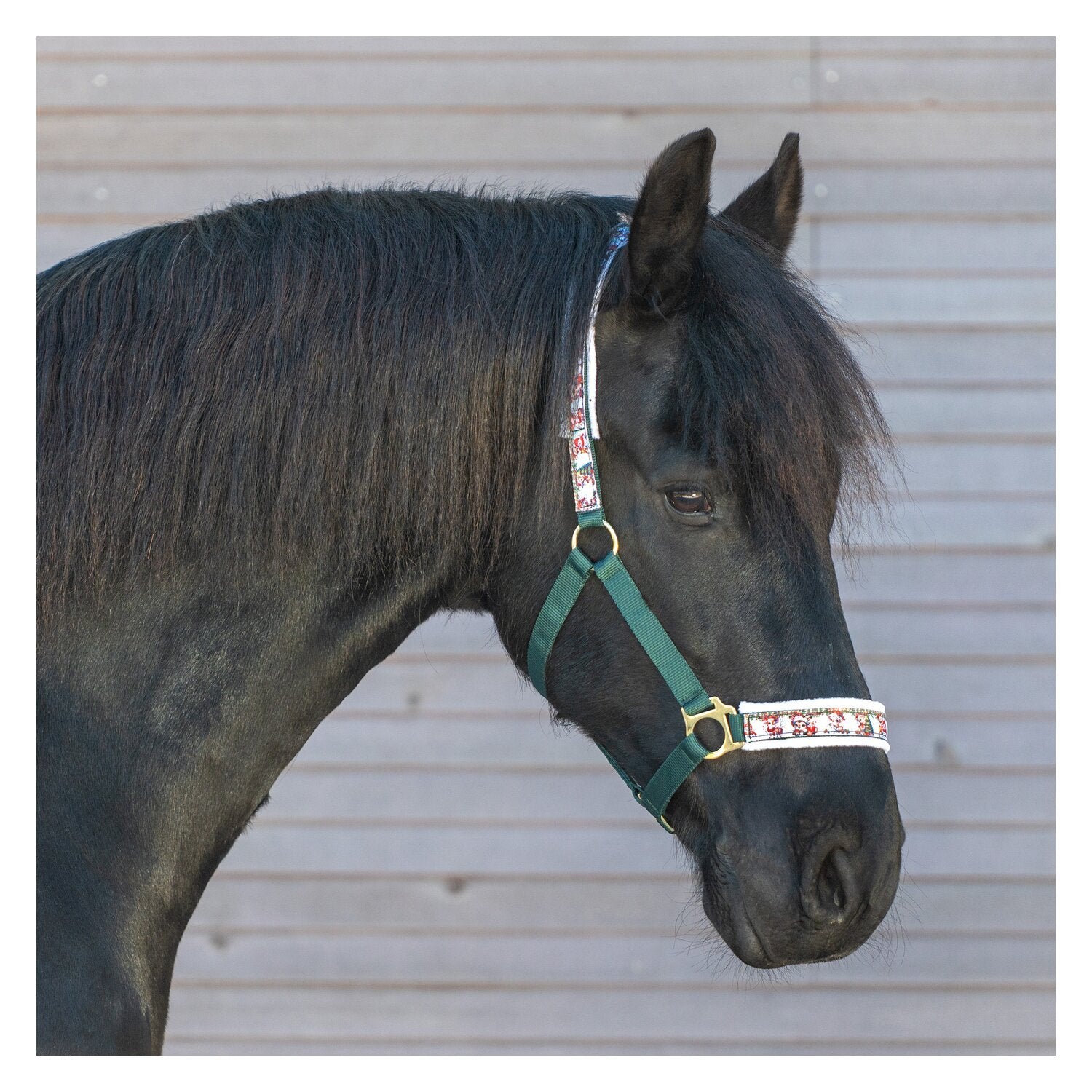 Besonders weihnachtlich! Passend zu Weihnachten gibt es das Webhalfter Happy X-Mas aus dem Hause Loesdau. Mit weicher Teddyfleece-Polsterung an den sensiblen Belastungspunkten von Nase und Genick. Das Zierband sorgt für einen weihnachtlichen Flair. 1-fach verstellbar durch Dornschnalle. Mit messingfarbenen Beschlägen.