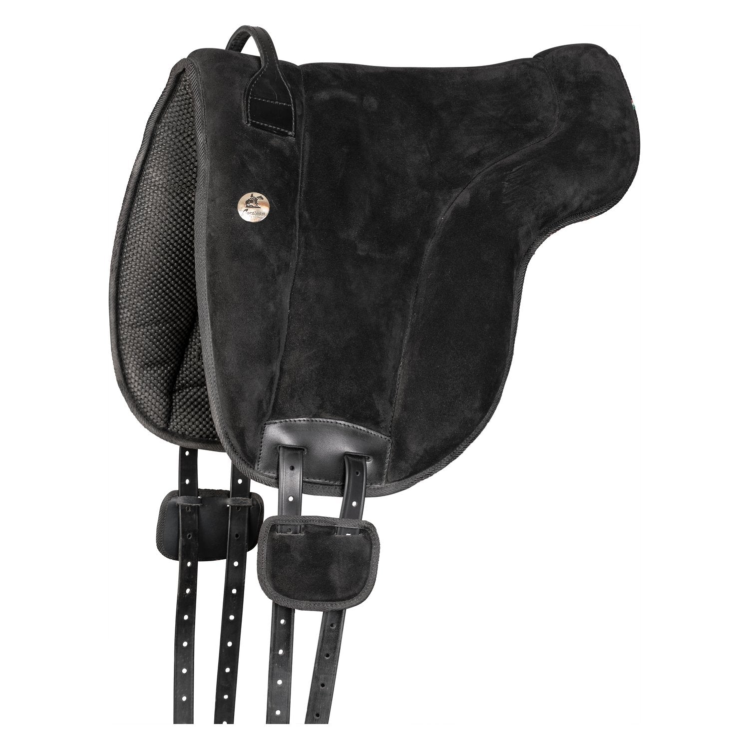 L-pro West Bareback-Pad Wildleder – Reiten ohne Sattel in Komfort und Stil Erlebe pures Reitgefühl und intensiven Kontakt zu deinem Pferd – mit dem L-pro West Bareback-Pad Wildleder. Egal ob Westernreiten, Freizeitreiten oder englische Reitweise – dieses hochwertige Reitkissen bietet dir optimalen Halt, einen sicheren Sitz und höchsten Komfort. Komfort und Kontrolle in einem • Anatomische Form passt sich optimal dem Pferderücken an • Dicke Schaumstoff-Polsterung für weiches, schonendes Reiten • Wildleder-Sitzfläche für rutschfesten Halt und angenehmes Sitzgefühl • Noppen-Unterseite sorgt für sicheren Anti-Rutsch-Effekt • Leder-Haltegriff für zusätzliche Sicherheit Robust & durchdacht • Made in Italy – hochwertige Verarbeitung • Lange Gurtstrupfen aus BioThane®: extrem haltbar, wetterfest und pflegeleicht • Passend für Pony (Rückenlänge ca. 45 cm) oder Großpferd (Rückenlänge ca. 52 cm) • Hinweis: Passend für Englisch-Kurzgurt (nicht im Lieferumfang enthalten) Mit dem L-pro West Bareback-Pad genießt du die Freiheit des Reitens ohne Sattel, verbesserst deine Balance und stärkst die Verbindung zu deinem Pferd – ganz gleich, ob du dich im Westernreiten zuhause fühlst oder lieber im englischen Sattel unterwegs bist. Rückenlänge: - Pony: ca. 45 cm - Großpferd: ca. 52 cm
