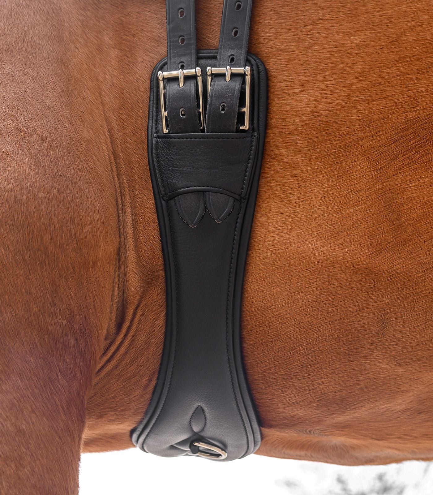 Die drei weich gepolsterten Lederteile bieten durch ihre große Auflagefläche eine gleichmäßige Druckverteilung, wodurch Scheuerstellen und Druckpunkte zuverlässig vermieden werden. Der Gurt kommt ohne elastische Gurtenden und ist mit stabilen Edelstahl-Rollschnallen sowie einem D-Ring ausgestattet, die einfaches Nachgurten und die Befestigung von Hilfszügeln oder Vorderzeug ermöglichen.