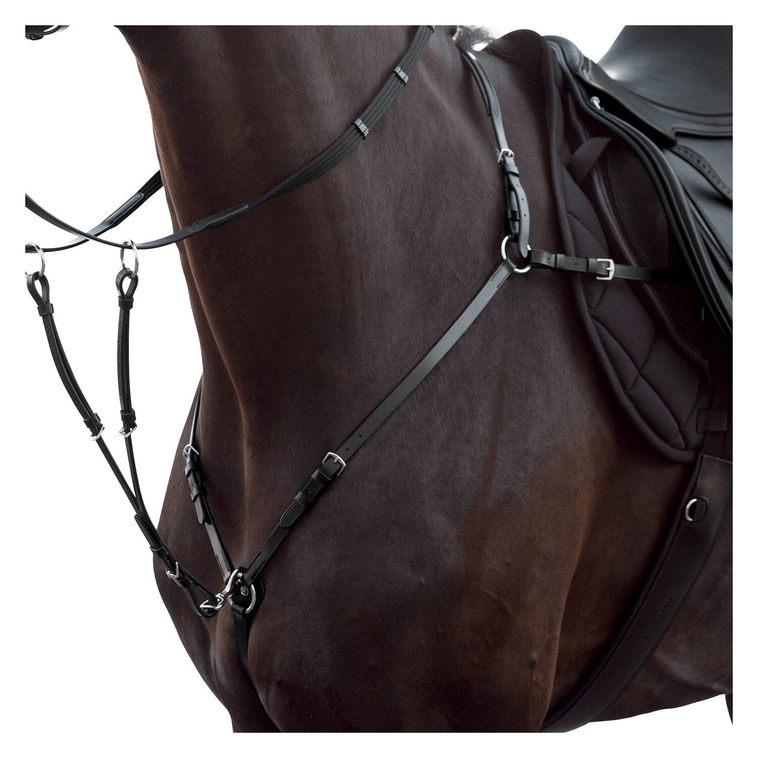 Dieses Vorderzeug von PRESTIGE kommt mit Brücke und einer Martingalgabel mit EVO-Klippsystem Ringen. Diese erlauben ein einfaches und schnelles Befestigen der Zügel, ohne diese öffnen zu müssen. Um einen optimalen Tragekomfort für das Pferd zu gewährleisten, verfügt das Vorderzeug über elastische Einsätze. Es ist konzipiert, um an den Gurtstrippen des Sattels befestigt zu werden, so dass die Stabilität verbessert und der Druck auf den Widerrist und die Schultern verringert wird. Mit klassischen, verstellbaren Schnallen.