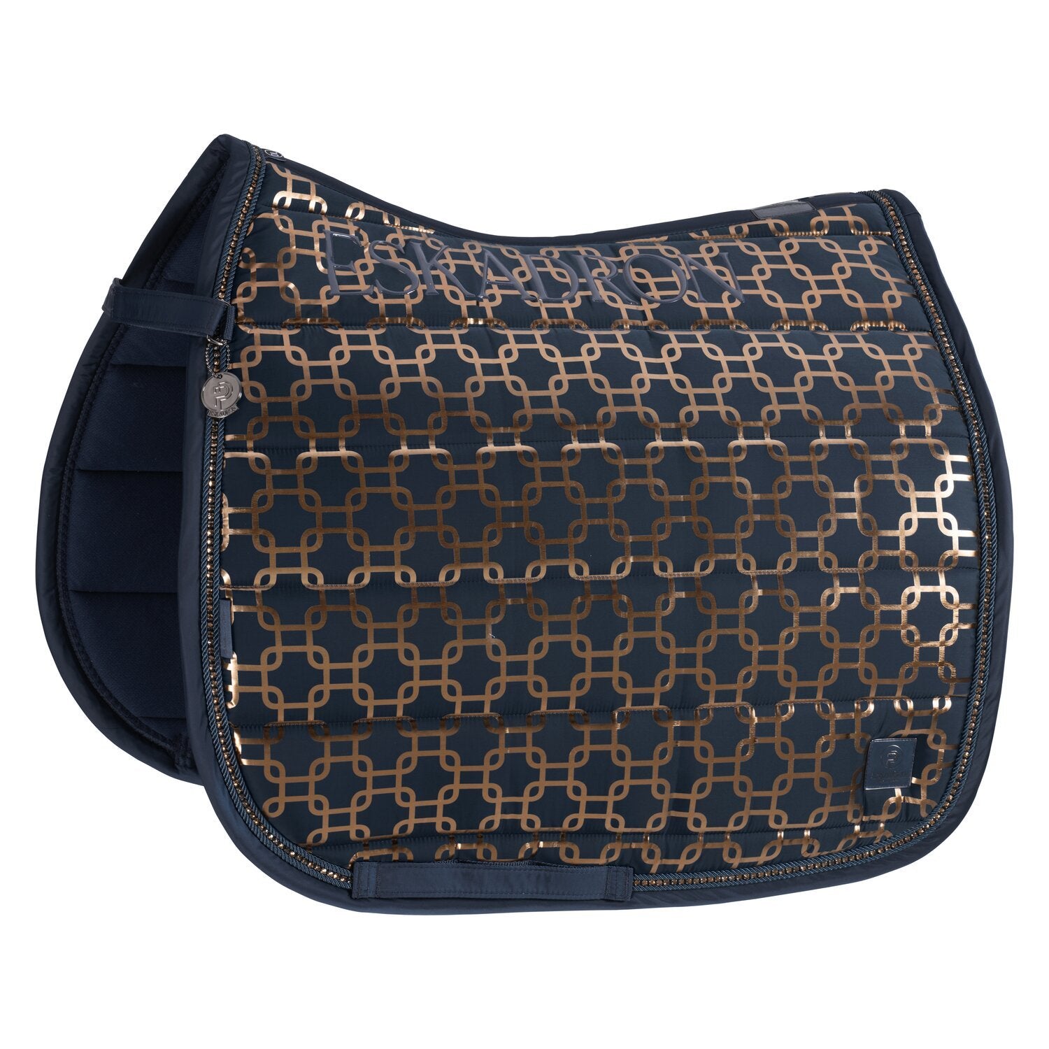 Diese Schabracke Glossy Chain Crystal von ESKADRON aus der Platinum Kollektion hebt sich nicht nur deshalb ab, weil sie so viel Stil hat - auch ihre Qualität ist eine reine Freude. Aus unempfindlichem Glossy-Obermaterial und feuchtigkeitsableitender Cool/Dry-Unterseite. Eine gute Polsterung und Formstabilität wird durch die voluminöse Quersteppung mit stabiler Füllung garantiert. Für einen rutschfesten Halt sind die Antislip-Silikonflächen im Sattelbereich verantwortlich, während das Innostrap-System und die Gurtschlaufen mit dreifacher Fixierungsoption für einen optimale Frontfixierung und eine exakte Positionierung sorgen. Nicht nur der schicke ‘Chain‘-Allover Print sondern auch die elegante »Kordel-Kristallstein-Kordel« Kombination auf der Glossy Einfassung und das Platinum-Emblem, beidseitig machen die Schabracke zum Blickfang schlechthin. • unempfindliches Glossy-Obermaterial und Cool/Dry-Unterseite • voluminöse Quersteppung • Antislip-Silikonflächen im Sattelbereich • schicker ‘Chain‘-Allover Print • elegante »Kordel-Kristallstein-Kordel« Kombination auf Glossy Einfassung • Platinum-Emblem, beidseitig • Innostrap-System für optimale Frontfixierung • Gurtschlaufe mit dreifacher Fixierungsoption für exakte Positionierung