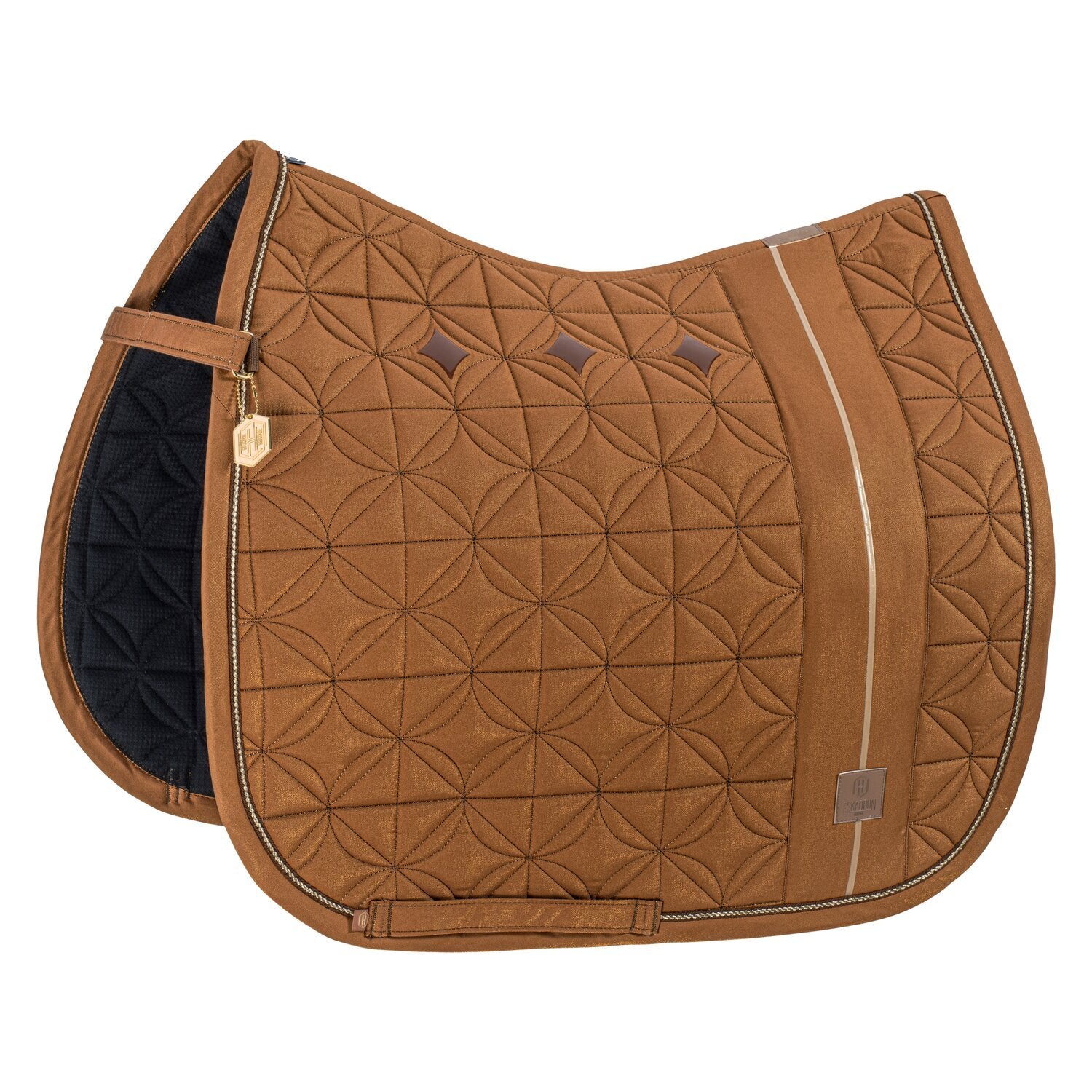 Aus glitzerndem Obermaterial mit tragefreundlicher Unterseite punktet diese Schabracke von ESKADRON aus der Heritage Kollektion. Sie schützt den Sattel und leitet durch das Obermaterial mit hohem Baumwollanteil und die Molton-Unterseite den Schweiß vom Pferd ab. In anatomischer Schnittführung mit mitteldicker Füllung. Für einen rutschfesten Sitz unter dem Sattel verfügt die Schabracke über das bewährte Innostrap-System zur Frontfixierung, Gurtschlaufen mit dreifacher Fixierungsoption und Anti-Slip Silikonflächen im Sattelbereich. In klassischem Design kommt sie mit geflochtener Lurex-Kordel auf der Glossy-Einfassung und dem Heritage-Emblem auf beiden Seiten. • Glitzer Baumwoll-Obermaterial mit angenehmer Molton-Unterseite • Großzügige Steppung mit mitteldicker Füllung • Anti-Slip Silikonflächen im Sattelbereich • Geflochtene Lurex-Kordel auf Glossy Einfassung • Innostrap-System für optimale Frontfixierung • Gurtschlaufe mit dreifacher Fixierungsoption für exakte Positionierung • Heritage-Emblem, beidseitig