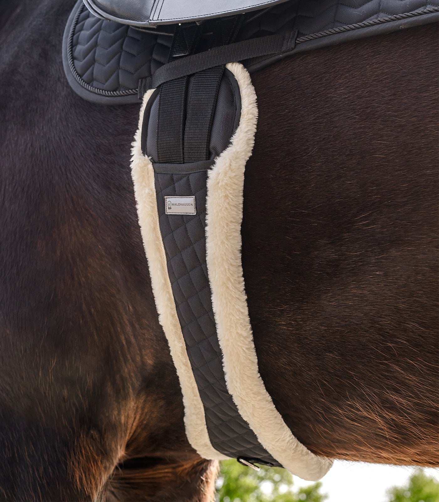 Langgurt, mit weichem synthetischen Fell unterlegt. Durch seine Form ist der Langgurt besonders für bauchige Pferde geeignet und beugt ein nach vorne rutschen des Sattels vor. Mit D-Ring und Rollschnallen aus Edelstahl. Ohne Elastik.