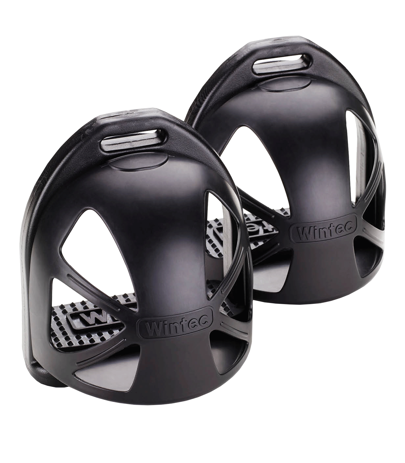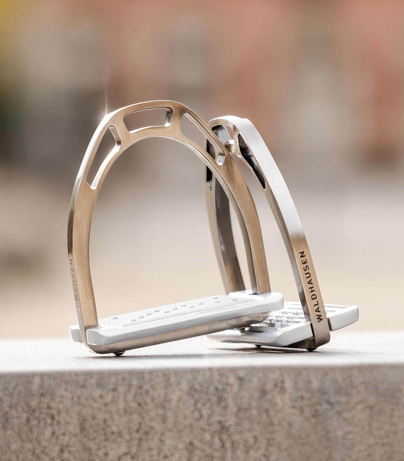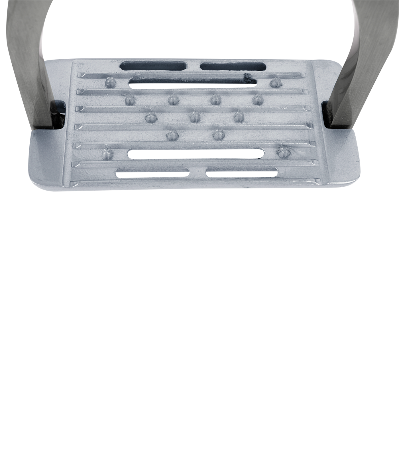 Steigbügel aus hochwertigem Aluminium mit einer 6,5 cm breiten und 12 cm langen Trittfläche. Mit einem Scharnier an der Außenseite. Durch das Reitergewicht öffnet sich das Scharnier im Falle eines Sturzes und verhindert ein Hängenbleiben im Steigbügel. Paar.