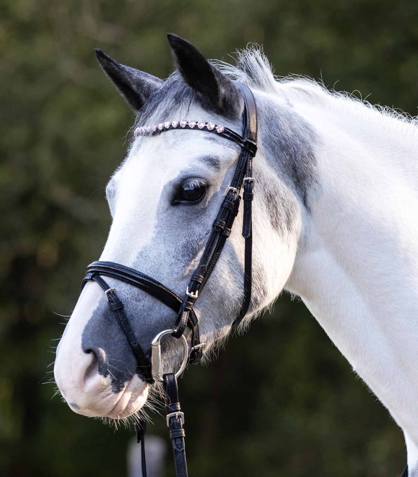 - Englisch kombiniertes Reithalfter - Gerades Genickstück - Gerades Stirnband mit Lack eingefasst und rosa Herzchen - Nasenriemen mit Lack überzogen - Nasenriemen und Stirnband weich unterlegt - Pflegeleichtes synthetisches Material - 16 mm Gurtzügel