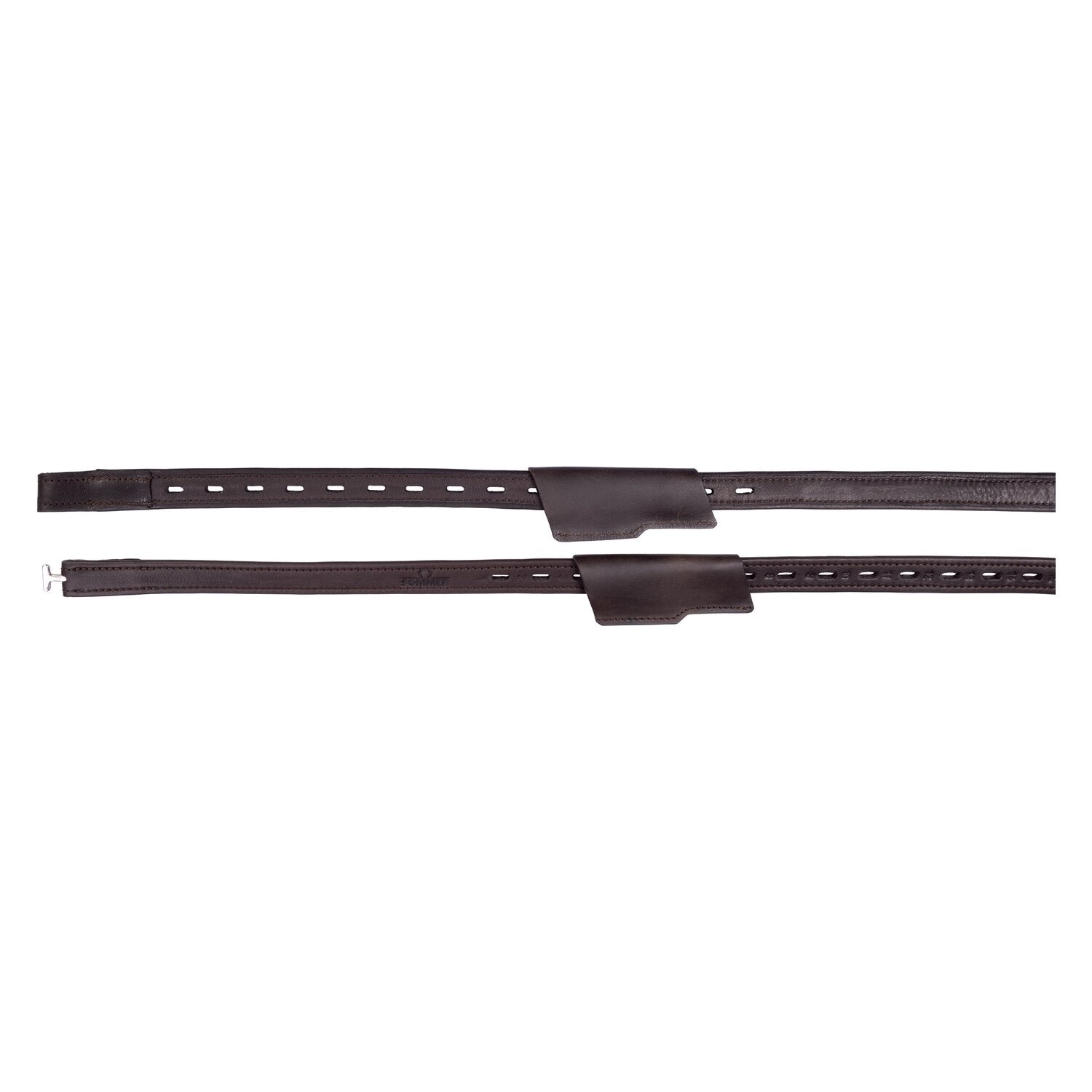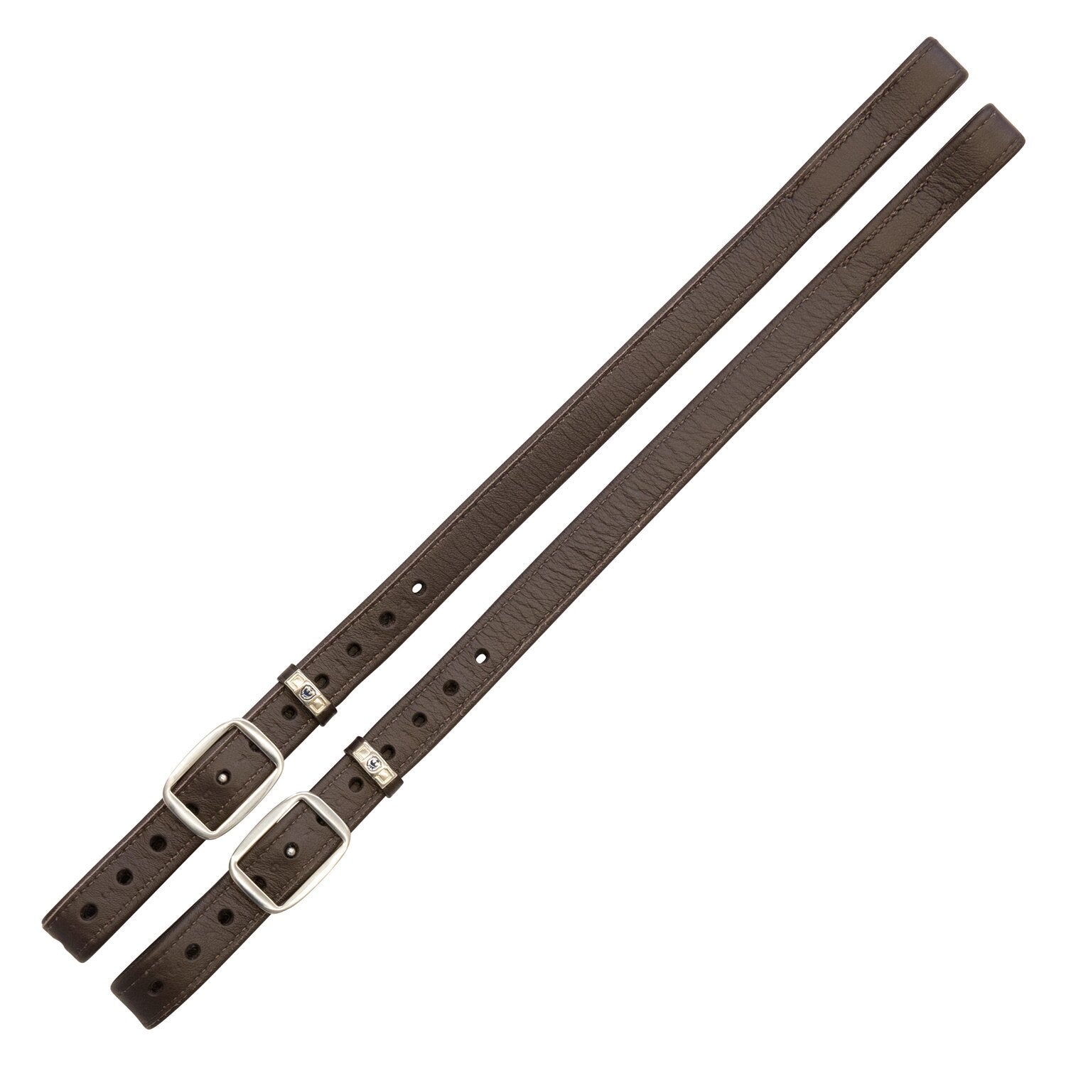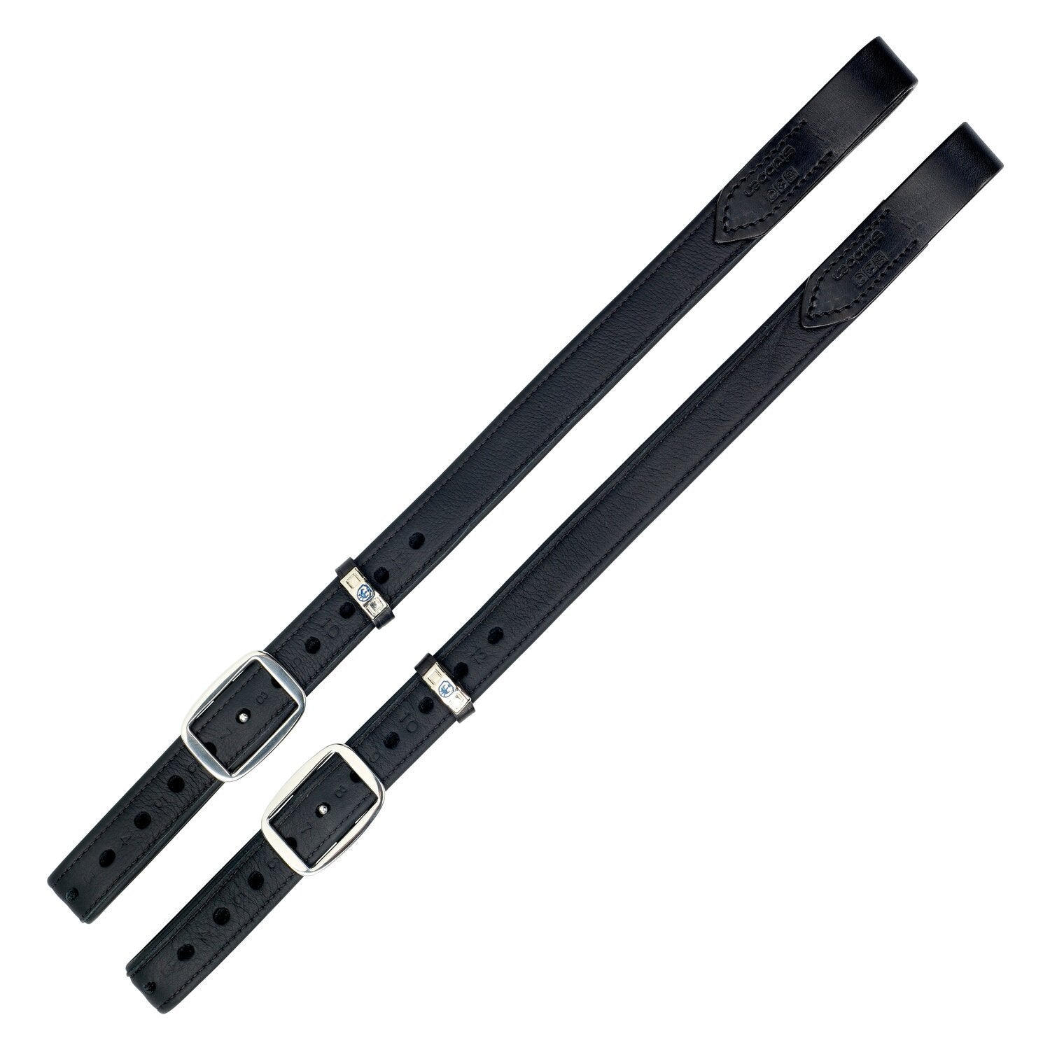Die Steigbügelriemen Mono de Luxe sind aus 3-fach eingeschlagenem, weichem und sehr abriebfestem Vachettenleder gefertigt. Dank der hoch strapazierfähigen Textilseele sorgt er für die entsprechende Sicherheit. Der Schnallbereich als auch die Riemenspitze sind aus hochwertigem Blankleder gefertigt, womit die Liebe zum Detail untermauert wird. Eine Besonderheit ist, dass das Paar immer aus einem linken und einem rechten Steigbügelriemen besteht. Dies ist deutlich im Bereich der Schnallkappe, die mit einem „L“ bzw. „R“ gekennzeichnet ist. Hiermit ist sichergestellt, dass bei richtigem Einschnallen am Sattel kein Risiko besteht, die Naht zu verletzen.