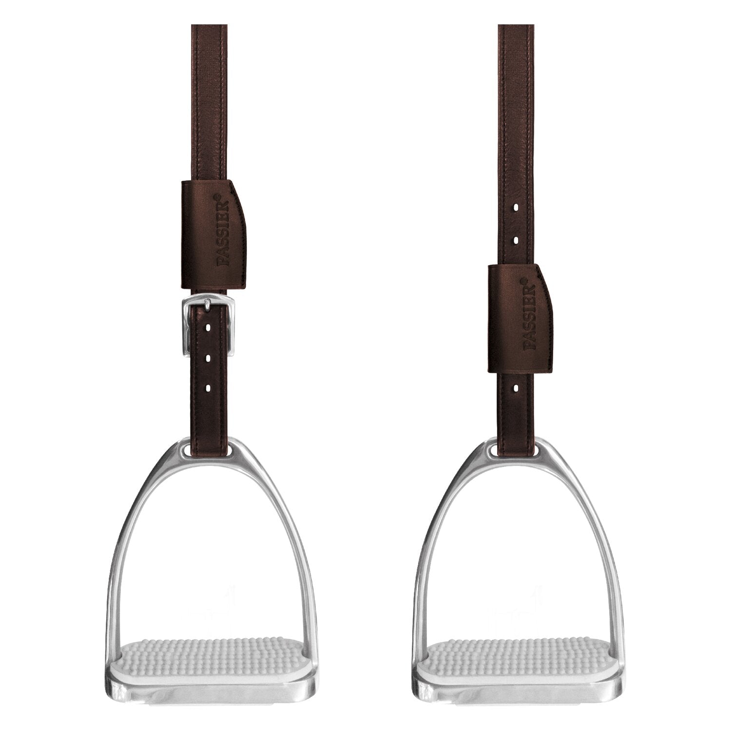 Die besonders schmalen und weichen Mono-Steigbügelriemen von PASSIER haben eine besonders flach gearbeitete Aufhängung und tragen in der Länge nicht doppelt auf. Deshalb sind sie weder unter dem Sattelblatt noch unter dem Bein der Reiterinnen und Reiter wirklich zu spüren. Aus europäischem Rindsleder mit Nyloneinlage für eine besonders hohe Stabilität. So können sich die Riemen auch bei starker Beanspruchung nicht verziehen. Dazu kommt, dass durch das „Velvet Touch“ Leder die Steigbügelriemen besonders weich sind. Die besonders geformten Edelstahlschnallen sorgen für eine glatte Führung und werden durch eine weiche Lederhusse geschützt. Dank sieben Löcher mit extra feinem Lochabstand lässt sich die Länge besonders exakt einstellen. Zur Befestigung lassen sie sich ganz einfach in die Steigbügelriemenaufhängung am Sattel einhängen. Sie haben zusätzlich oben ein Loch, damit man sie bei Nichtgebrauch hochschnallen kann. Länge ermitteln: - Man misst die Armlänge von der Achsel bis zu den Fingerspitzen, zieht ca. 15cm für den Steigbügel ab und rundet dann auf die nächste Größe auf bzw ab. - Eine Alternative wäre noch, dass du deinen fertig eingeschnallten Bügel am Sattel von der Sturtzfeder bis unten zum "Knick" misst und dann auf die nächste Länge auf- bzw abrundest, da die Mono Bügelriemenläge im eingeschnallten Zustand gemessen wird.