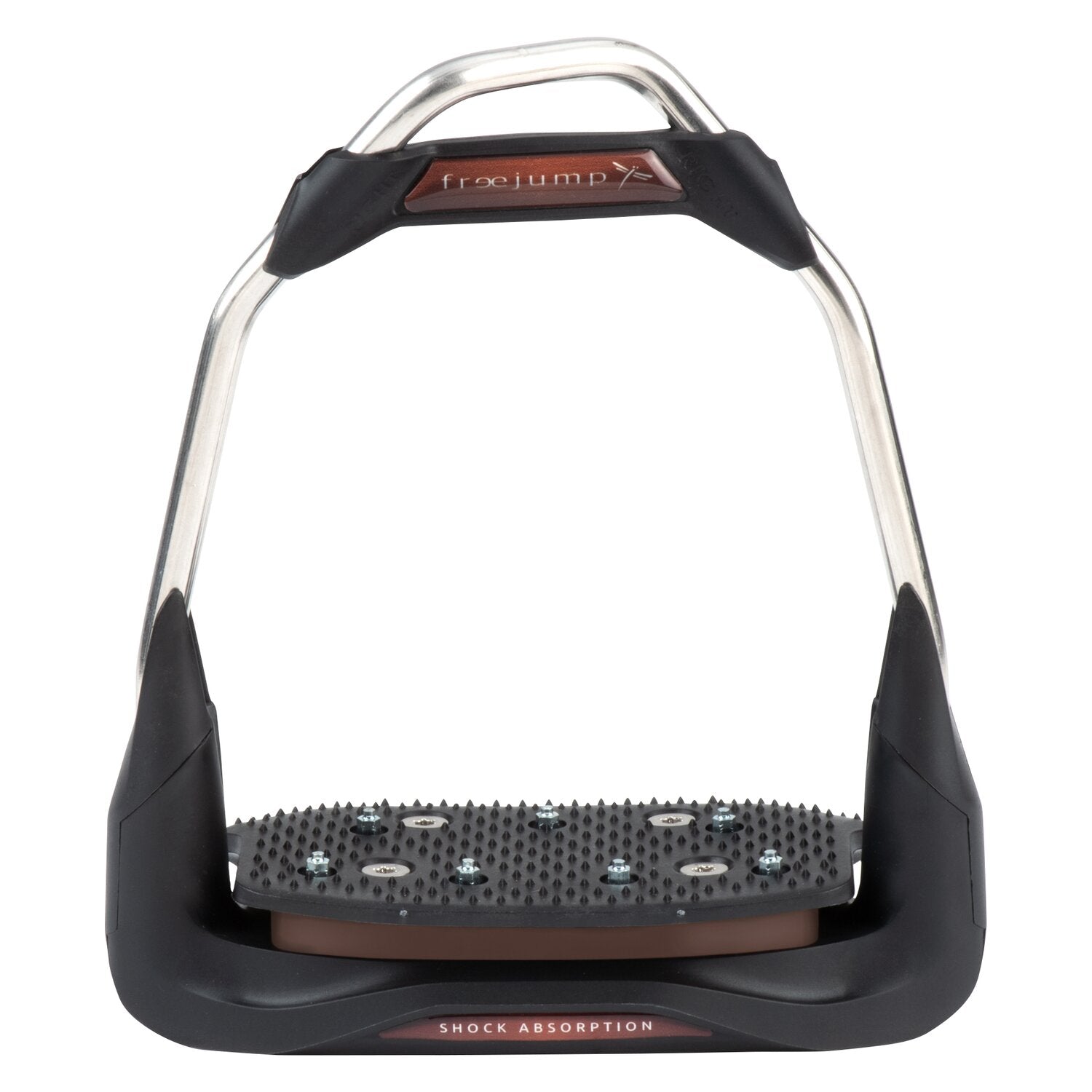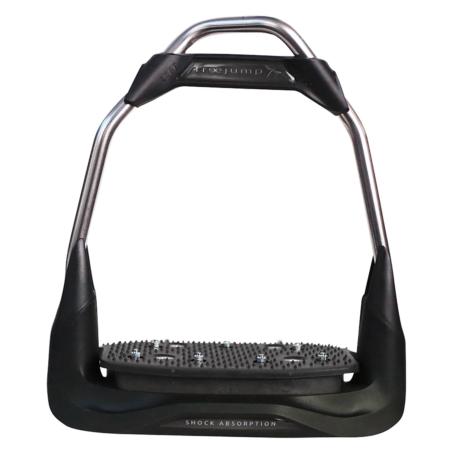 Die AIR’S Steigbügel von freejump bieten eine traditionelle Architektur (Edelstahlrahmen) mit technischen Eigenschaften für mehr Komfort, bessere Balance und optimierten Halt. Der obere Bügel aus Polyamid der Air’S Steigbügel ist so konzipiert, dass er sich bei starkem Druck löst, um die Freigabe des Fußes zu erleichtern. Eine vorgerückte Position des (rechten oder gerichteten) Auges des Steigbügels im Verhältnis zum Boden (flach oder geneigt) verschiebt den Schwerpunkt, um das Absenken der Fersen zu begünstigen. Das Auge des Steigbügels kann beim AIR'S entweder ausgerichtet oder gerade sein. - Gerichtetes Auge bringt echten Komfort und erleichtert das Anziehen bei einer Ausrichtung von 30°. - Gerades Auge: Auge parallel zum Boden fördert die Orientierung der Fußspitze nach innen. Die Trittböden bieten einen super Grip wobei die Integration von Kohlefaser eine unvergleichliche Haltbarkeit garantiert und die abnehmbaren Stahlspikes den Grip erhöhen.