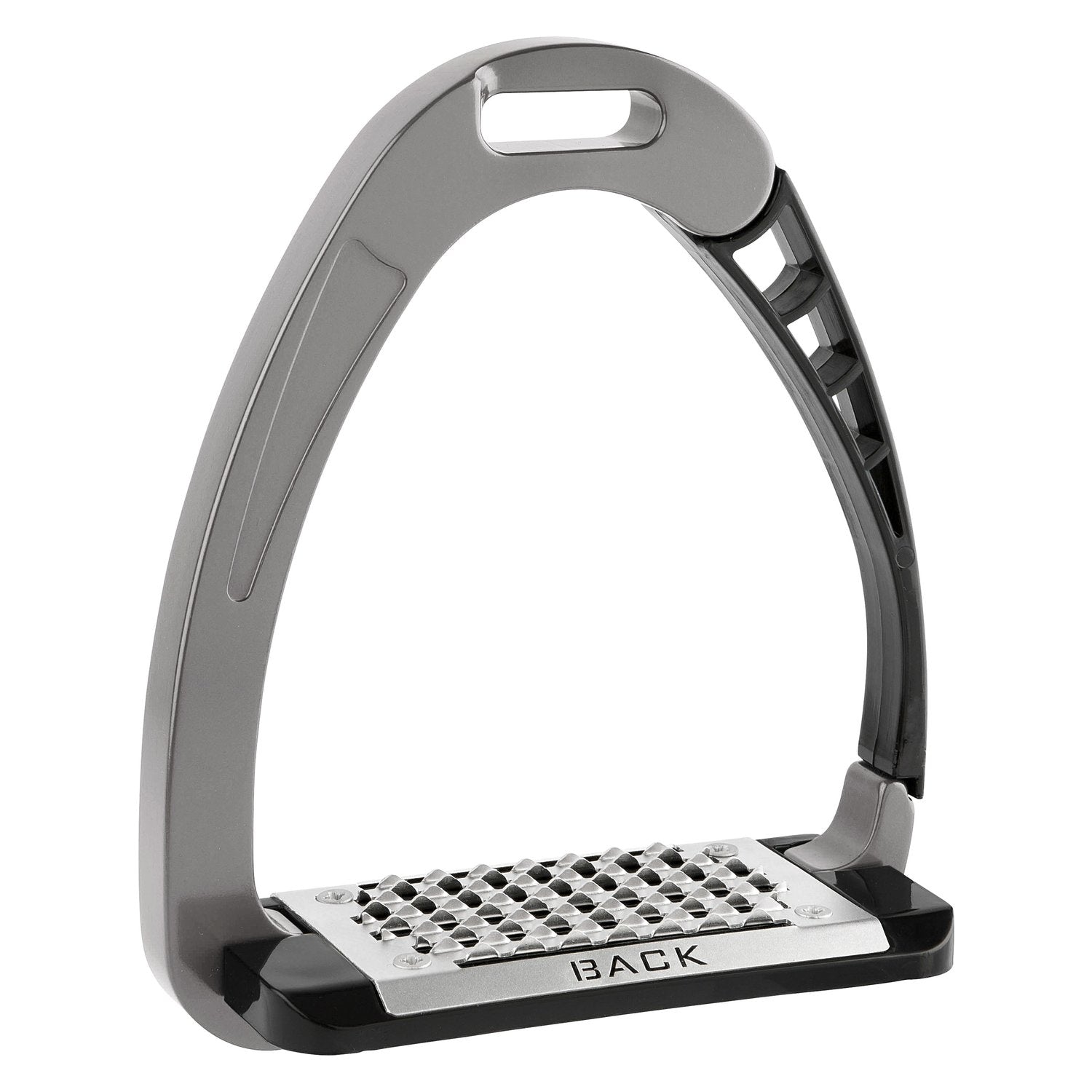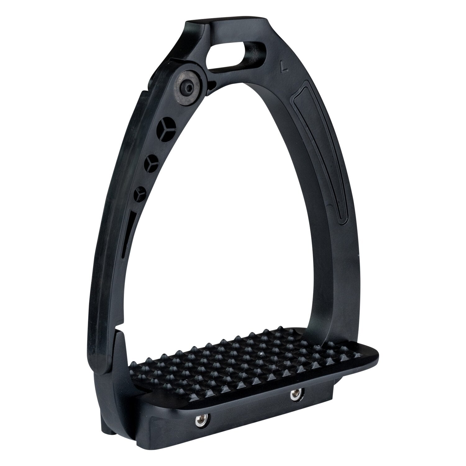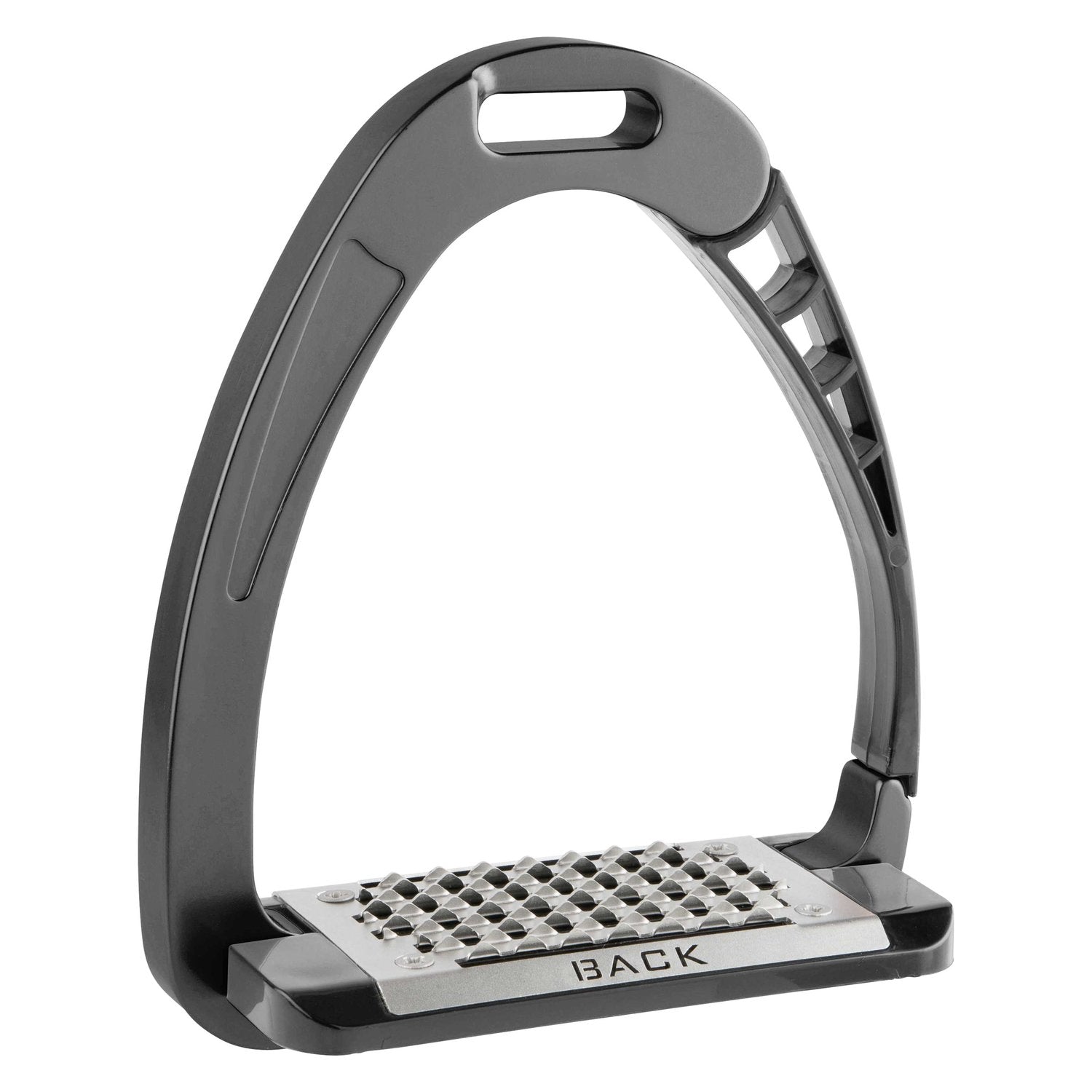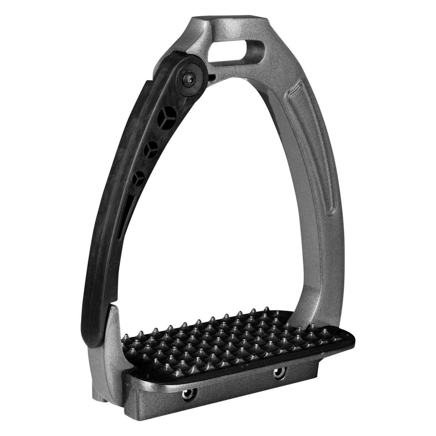 Verbesserte Ausführung! Einarmiger Sicherheitssteigbügel aus gehärtetem Federstahl mit sehr hoher mechanischer Festigkeit und Elastollan-Umspritzung. Der besonders komfortable und sichere Steigbügel unterscheidet sich vom klassischen Steigbügel SOFT´UP Pro durch die ca. 27 % größere Fußplatte (1,6 cm breiter) mit außergewöhnlichem Grip. Der Einsatz von Kohlefaser garantiert eine unvergleichliche Langlebigkeit. Die abnehmbaren Stahlstollen verstärken den Grip-Effekt und können ausgetauscht werden. Der elastische äußere Arm aus Elastollan ist so konzipiert, dass er bei einem Sturz den Fuß leichter befreit und sich unter dem Druck des Fußes öffnen kann. Die Monobranche-Technologie ermöglicht es, die auf jeden Steigbügel einwirkende Kraft um das Dreifache zu reduzieren und die Gelenke des Reiters und den Rücken des Pferdes zu entlasten. Tritt: ca. 12 cm