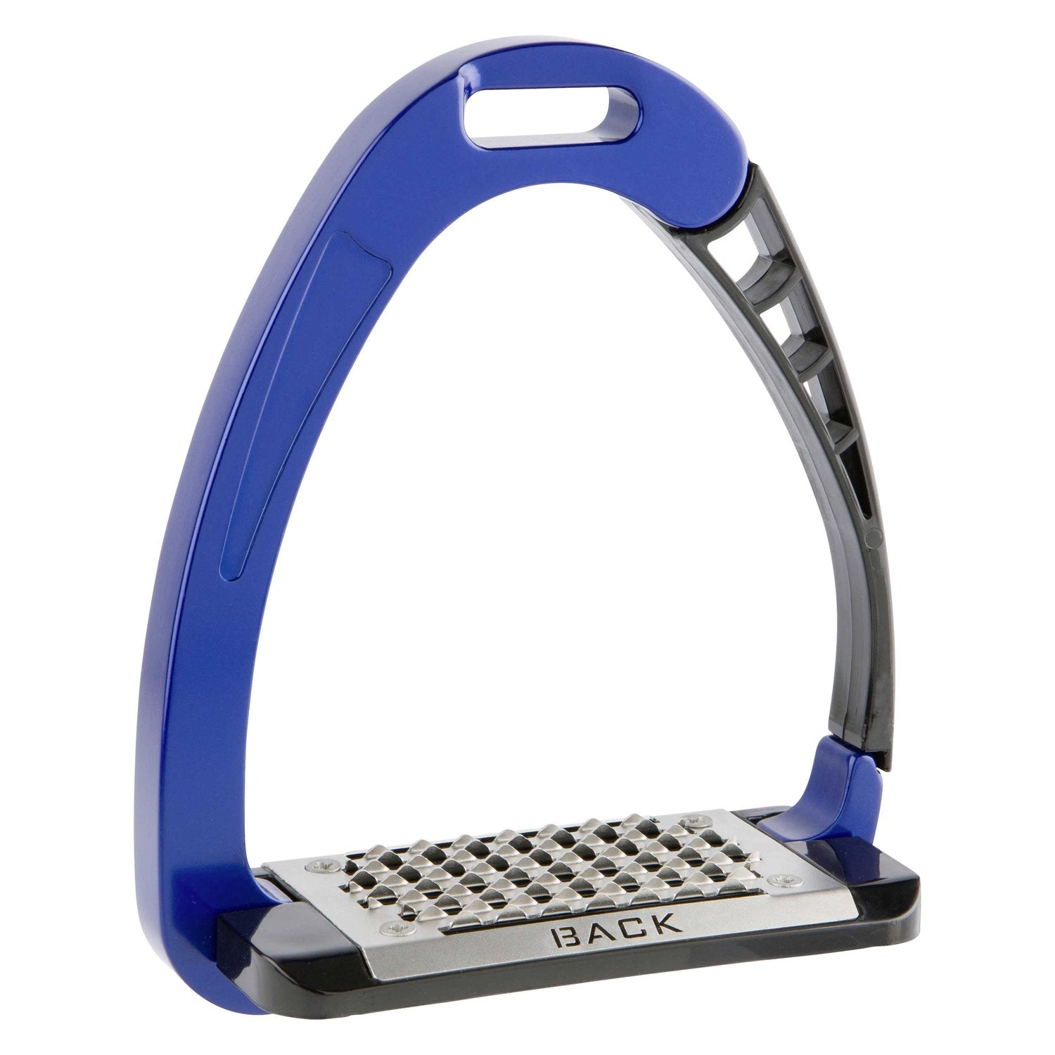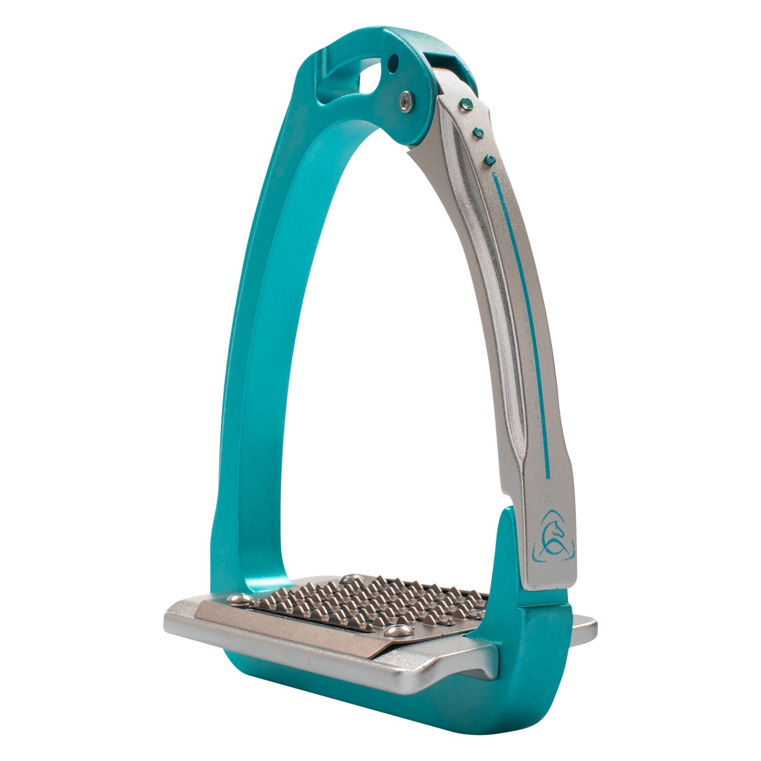 Die neu gestalteten Steigbügel Aluplus 2.0 von ACAVALLO vereinen die technischen Eigenschaften der patentierten, seitlich öffnenden Arena Alupro Steigbügel mit einem kompletten Aufbau aus geprüftem, hochwertigem, eloxiertem Aluminium. Dieses Material verleiht nicht nur ein schlichtes und elegantes Aussehen, sondern ist auch leicht und äußerst widerstandsfähig. Darüber hinaus verfügen die Steigbügel über eine kugelgestrahlte Oberfläche, die die Lebensdauer der Metallteile verbessert. Der obere Teil des Trittbretts ist aus rostfreiem Stahl und zeichnet sich durch lange horizontale Löcher aus, die die Ansammlung von Sand und Schmutz verhindern, um einen optimalen Halt unter allen Bedingungen zu gewährleisten. Edelstahl schützt außerdem vor Korrosion und garantiert somit eine lange Lebensdauer des Produkts. Die Öffnung des kraftbetätigten Verriegelungs- und Entriegelungsmechanismus befindet sich einen cm über der Trittfläche, um sicher zu stellen, dass der Fuß nicht versehentlich seitlich herausrutschen kann und um zu verhindern, dass Sand und Schmutz im Notfall die Öffnungsbewegung des Arms verzögern. Das um 5° geneigte Trittbrett hilft dem Reiter, die richtige Haltung einzunehmen und entlastet Knöchel, Waden, Knie und Hüfte. Drei Glitzersteinchen am Arm, passend zur Steigbügelfarbe highlighten die Steigbügel. Tritt: ca. 12,5 cm