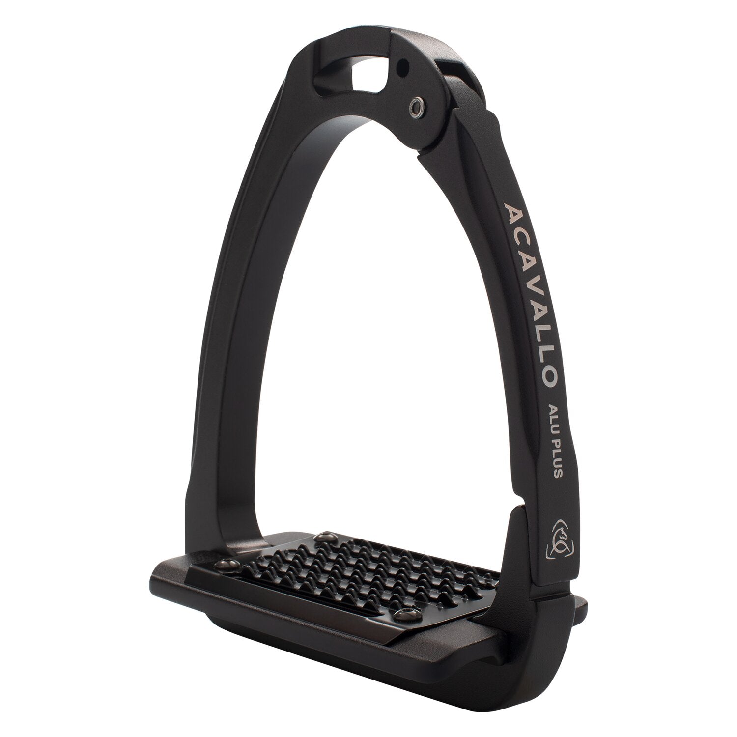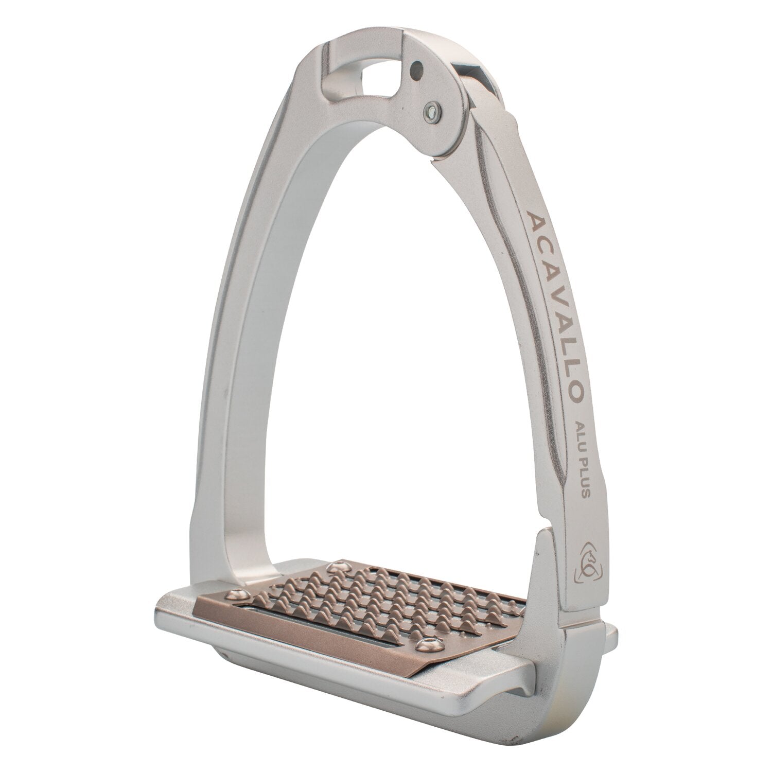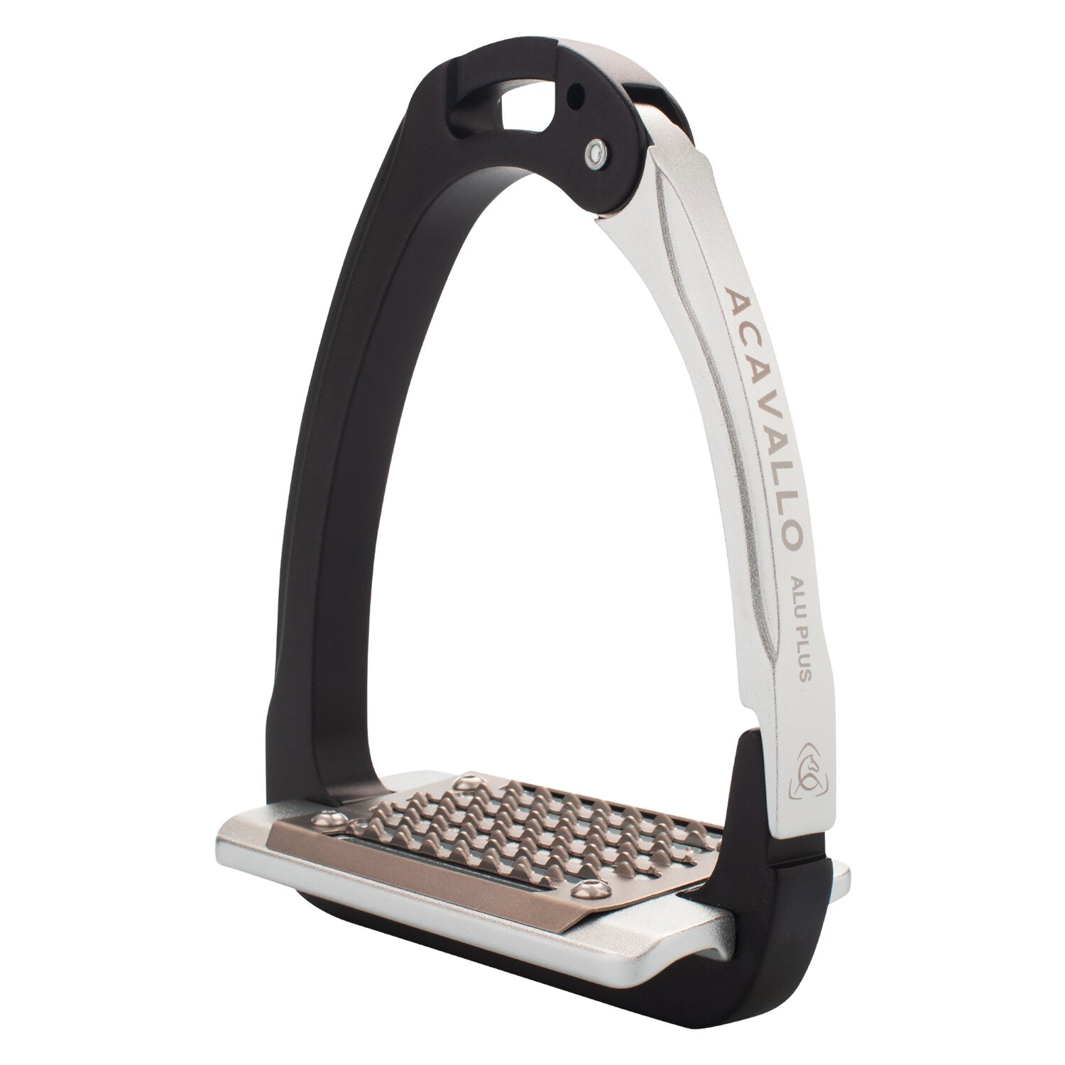 Die neu gestalteten Steigbügel Aluplus 2.0 von ACAVALLO vereinen die technischen Eigenschaften der patentierten, seitlich öffnenden Arena Alupro Steigbügel mit einem kompletten Aufbau aus geprüftem, hochwertigem, eloxiertem Aluminium. Dieses Material verleiht nicht nur ein schlichtes und elegantes Aussehen, sondern ist auch leicht und äußerst widerstandsfähig. Darüber hinaus verfügen die Steigbügel über eine kugelgestrahlte Oberfläche, die die Lebensdauer der Metallteile verbessert. Der obere Teil des Trittbretts ist aus rostfreiem Stahl und zeichnet sich durch lange horizontale Löcher aus, die die Ansammlung von Sand und Schmutz verhindern, um einen optimalen Halt unter allen Bedingungen zu gewährleisten. Edelstahl schützt außerdem vor Korrosion und garantiert somit eine lange Lebensdauer des Produkts. Die Öffnung des kraftbetätigten Verriegelungs- und Entriegelungsmechanismus befindet sich einen cm über der Trittfläche, um sicher zu stellen, dass der Fuß nicht versehentlich seitlich herausrutschen kann und um zu verhindern, dass Sand und Schmutz im Notfall die Öffnungsbewegung des Arms verzögern. Das um 5° geneigte Trittbrett hilft dem Reiter, die richtige Haltung einzunehmen und entlastet Knöchel, Waden, Knie und Hüfte. Tritt: ca. 12,5 cm