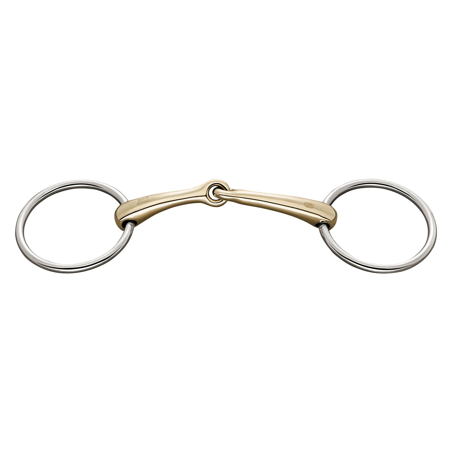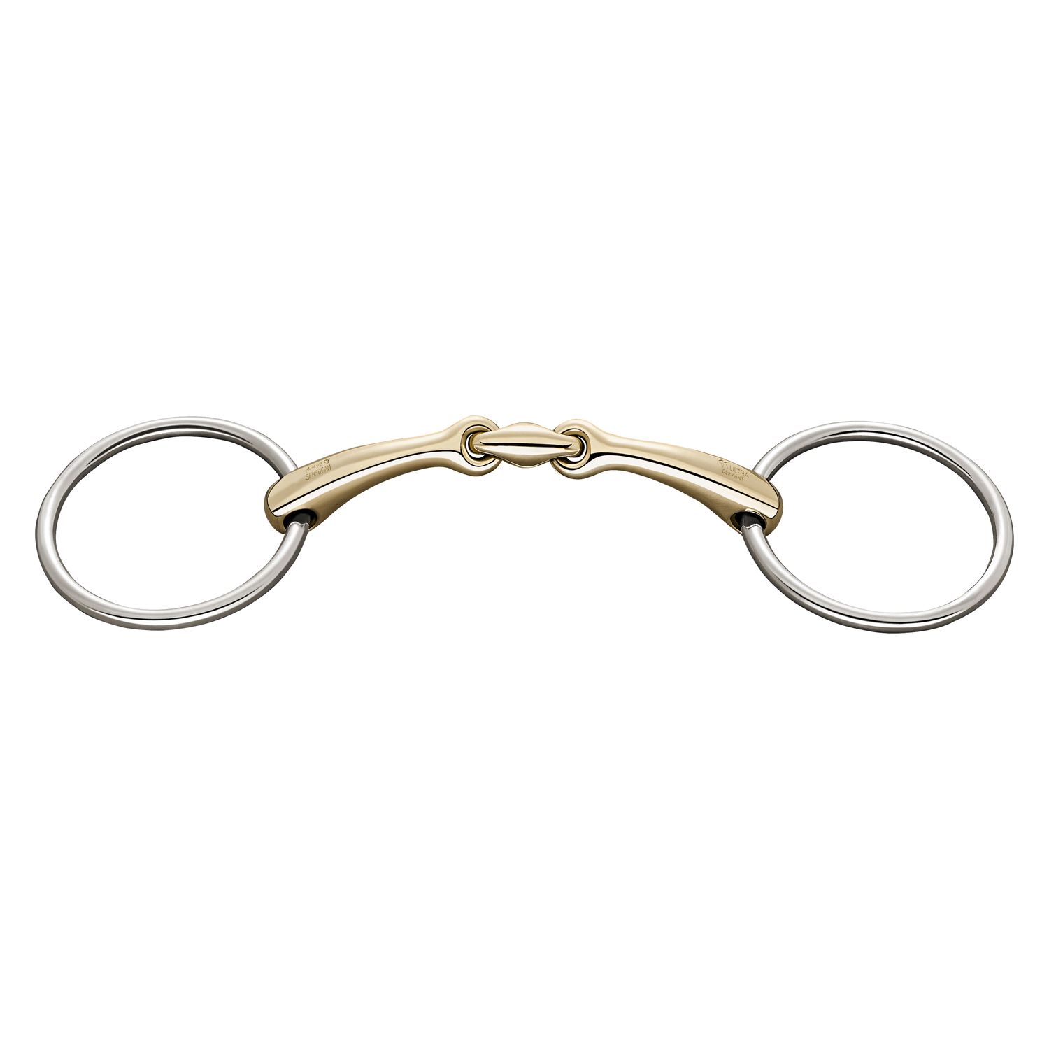 Einfach gebrochen. Das Gebiss zeichnet sich durch die ergonomische Form, die eine gleichmäßige Druckverteilung auf die Zunge ermöglicht, aus. Das Sensogan-Mittelstück ist um 45° nach vorne geneigt und liegt passgenau zwischen Zunge und Gaumenbogen. Somit wir eine weiche aber effektive Hilfengebung ermöglicht. Ideal für sensible Pferde oder Pferde mit fleischiger Zunge. Durch das fixierte Seitenteil ist eine direkte Übertragung der Zügelhilfe auf Zunge und Unterkiefer möglich. Liegt ruhig im Pferdemaul, ist maulwinkelschonend. Mit Edelstahl-Ringen.