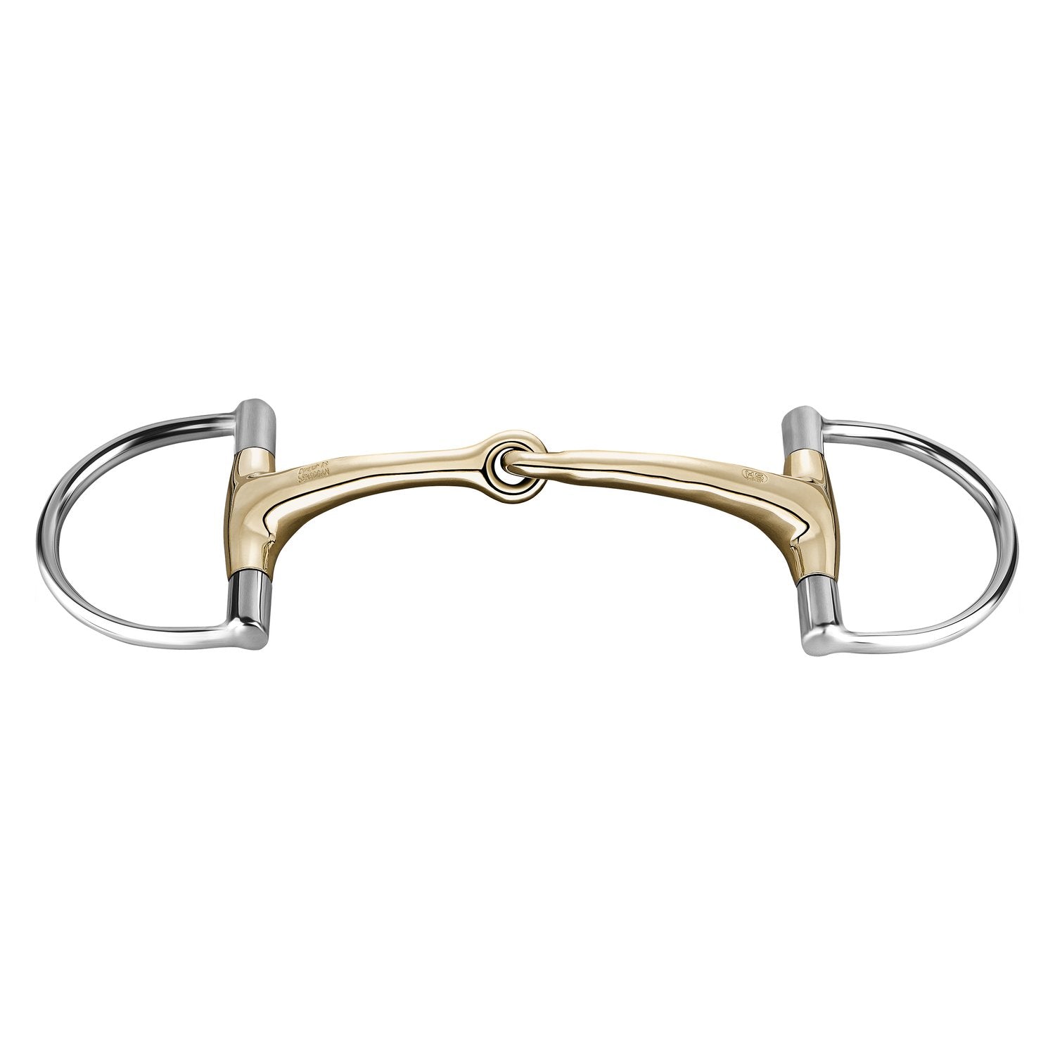 Doppelt gebrochen. Die ergonomische Form gewährleistet eine geleichmäßige Druckverteilung auf die Zunge. Das Mittelstück ist um 45° nach vorne geneigt und liegt anatomisch korrekt zwischen Zunge und Gaumenbogen. Ermöglicht eine weiche und effektive Hilfengebung, ist maulwinkelschonend und fördert eine vertrauensvollen Anlehnung. Die D-Ring Seitenteile verhindern, dass das Gebiss durch das Pferdemaul gezogen wird. Das Sensogan Mittelstück regt die Kautätigkeit an. Mit D-förmigen Edelstahlringen.