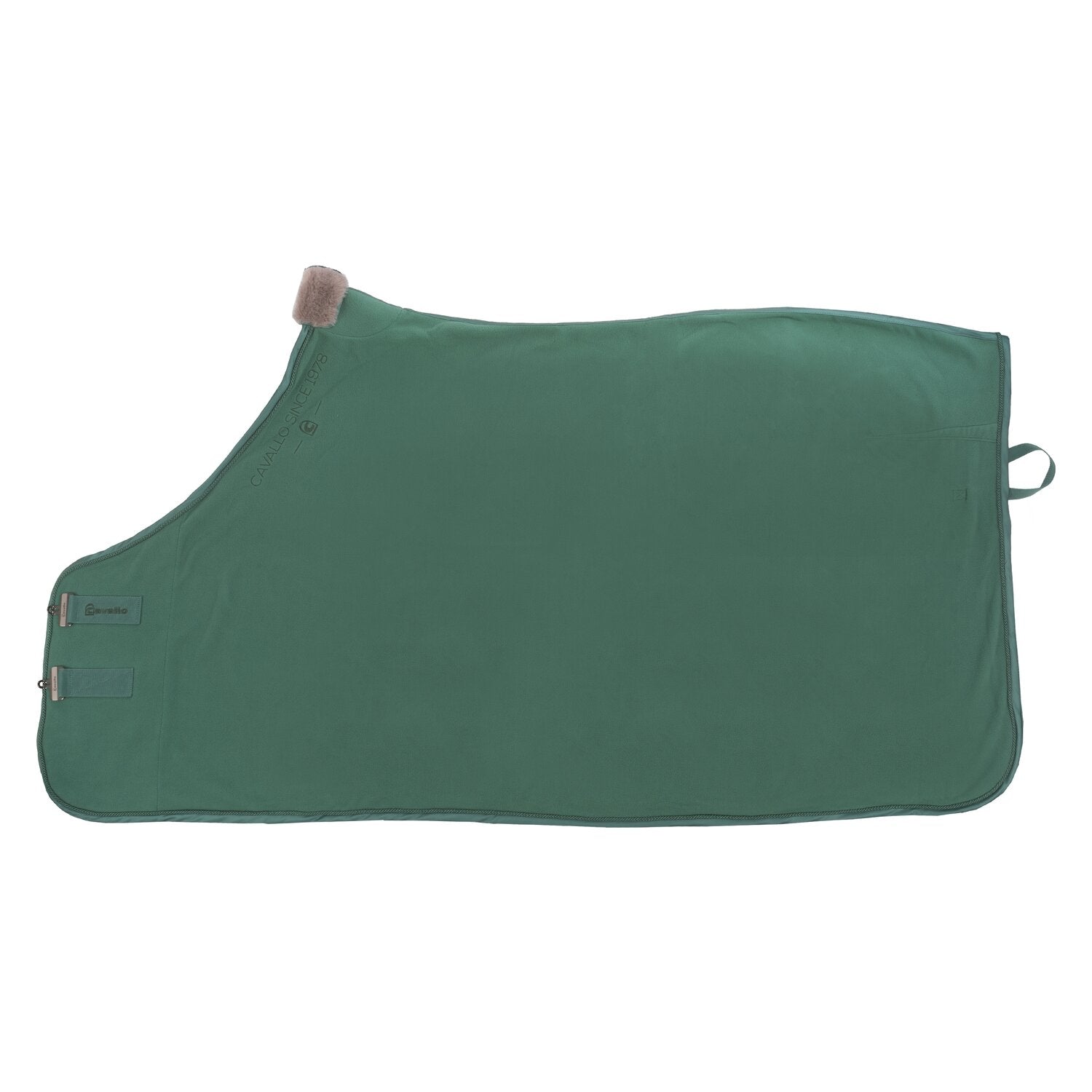 Cavallo präsentiert eine edle Abschwitzdecke aus hochwertigem Antipilling Fleece, das durch den Kunstfell-Kragen im Bereich des Widerristes aufgewertet wird. Zwei Drehhakenverschlüsse mit ausgefrästem Cavallo-Logo in Gunmetal garantieren in Kombination mit dem abnehmbaren Schweifband einen sicheren Halt der Decke. Durch die aufwendige Cavallo-Logo-Stickerei am Halsausschnitt und im hinteren Bereich wie auch durch die kontrastfarbene Kordeleinfassung gewinnt die Decke an Attraktivität.