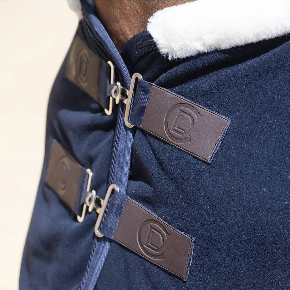Die Stalldecke aus der Cheval de Luxe Kollektion punktet in allen Bereichen. Auch mit funktionellen Details steht die Decke Ihrem Pferd zur Seite. Neben dem strapazierfähigen, glatten Steppmaterial garantiert die 150 g Füllung in Kombination mit dem Fleece-Innenfutter wohlige Wärme. Die Krönung ist der Kunstfellkragen, der einen reibungslosen Tragekomfort verspricht. Der T-Brustverschluss mit zusätzlichem Klett, die Kreuzbegurtung sowie die verstellbaren Beinschlaufen und der Schweifriemen zählen zu den Features für einen rutschfesten Sitz. Gehighlightet wird die Stalldecke durch die umlaufende Kordel und das markentypische Emblem vorne links.