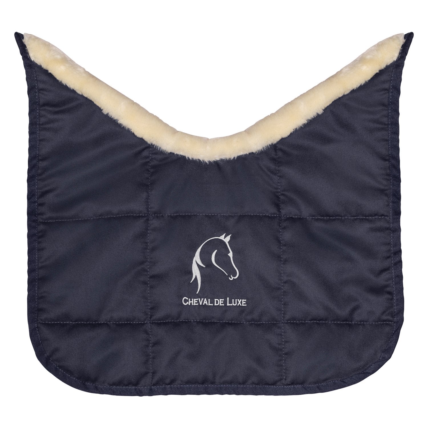 Der effektive Brustschutz Rug Big aus der Cheval de Luxe Kollektion schützt den empfindlichen Brustbereich deines Pferdes optimal vor Reibung und Scheuerstellen. Dazu werden die beiden Lagen einfach über die Decke im Verschlussbereich geschoben. Dadurch liegt eine Lage des Brutschutzes polsternd direkt auf dem Pferdefell auf und bietet so idealen Schutz und mollige Behaglichkeit. Die Oberkante des Brustschutzes ist mit weichem Synthetikfell abgepolstert. Das flauschige Material bietet ein komfortables Tragegefühl und schützt zusätzlich vor Reibung. Das Rug Big ist für alle Decken passend.