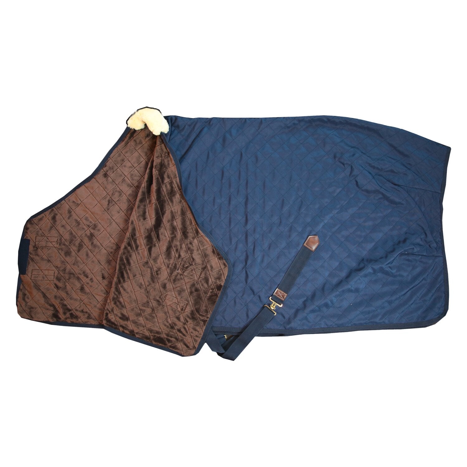 Die kuscheligste Decke für dein Pferd, die du an alle Bedürfnisse anpassen kannst! Das Besondere an dieser kuscheligen und hautfreundlichen Unterdecke ist, dass sie sich perfekt für Pferde mit empfindlicher Haut eignet. Sie wird mit einem Halsteil geliefert, das wie die Decke mit veganem Kaninchenfell gefüttert ist und so konzipiert ist, dass es keinen zusätzlichen Druck auf den Widerrist ausübt. Das Halsteil wird mit einem doppelten Klettverschluss an der Decke befestigt. Die Außenseite der Unterdecke Skin Friendly ist aus einem Polyester-Mikrofaser Material gefertigt. Das Garn in diesem Stoff wurde so gesponnen, dass es einen Baumwolltouch erzeugt. Dieses bildet zusätzlich eine Isolierschicht, die die Körperwärme deines Pferdes einspeichert und zugleich einen Glanzeffekt auf dem Fell deines Pferdes erzeugt. Die 150 g Faserfüllung hat die gleichen Vorteile wie Daunen, nimmt aber im Gegensatz zu diesen keinen Geruch auf. Damit die Decke sich nicht mit Feuchtigkeit vollsaugen kann ist sie etwas kürzer als andere Decken geschnitten. Geschlossen durch einen Frontverschluss mit Klett. Am hinteren Ende sind zwei D-Ringe zur Befestigung einer Schweifkordel versehen. Zur Befestigung des Halsteils wird ein doppelter Klettverschluss verwendet.