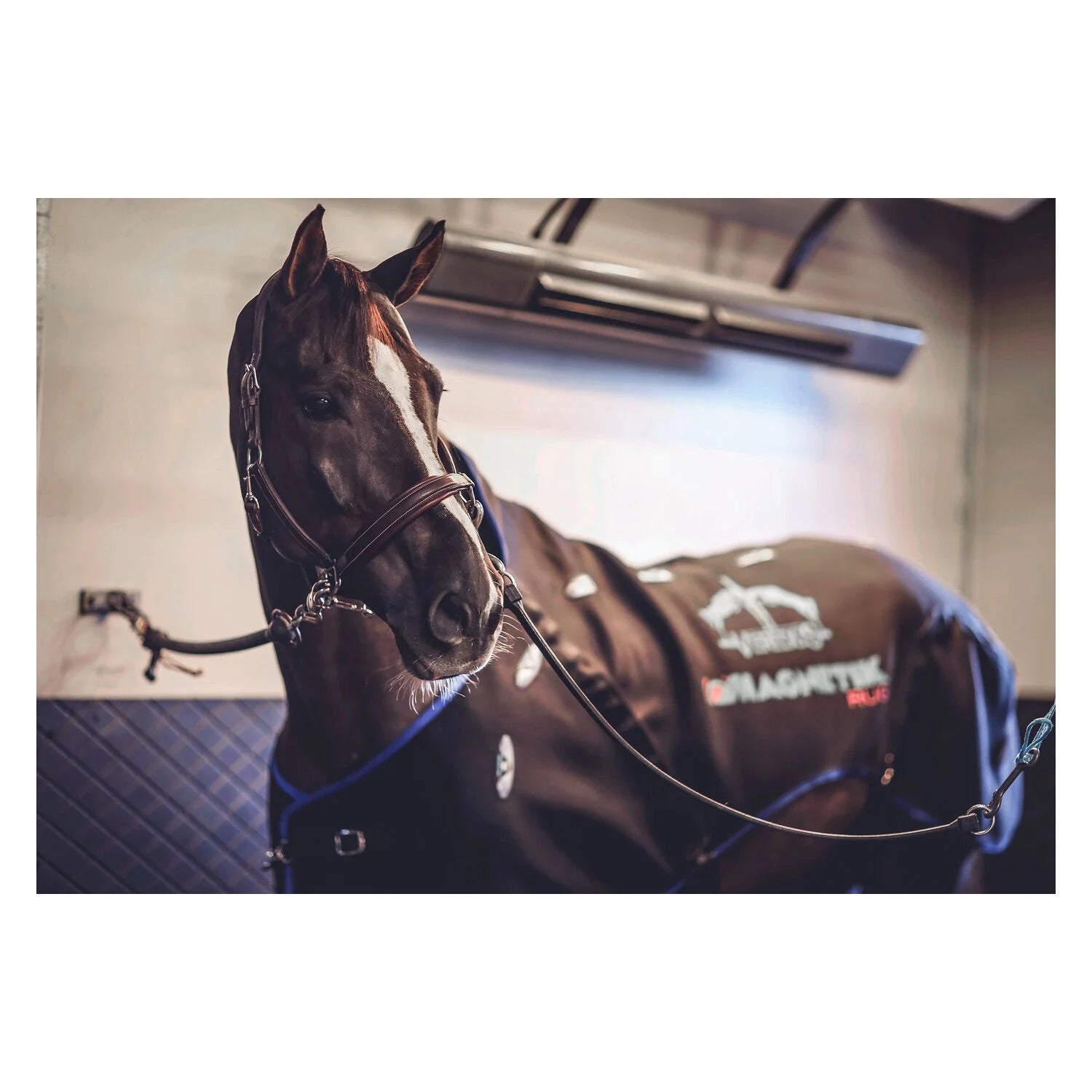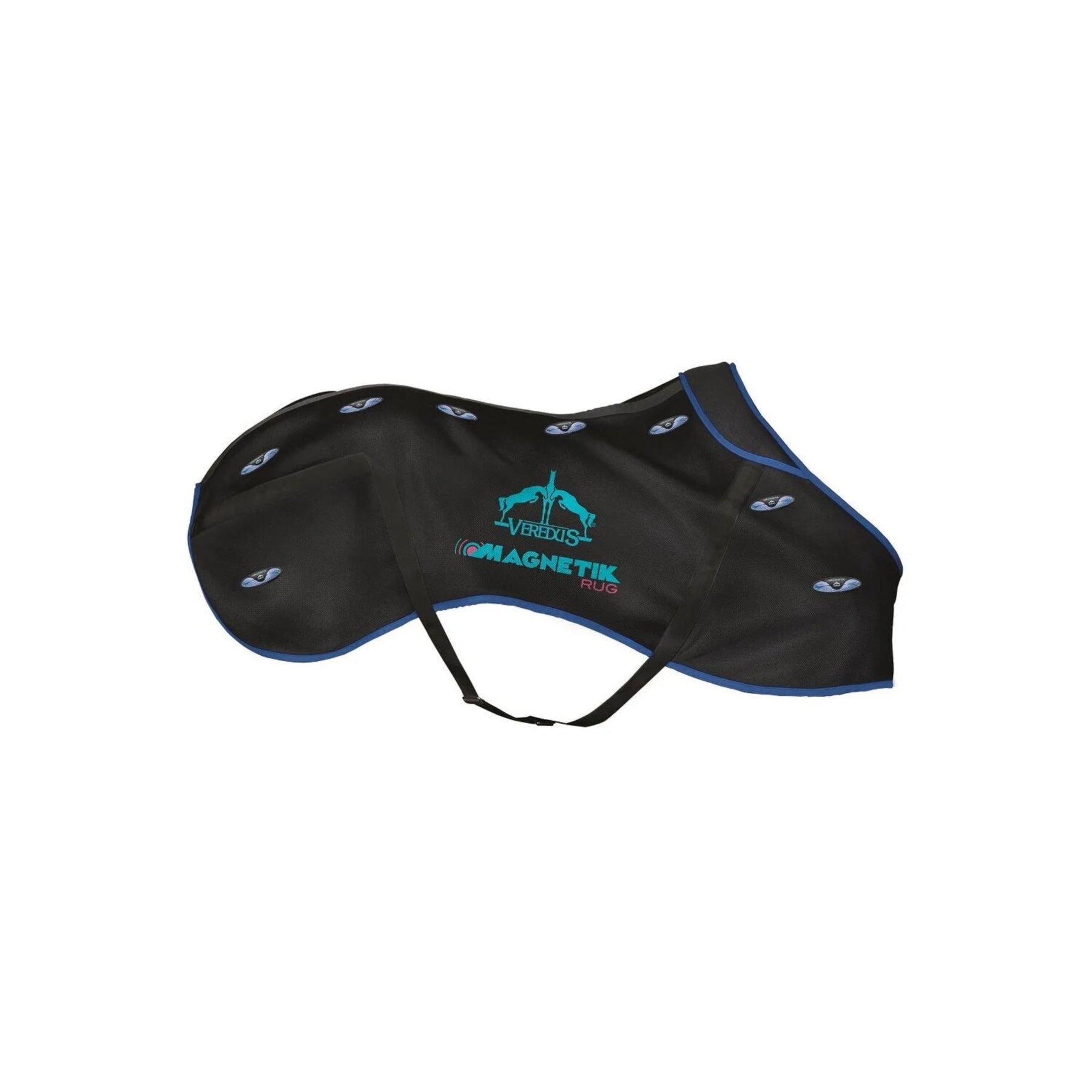 Die VEREDUS Magnetfelddecke ist eine therapeutische Pferdedecke mit anatomischem Schnitt, die eine optimale Passform im Rücken- und Schulterbereich garantiert. Sie arbeitet mit 32 Neodymium-Magneten, die jeweils 2400 Gauss Leistung entwickeln und gezielt in der Lenden-Rücken- sowie Schulterpartie platziert sind. Hergestellt aus atmungsaktivem Aerox-Material und eingefasst in Lycra, unterstützt die Decke die Blutzirkulation, kann Schmerzen und Schwellungen reduzieren und den Heilungsprozess aktiv fördern. Sie eignet sich als Alleindecke oder Unterdecke und kann zur Vorbereitung auf körperliche Anstrengung der Muskeln und Sehnen verwendet werden.