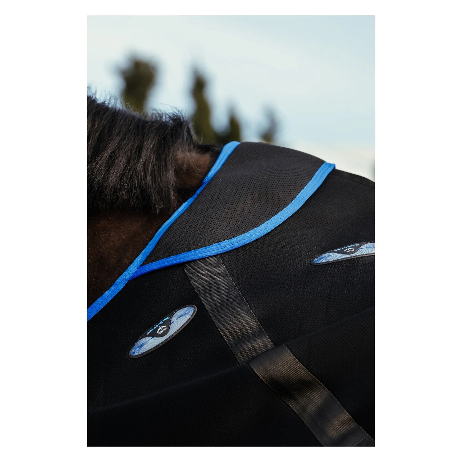 Der RAMBO Airmax Liner ist ein toller Allrounder unter den Unterdecken. Aus hochwertigem Airmesh-Gewebe in 3D-Struktur, das eine weiche, feuchtigkeitsabsorbierende Innenseite hat. Die 3D-Struktur hält das Pferd bei niedrigen Temperaturen warm und bleibt bei warmem Wetter atmungsaktiv. Der Liner wird im Halsbereich mit Klettverschluss-Schlaufen an der Außendecke sowie an den hinteren Enden mit Clips befestigt, so dass er nicht verrutschen kann. Das Airmesh Material dieser Unterdecke macht es möglich, dass die Unterdecke auch auf ein noch feuchtes Pferd gelegt werden kann, da das Material die Feuchtigkeit absorbiert - ein Umdecken nach der Arbeit entfällt!