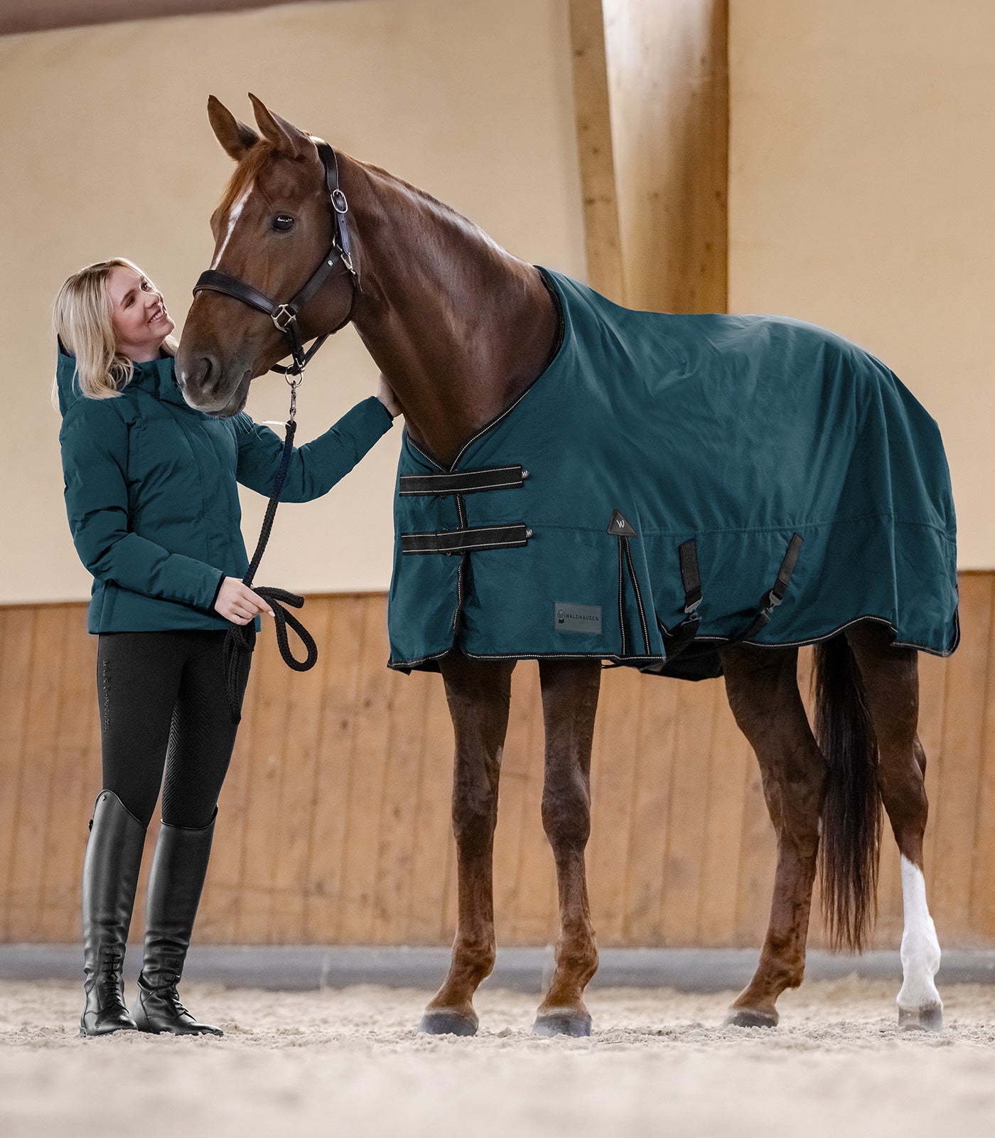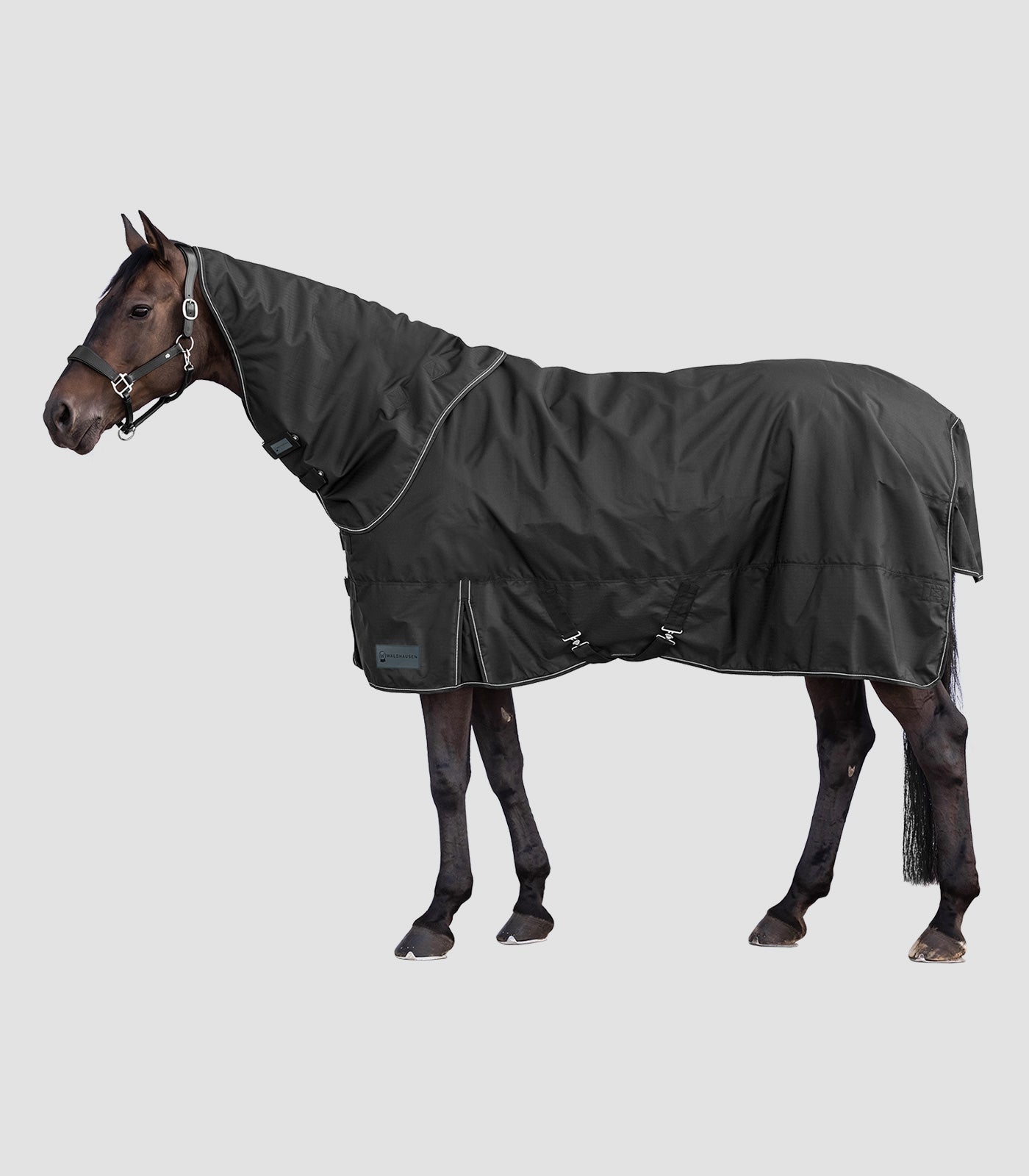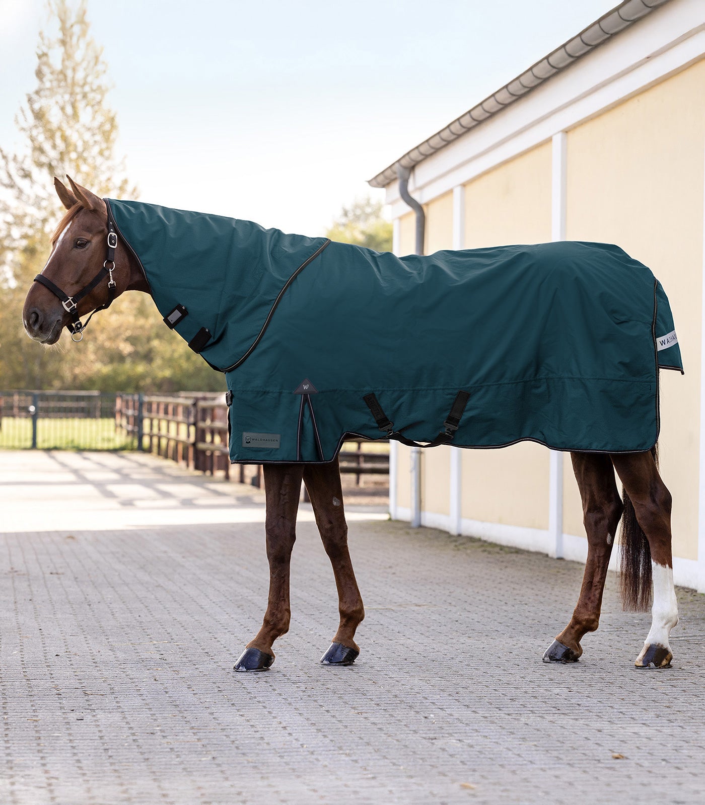 Mit der Waldhausen Nordic Outdoordecke bieten Sie ihrem Pferd einen optimalen Outdoor-Komfort an kühlen Tagen. Die doppelten T-Frontverschlüsse sorgen für eine gute Passform. Das Einfassband mit reflektierenden Details erhöht die Sichtbarkeit bei schlechten Lichtverhältnissen. Bewegungsfreiheit ist durch die Gehfalte gegeben. Das 600 Denier Außenmaterial ist strapazierfähig und hält ihr Pferd warm und trocken.