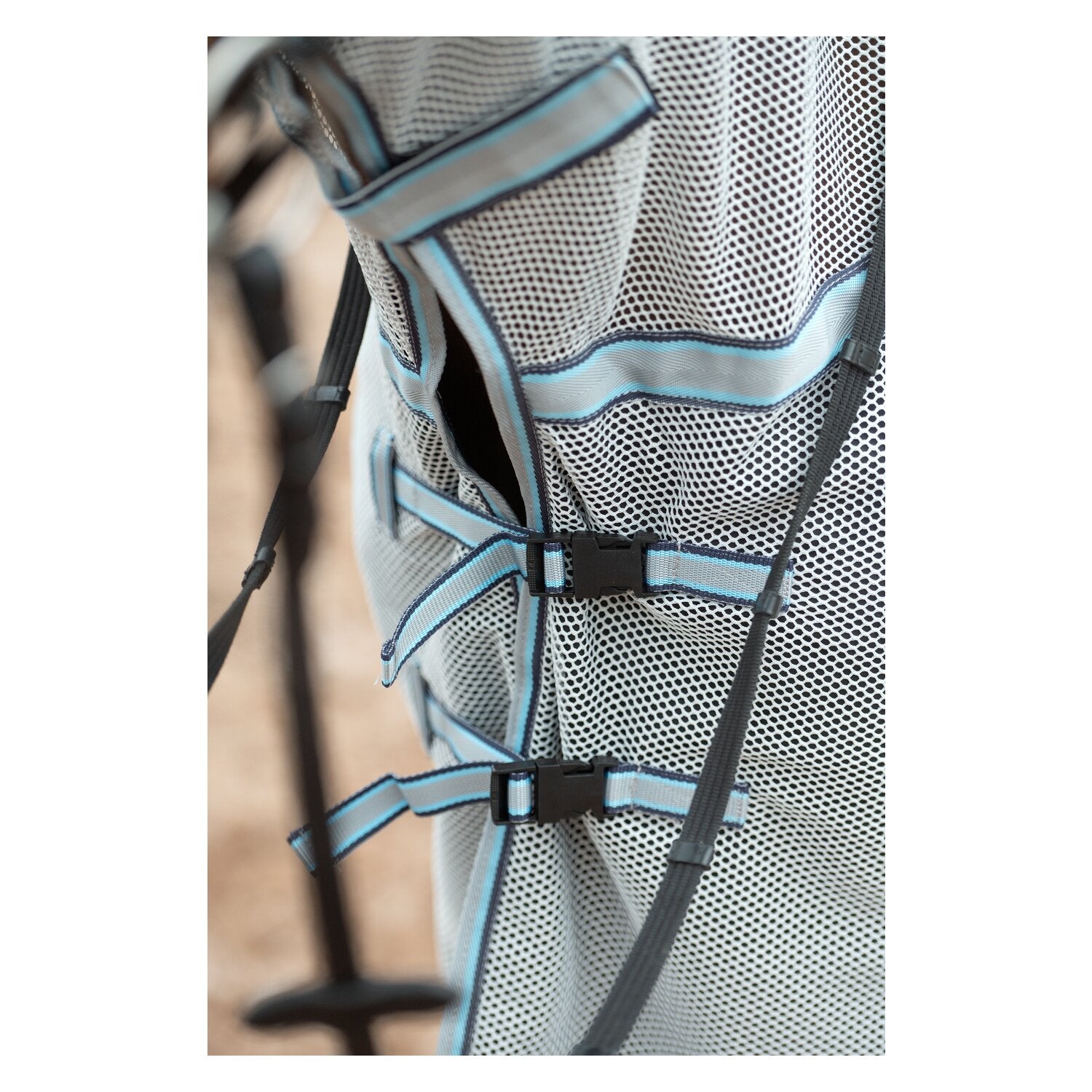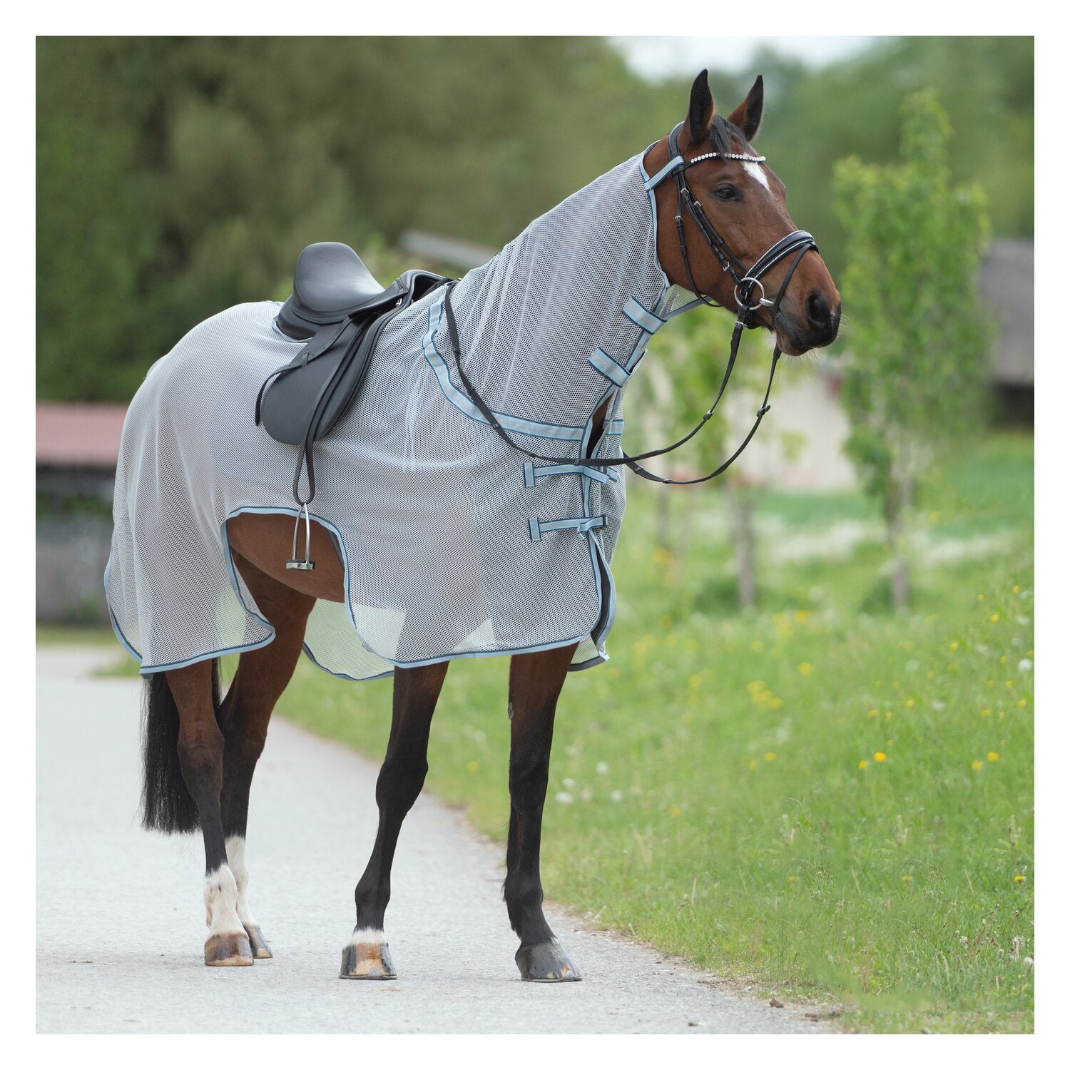 Speziell für größer gebaute Pferde. Aus engmaschigem Polyester-Netzmaterial, das dein Pferd vor lästigen Fliegen und Insekten schützt. Durch die Elastikeinfassung am Halsausschnitt, die Fleecepolsterung am Widderrist und die langen Gehfalten wird bester Tragekomfort mit viel Bewegungsfreiheit garantiert. Für einen rutschfesten Sitz ist die Decke mit zwei Brustschnallen, Kreuzbegurtung mit Elastikeinsatz, verstellbaren Beinschnüren mit Karabiner und einer Schweifkordel ausgestattet.