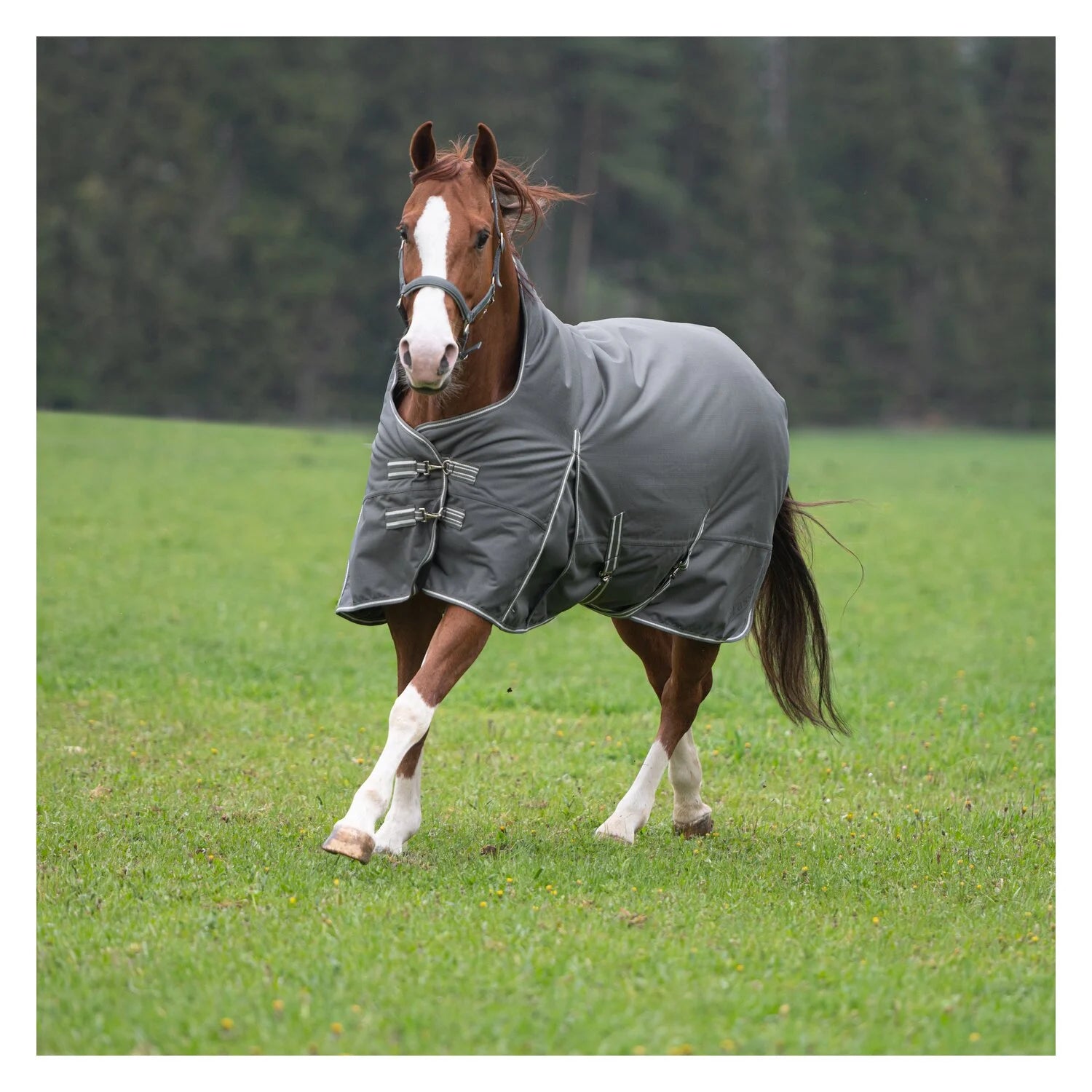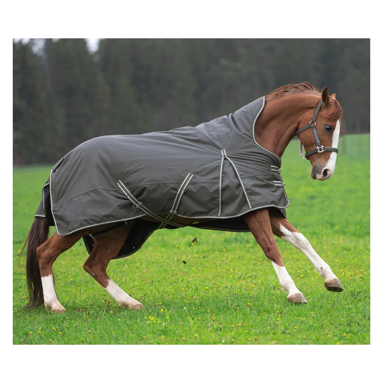 Für vielseitiges Eindecken bei wechselnden Wetterbedingungen! Die Weidedecke von HORSEWARE wurde nachhaltig mit einem natürlichen, pflanzlichen Farbstoff gefärbt. Das Wasser, das beim Färbeprozess verwendet wird, kann recycelt und wiederverwendet werden, sodass kein Abwasser entsteht. Aus 1200 Denier Polyester-Außenmaterial, das besonders atmungsaktiv, wasserdicht und reißfest ist, während das glanzgebende Innenfutter Scheuerstellen vermeidet und ein gesundes Fell fördert. Für mehr Komfort beim Grasen sind der V-Brustverschluss und der Surefit-Halsausschnitt verantwortlich. Diese reduzieren den Druck auf die Schulter und verhindern Reibung. Zudem sorgen drei Kreuzgurte und der Schweifriemen für einen sicheren Sitz. Mehr Bewegungsfreiheit und eine maximale Bauchabdeckung entstehen durch die doppelten Beinausschnitte. Inklusive abnehmbarem Halsteil, das durch Klettverschlüsse angepasst werden kann. Reflektierende Details schützen dich und dein Pferd bei Nacht und in der Dämmerung. Mit dem HORSEWARE Liner System kompatibel.