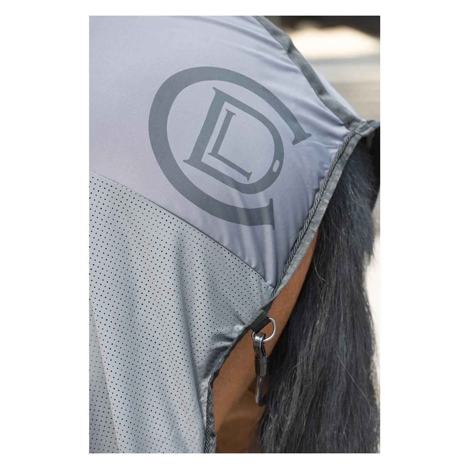 Die Decke verfügt über einen Sattelausschnitt für Englischsättel, Klettverschluss am Widerrist, Schweifriemen sowie eine umlaufende Kordel und das markentypische Emblem hinten links.