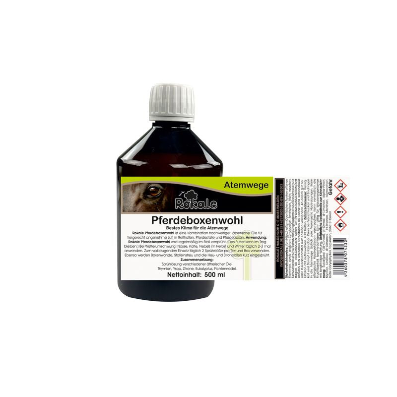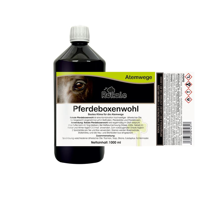 Rokale Pferdeboxenwohl ist ein hochwertiges Stallhygiene- und Lufthygieneprodukt zur Verbesserung der Luftqualität in Pferdeställen und Reithallen. Es sorgt für angenehm frisch duftende Luft, stabilisiert die Luftverhältnisse bei plötzlichen Wetterumschwüngen und schafft ein wohltuendes Stallklima für Mensch und Pferd. Besonders in den Übergangszeiten im Frühjahr und Herbst sowie bei feucht-kaltem Wetter im Herbst und Winter trägt Rokale Pferdeboxenwohl zu einer spürbaren Entlastung der Atemluft bei.