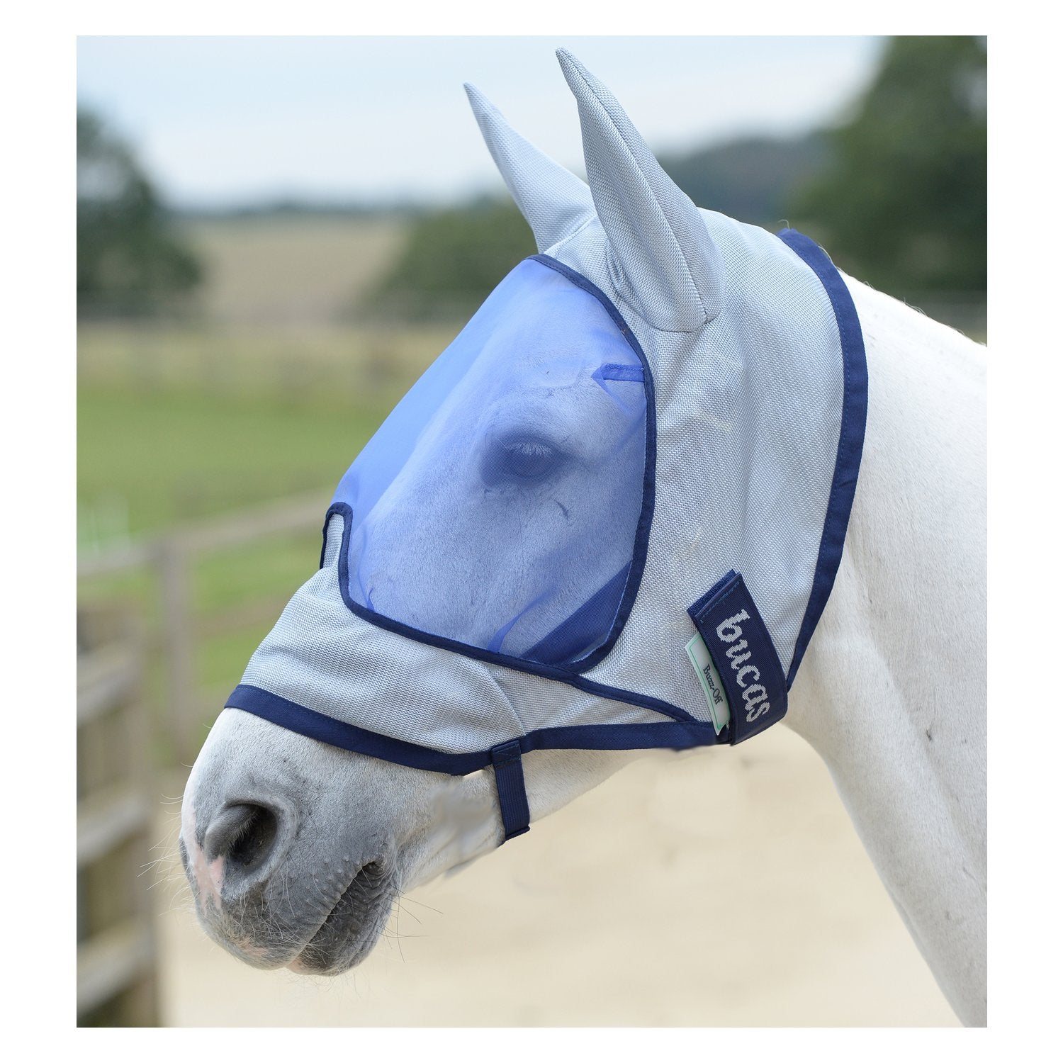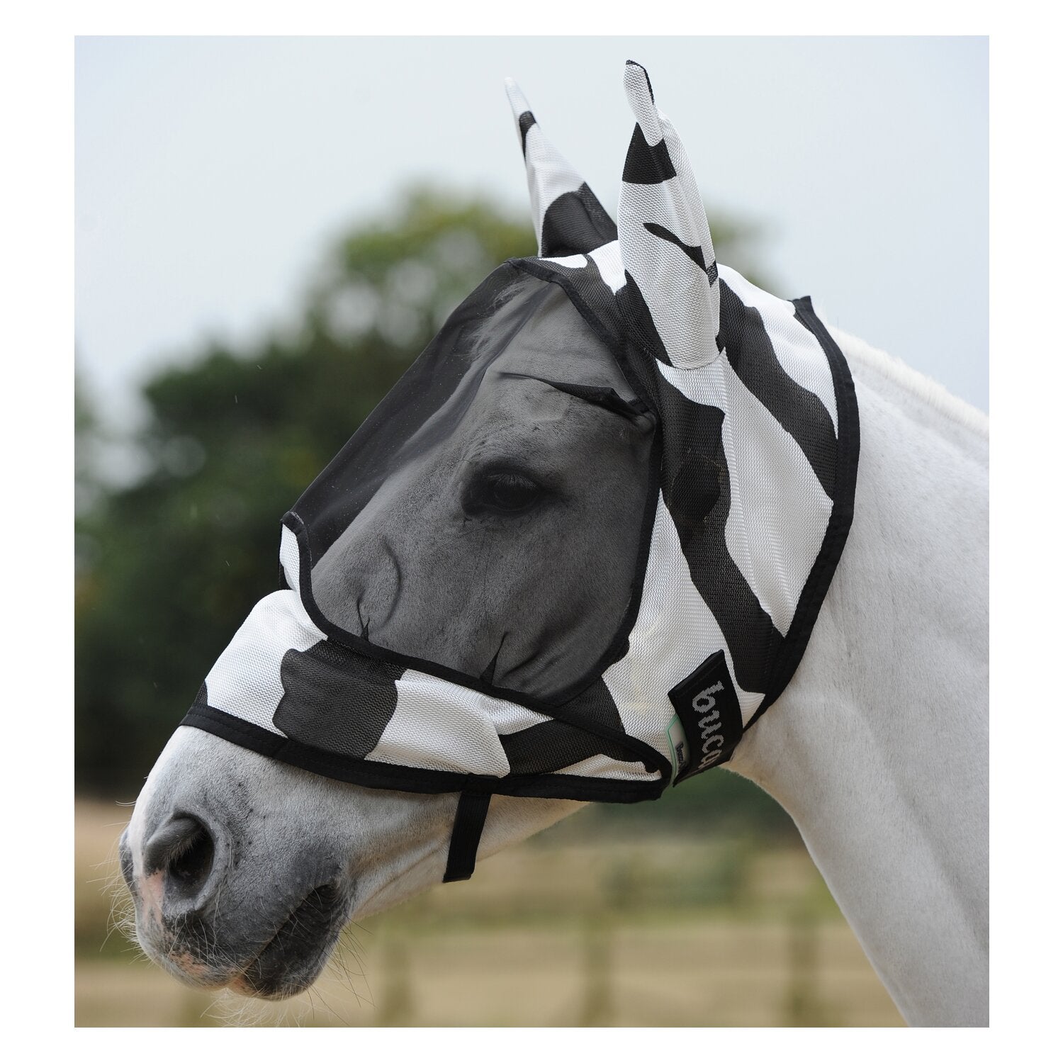 Die Buzz-Off Deluxe-Maske mit Ohrenschutz besteht aus einem speziell entwickelten, leichten Mesh-Material, das kleinste Plagegeister abhält und vor Sonneneinstrahlung schützt. Verstärkte Abnäher halten den Netzstoff von den Augen des Pferdes fern. Für einen sicheren Halt ist die Maske mit einem breiten, elastischen Genickband, Klettverschluss und einem schmalen Magnetriemen ausgestattet.