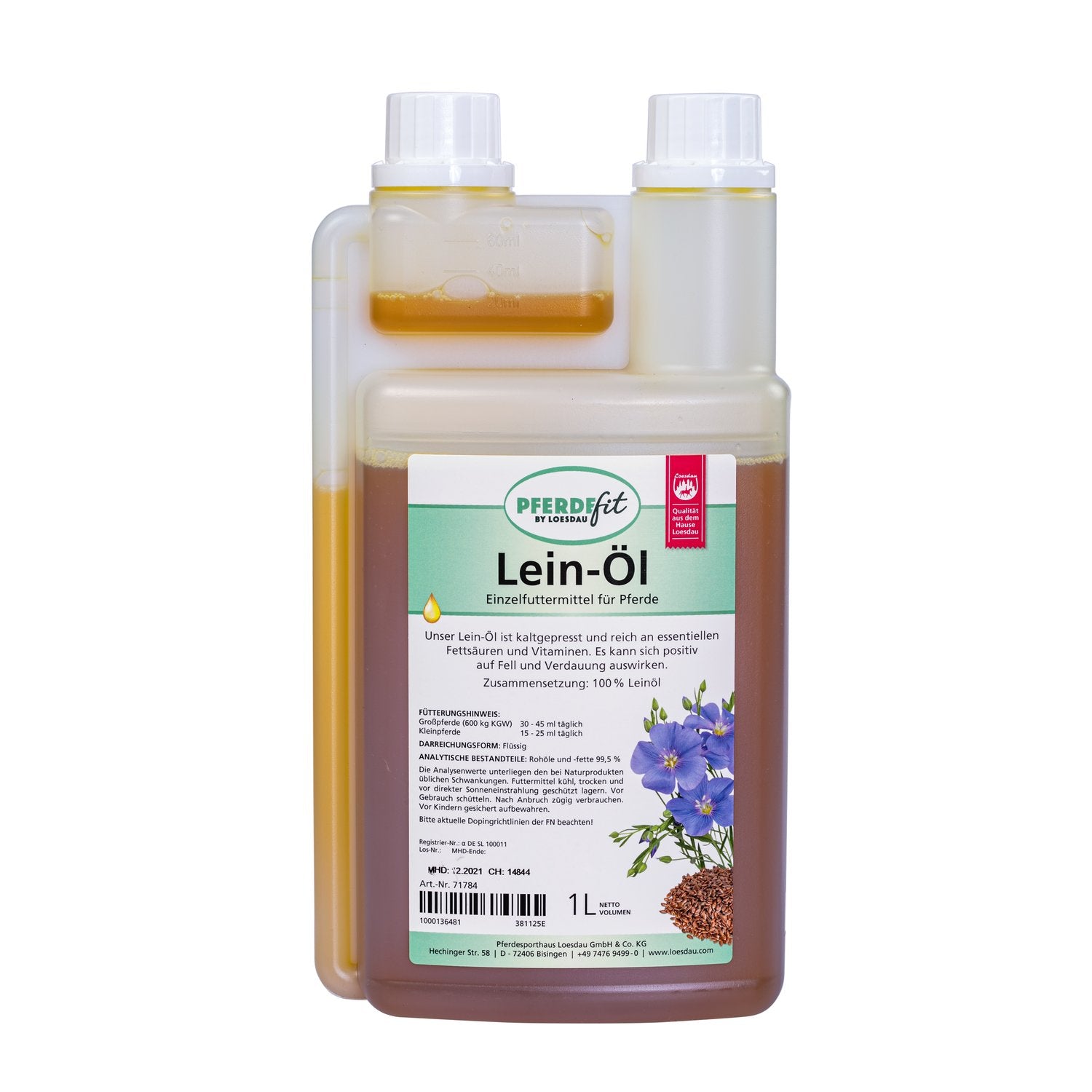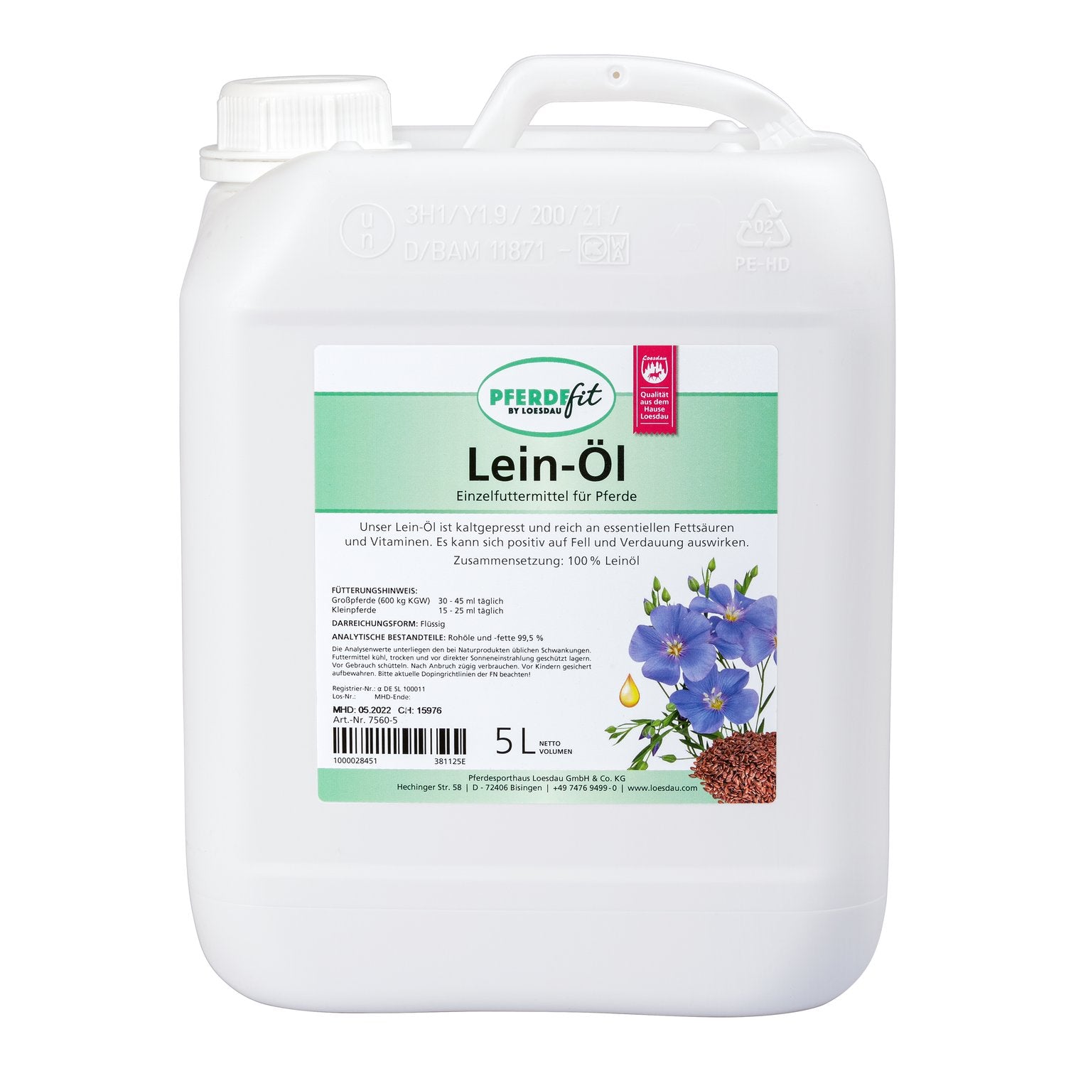 Einzelfuttermittel für Pferde. Das Lein-Öl ist kaltgepresst und reich an essentiellen Fettsäuren und Vitaminen. Es kann sich positiv auf Fell und Verdauung auswirken.