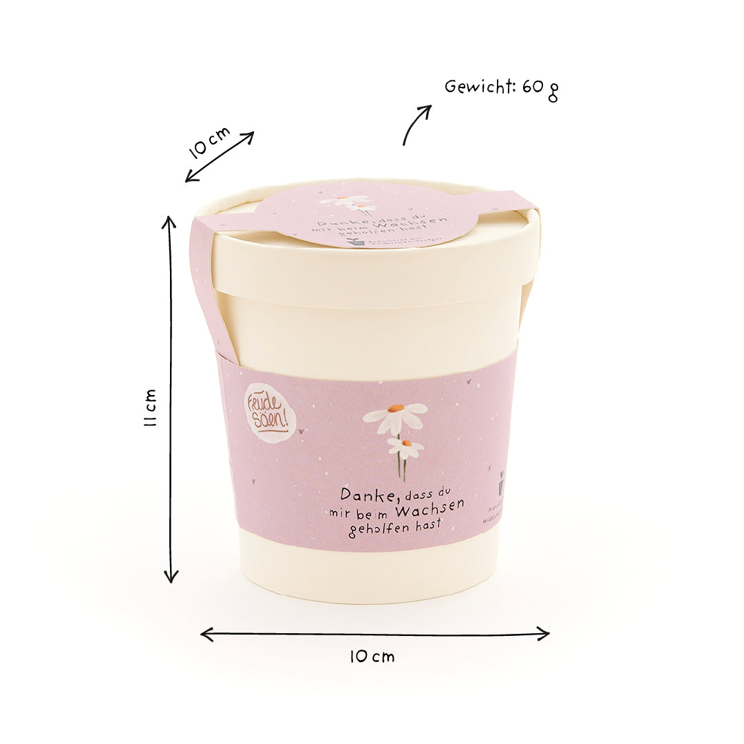 Ein Blütengruß voller Wertschätzung: Dieses besondere Anzuchtset für Wildblumen ist eine liebevolle Geste an Menschen, die uns begleitet, unterstützt und inspiriert haben. Der charmant gestaltete Becher mit der Aufschrift „Danke, dass du mir beim Wachsen geholfen hast“ sagt auf blühende Weise: Du warst wichtig für mich. Alles drin für eine bunte Wildblumenwiese: Das Set enthält Wildblumen-Saatgut, eine Kokos-Quelltablette, einen Anzuchtbecher und eine Anleitung. In nur wenigen Schritten wächst aus dem Set ein farbenfroher Blütengruß – auf der Fensterbank, im Büro oder auf dem Balkon. Ein liebevolles Geschenk zum Abschied: Ideal als Dankeschön für Lehrer, Erzieher, Mentorinnen, Kolleginnen, Eltern oder Freunde – dieser Becher eignet sich perfekt für Abschiede, Abschlüsse, Geburtstage oder einfach als stille Anerkennung für Menschen, die einen wachsen lassen. Nachhaltig: Der Anzuchtbecher besteht aus umweltfreundlichem Material, die Verpackung ist plastikfrei. Ein kleines Geschenk, das blühende Spuren hinterlässt – im Herzen und in der Natur.