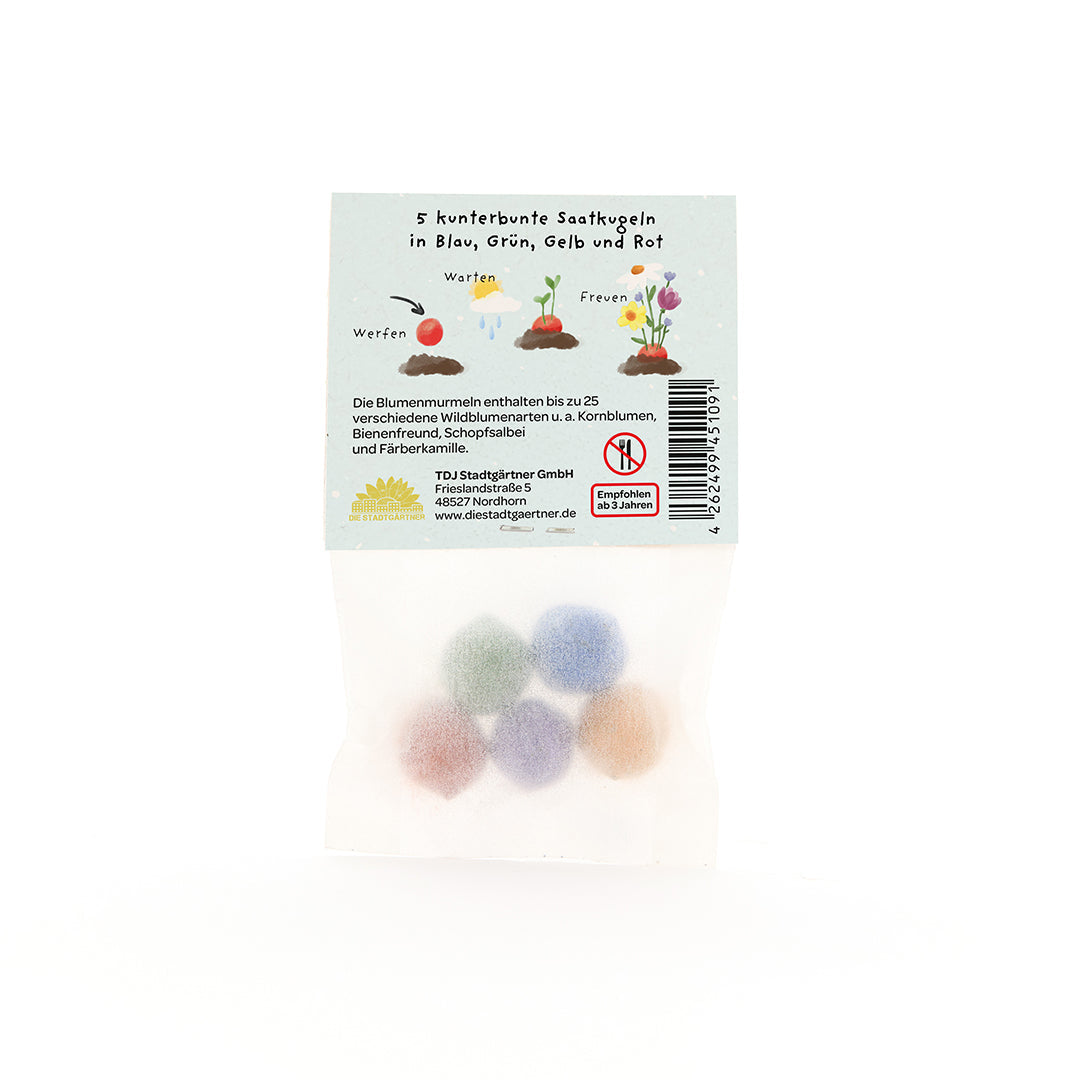 5 Blumenmurmeln im Tütchen "Hat die Blume einen Knick, war die Hummel wohl zu dick"