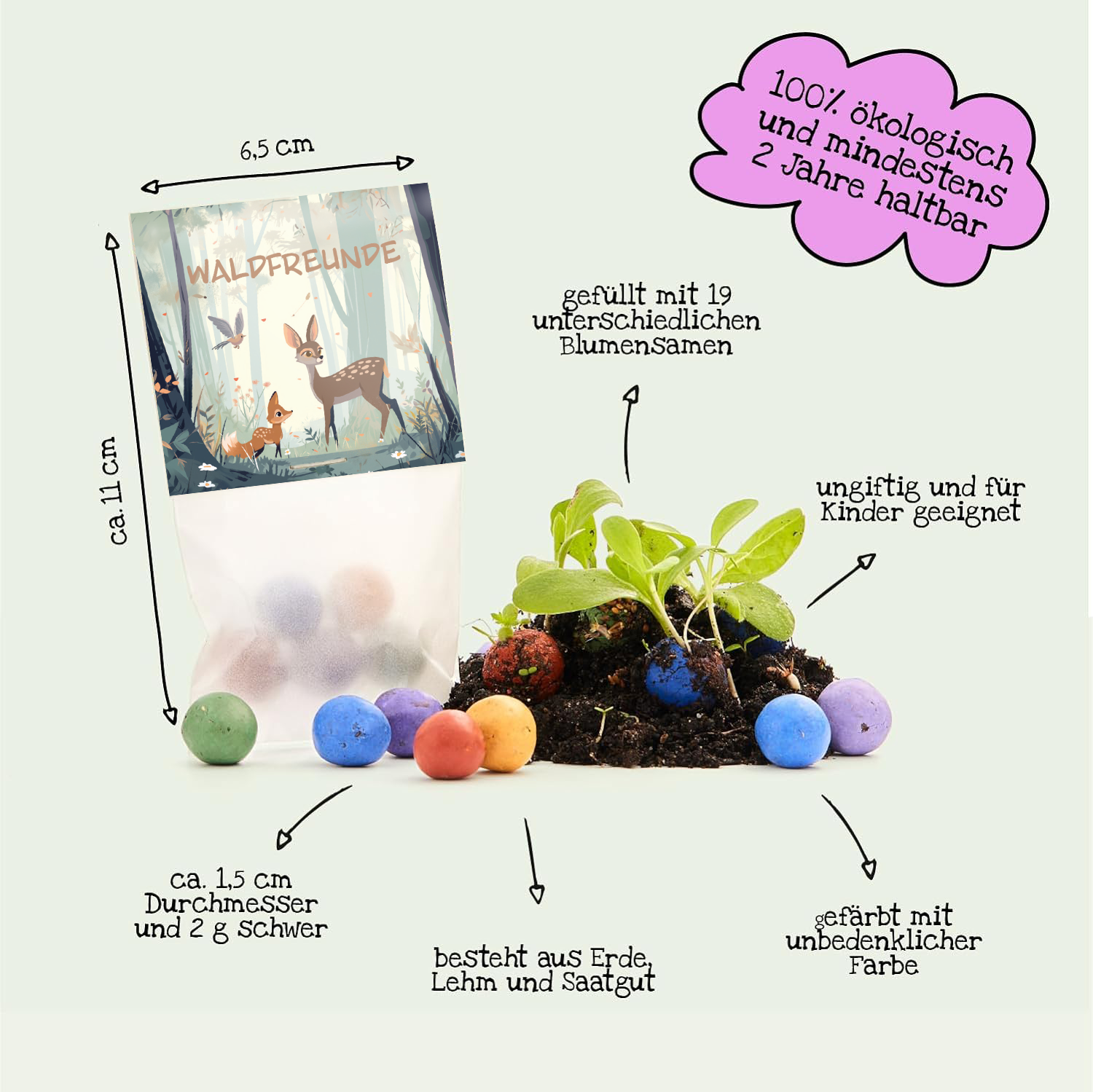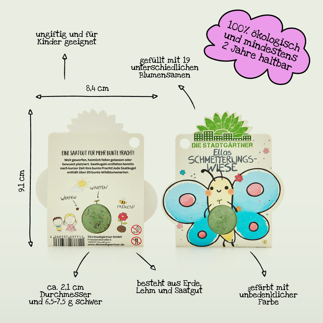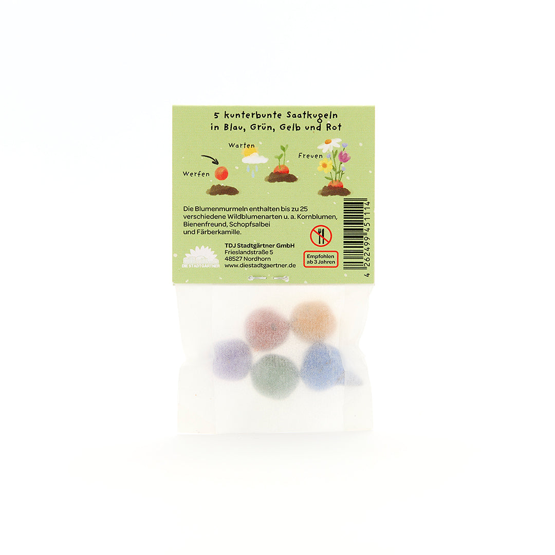 100 % natürlich: Die Blumenmurmel ist mit natürlichen Farben gefärbt und somit vollkommen ungefährlich für Kinder. Beim Saatgut handelt es sich um ungiftige Wildblumen.