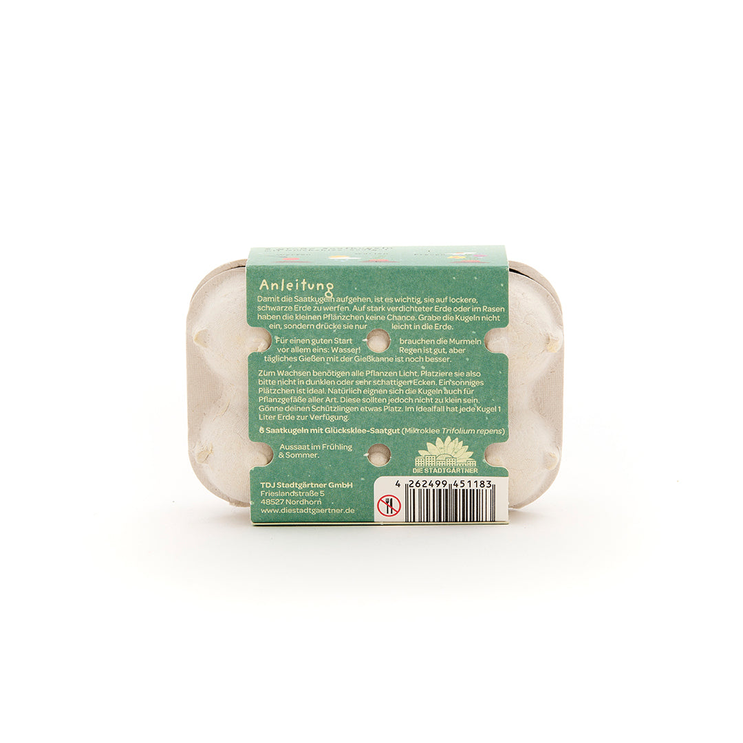 Glück verschenken leicht gemacht: Die 6 grünen Blumenmurmeln im Mini-Eierkarton enthalten Glücksklee-Saatgut – eine originelle Geschenkidee für alle, denen man Glück wünschen möchte. Grüne Murmeln, grüner Daumen: Einfach einpflanzen, gießen und freuen: Aus den Samenbomben wächst dekorativer Glücksklee heran – perfekt für Balkon, Garten oder Blumentopf. Glücksbringer mal anders: Mit diesem Glücksbringer kann der Beschenkte das Glück im wahrsten Sinne des Wortes wachsen lassen. Eine besondere und nachhaltige Geschenkidee, um jemandem "viel Gück" zu wünschen. Perfekt als Glücksbringer für jeden Anlass: Ob als Glücksbringer zum Abi, für eine Operation, als Mutmacher, vor der Fahrprüfung oder einfach als kleines Geschenk zwischendurch – die grünen Saatkugeln eignen sich ideal als vielseitiges Geschenk, um jemandem Glück zu wünschen.