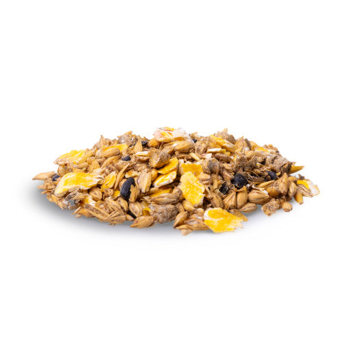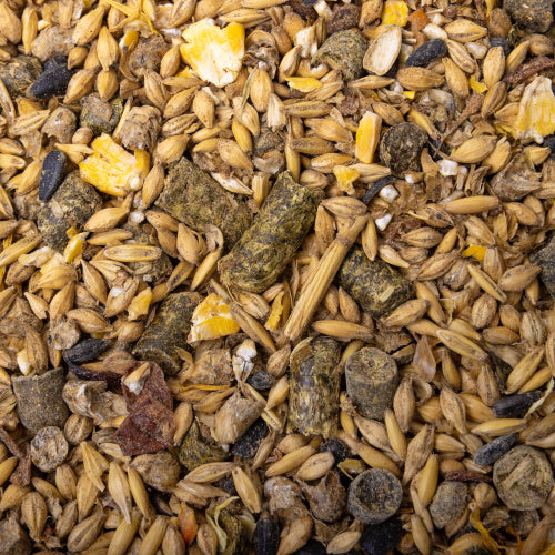 Bio-Gerste (getoastet, gewalzt), Bio-Heucobs, Bio-Hafer, Bio-Haferschälkleiepellets, Bio-Maisflocken, Bio-Sonnenblumenkerne, Bio-Zuckerrübenmelasse, Bio-Leinkuchen, Bio-Apfeltrester, Calciumcarbonat, Monocalciumphosphat, Bio-Leinöl, Natriumchlorid (Salz), Bio-Topinambur (fermentiert), Bio-Rote-Bete (getrocknet), Bio-Ringelblüten (getrocknet), Bio-Hagebutte (getrocknet)