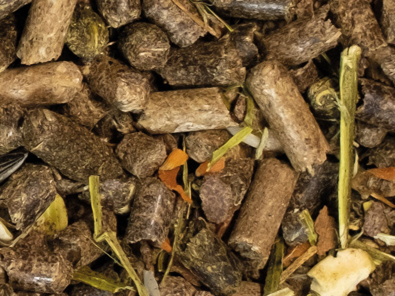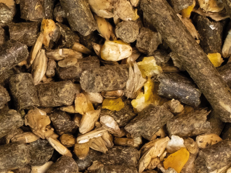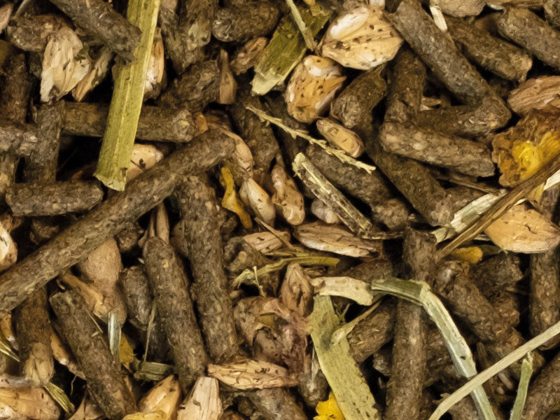 - hat einen hohen natürlichen Fettgehalt (mit Sonnenblumenkernen, Reiskleie und Leinkuchen)